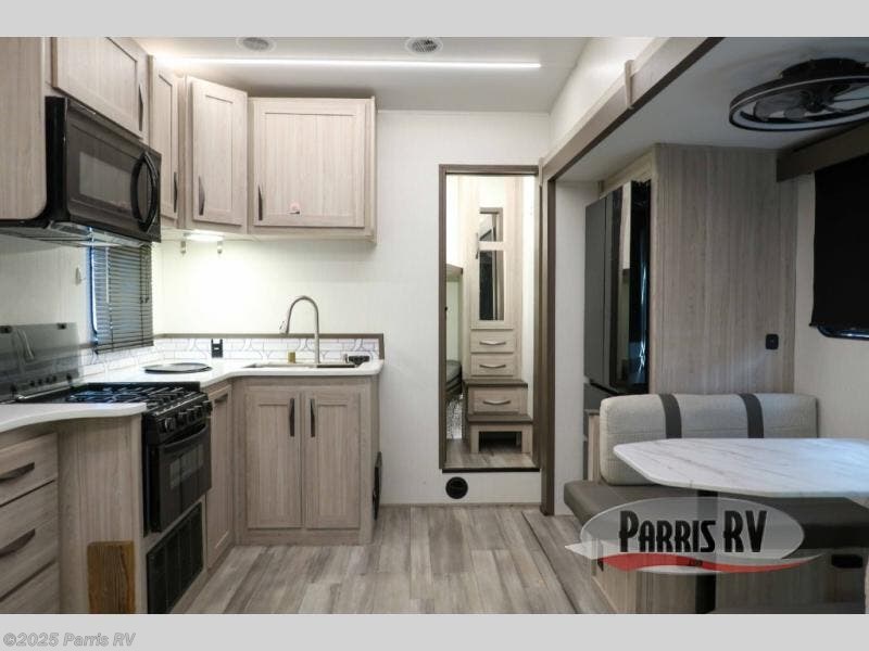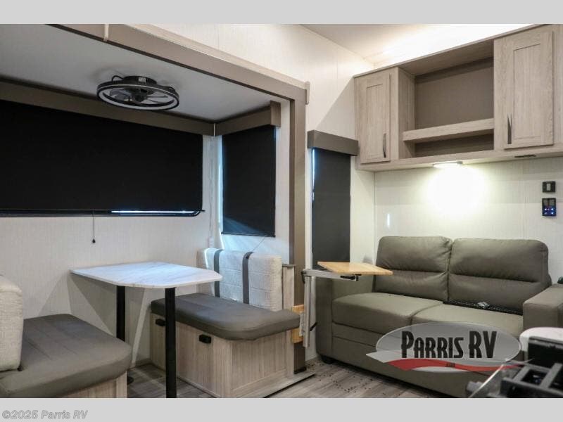 You and your family will have a great time camping in this fifth wheel! The front private bedroom has a queen bed with a pillow top mattress and under bed storage, plus an area prepped for a washer and dryer so you could have clean clothes throughout your entire trip. Freshen up each morning in the full bathroom with the upgraded shower surround then head to the fully equipped kitchen to whip up some eggs on the three burner cooktop and enjoy a cold cup of orange juice stored in the 16.2 cu. ft. 12V four door refrigerator. You even have an air fryer oven for quick meals and an outside refrigerator to enjoy a cold beverage while relaxing under the 20' awning. Your meals can be eaten at the 42" booth dinette inside and your belly can settle as you relax on the tri-fold sofa across before heading back outside to enjoy an evening under the stars!