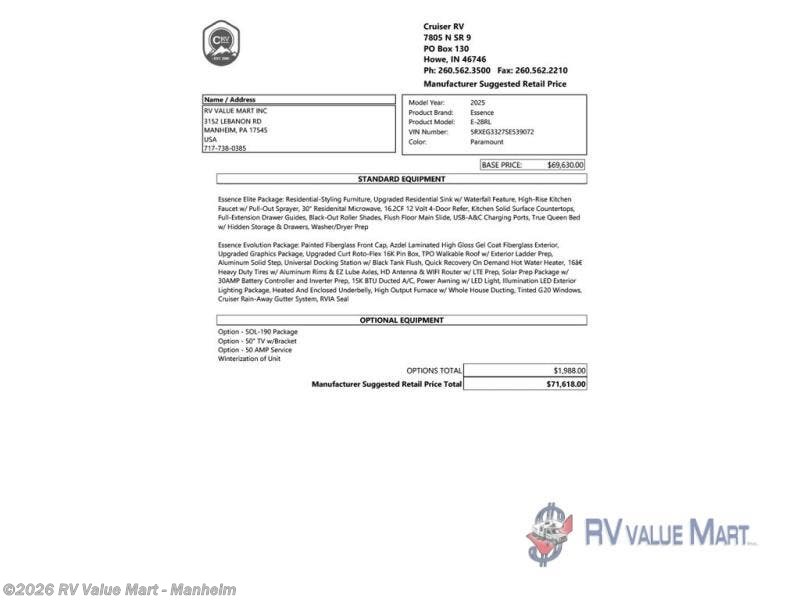 Request More Info on this 2025 Cruiser RV Essence E-28RL Offered for sale by RV Value Mart - Manheim