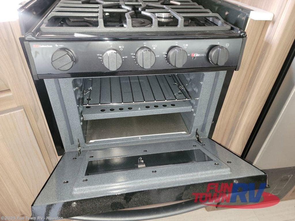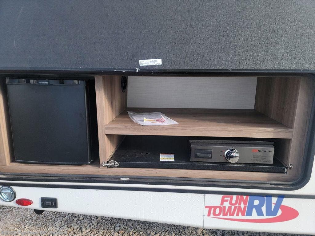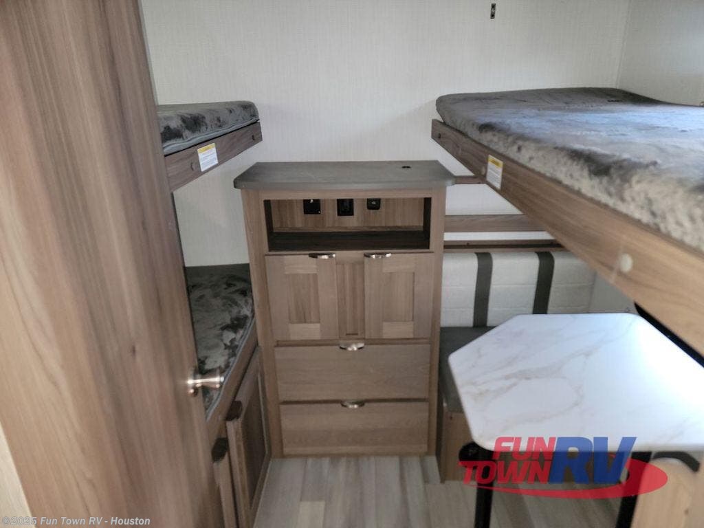 Everyone is going to love this travel trailer with a private bunkhouse! There are triple bunk beds, plus a dinette under one bunk for the kids or your friends to enjoy their own privacy, sleeping space and sitting area. You'll appreciate having your own front private bedroom with a king bed sliding system, and there is a booth dinette and sofa within the large slide out for more seating and sleeping space. Meals can be prepared on the three burner cooktop indoors, or outdoors on the outside griddle. This model also includes a full belly storage system to bring along hiking and fishing gear, and a patio awning for protection from the elements.