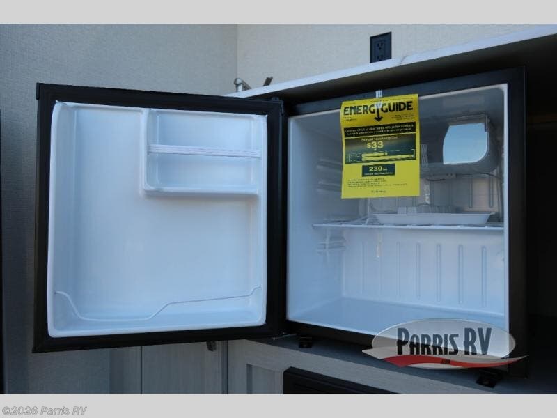 Camping just got a whole lot sweeter in this travel trailer with a rear ramp door and available/optional patio kit! There is a slide out for more interior space, and here you'll find the 70" sofa, 12V refrigerator, and pantry for snacks. There is ample counter space to prep meals, and the full bath will let you freshen up after a day outdoors. When you're ready for some shut-eye, the queen bed up front will provide a great night's rest, and there are dual bedside wardrobes to keep your things organized plus a privacy curtain if you have guests staying over on the sofa.