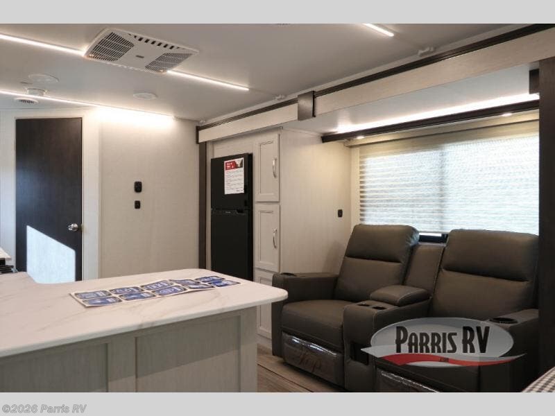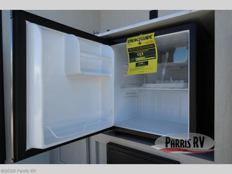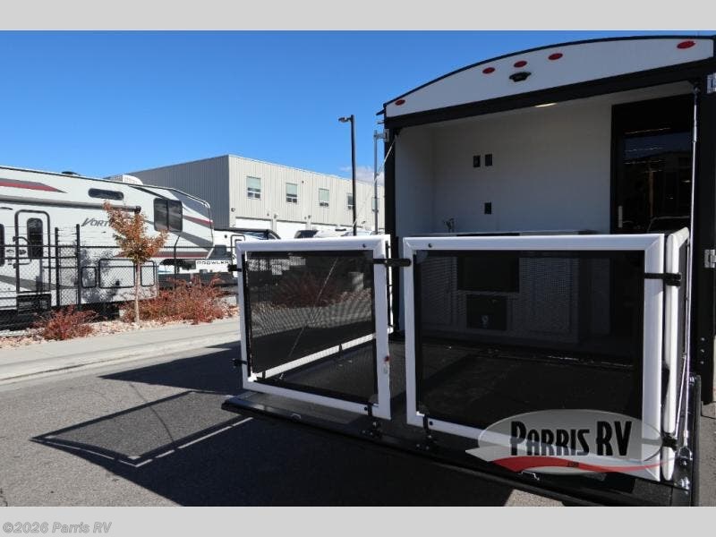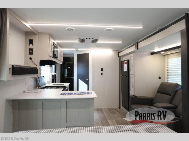 Camping just got a whole lot sweeter in this travel trailer with a rear ramp door and available/optional patio kit! There is a slide out for more interior space, and here you'll find the 70" sofa, 12V refrigerator, and pantry for snacks. There is ample counter space to prep meals, and the full bath will let you freshen up after a day outdoors. When you're ready for some shut-eye, the queen bed up front will provide a great night's rest, and there are dual bedside wardrobes to keep your things organized plus a privacy curtain if you have guests staying over on the sofa.