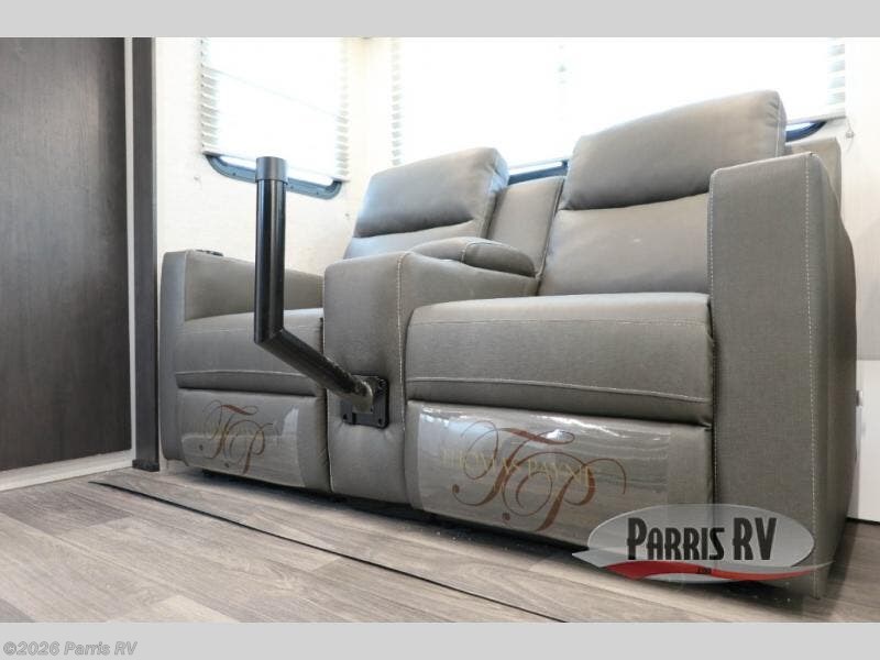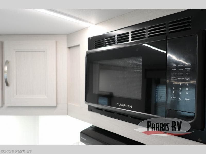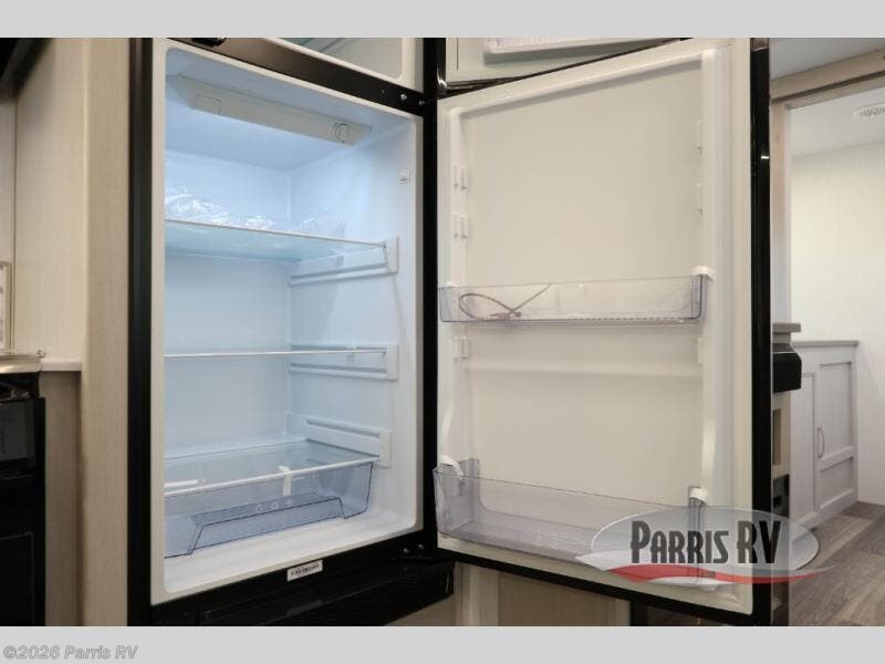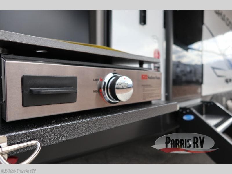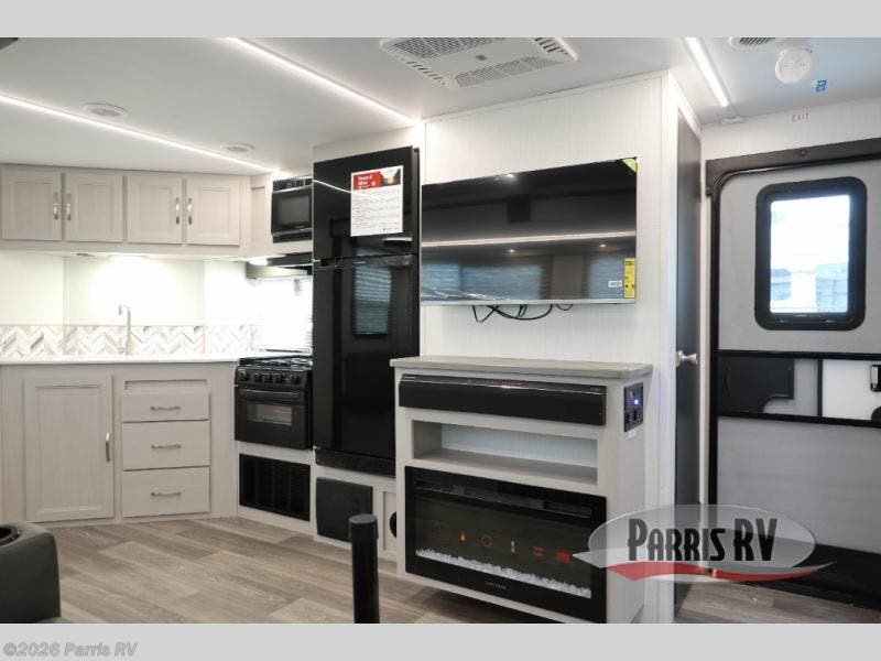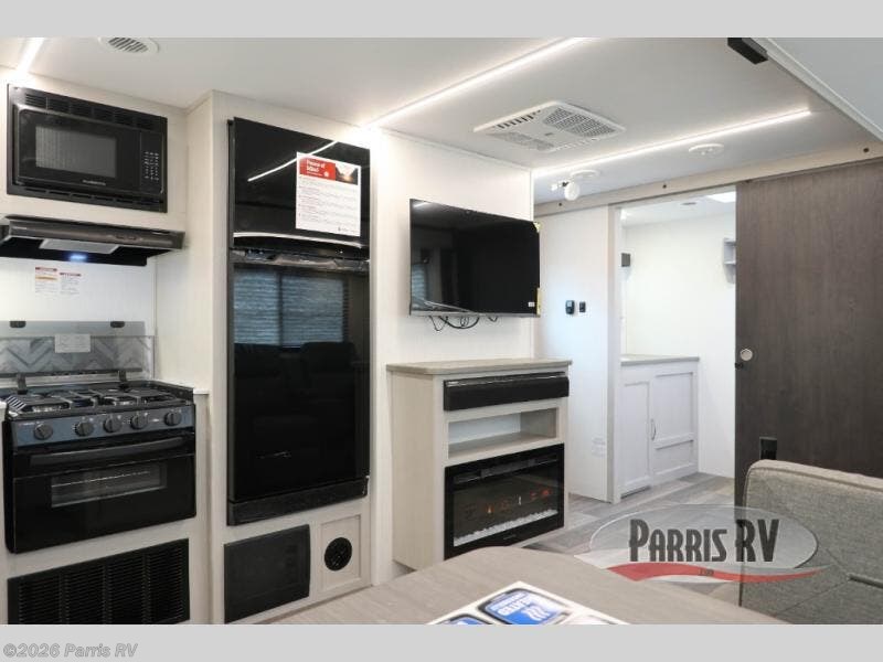 Camping just got a whole lot sweeter in this travel trailer! There is a large slide out for more interior space, and here you'll find the sofa and booth dinette across from the entertainment center with TV prep and a fireplace to make it feel more like home. The kitchen includes a three burner range and microwave oven to make meals each day, or you can head outdoors to cook on the outdoor kitchen with a griddle. When you're ready for some shut-eye, the queen bed up front will provide a great night's rest, and there are dual bedside wardrobes to keep your things organized.