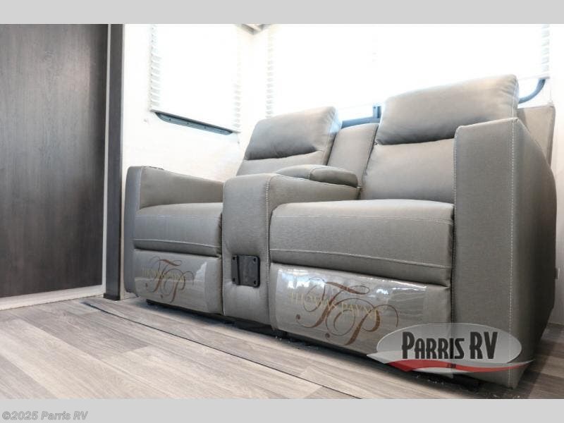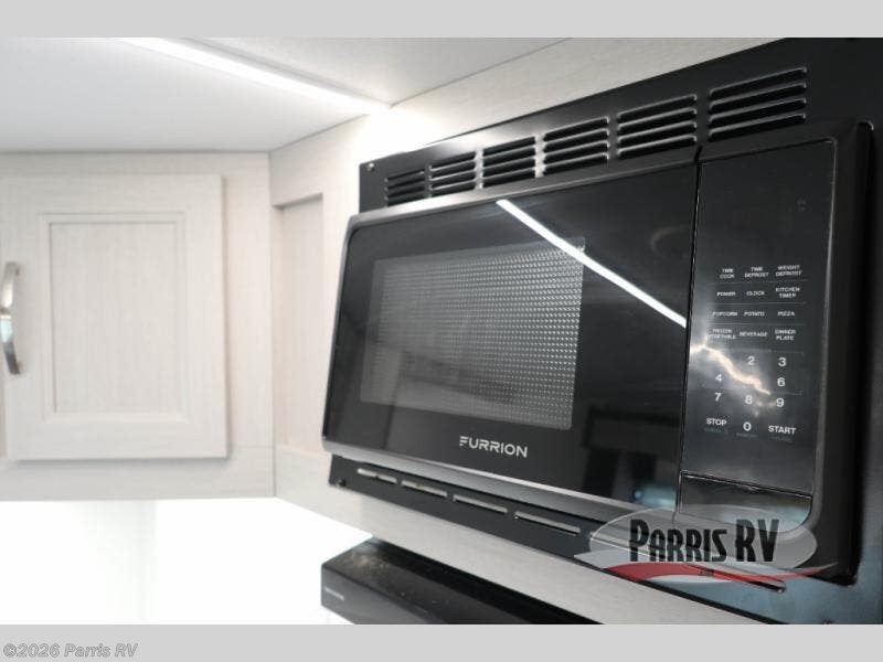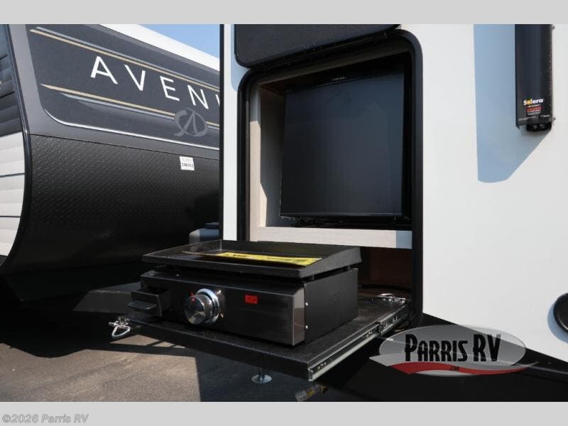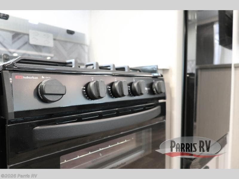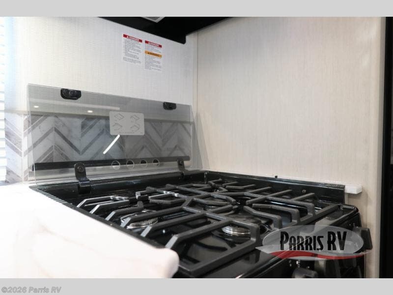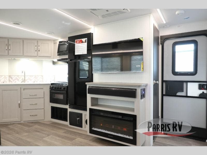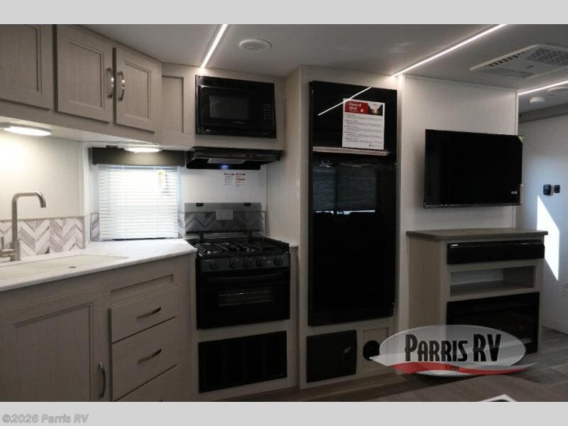 Camping just got a whole lot sweeter in this travel trailer! There is a large slide out for more interior space, and here you'll find the sofa and booth dinette across from the entertainment center with TV prep and a fireplace to make it feel more like home. The kitchen includes a three burner range and microwave oven to make meals each day, or you can head outdoors to cook on the outdoor kitchen with a griddle. When you're ready for some shut-eye, the queen bed up front will provide a great night's rest, and there are dual bedside wardrobes to keep your things organized.