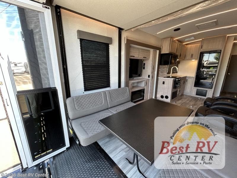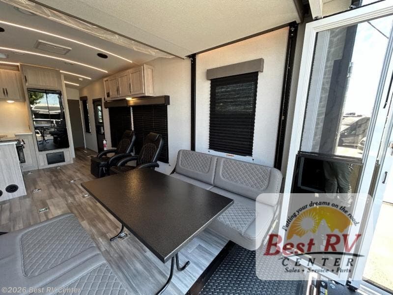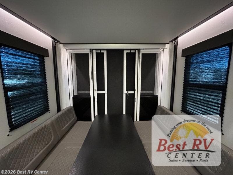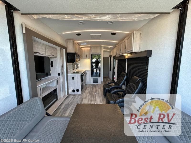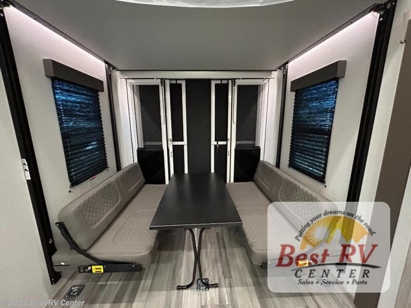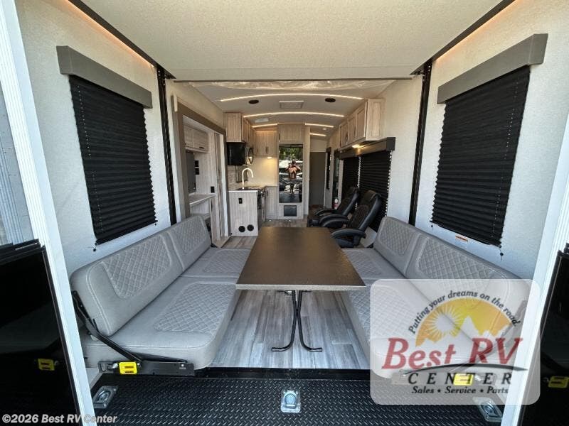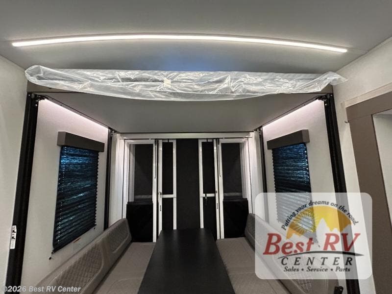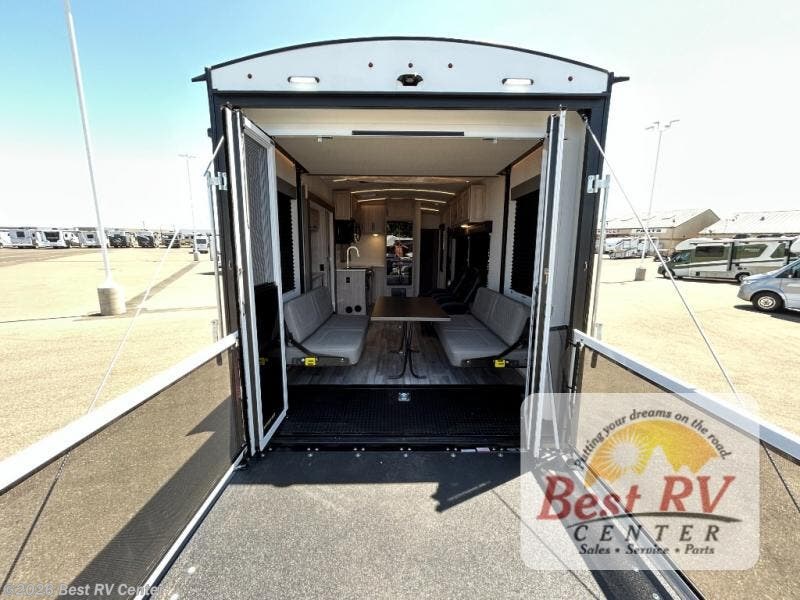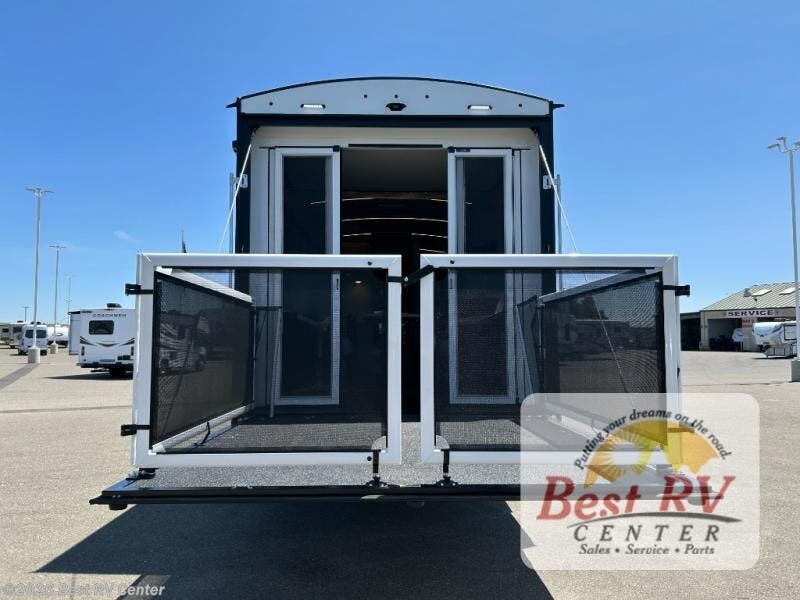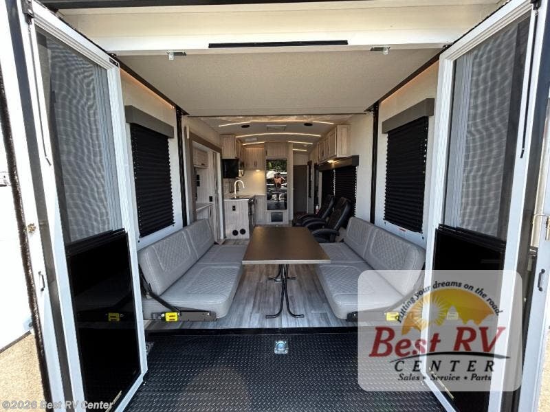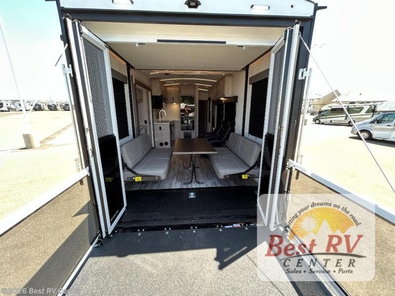 - Toy Hauler Enhancement Package: Seamless Edge Kitchen Countertops, Barreled Ceiling, LED Batton Strip Lighting w/ Dimmer, Control Panel with Lighted Switches, Battery Disconnect, Euro Recliner Chair(s) & Bay Window (Most Open Concept Models), Tinted Safety Glass Windows, High Rise Faucet and Medicine Cabinet in Bathroom, Designer Box Valances, Night Shades, Roll-Up Rear Screen/Window, 17" Oven, 10.7 Cu Ft 12V Refrigerator, Indoor/Outdoor Table, Rear Ramp Patio with Folding Rails