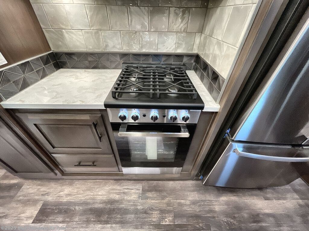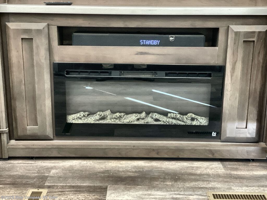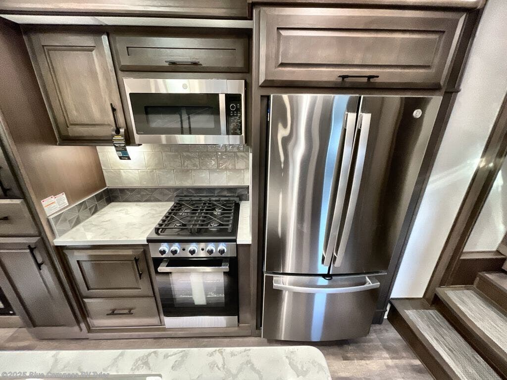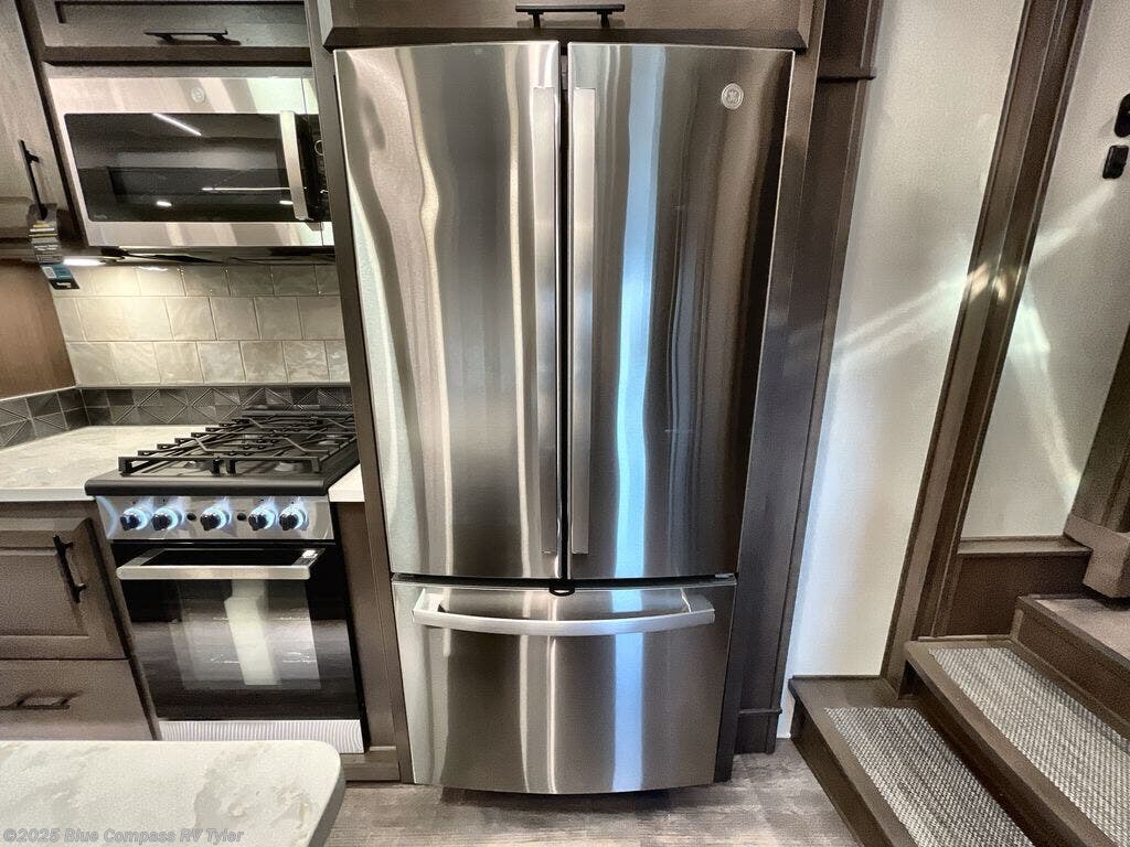 Triple slides for added space, a residential hide-a-bed sofa, and a spacious front bedroom make this fifth wheel family-friendly and ready to go! The chef of the family will have plenty of counter space to prep meals at the kitchen island, and leftovers can go in the residential stainless steel French door refrigerator. The kids can play a game at the dinette table with a hidden leaf extension if more want to join, or everyone can relax in front of the fireplace. The hardwood steps leading up to the full bath and front front private bedroom will make it feel more like home, and there is washer/dryer prep if you want the option to make laundry day easier. When it's finally time to catch some zzz's, you can sleep soundly on the slide out king bed, or choose the optional queen bed or optional Sleep Number bed by Select Comfort!