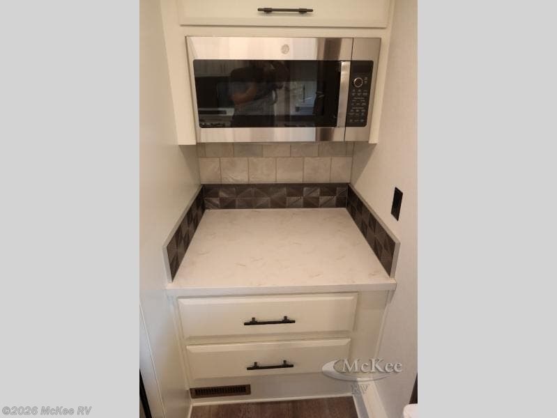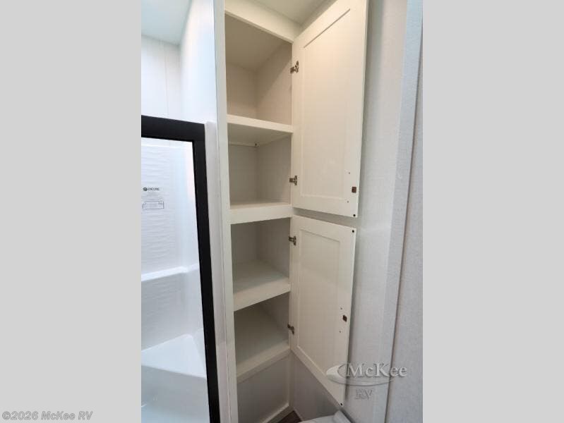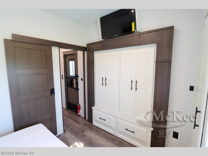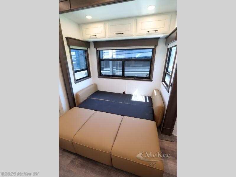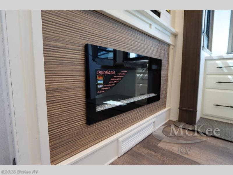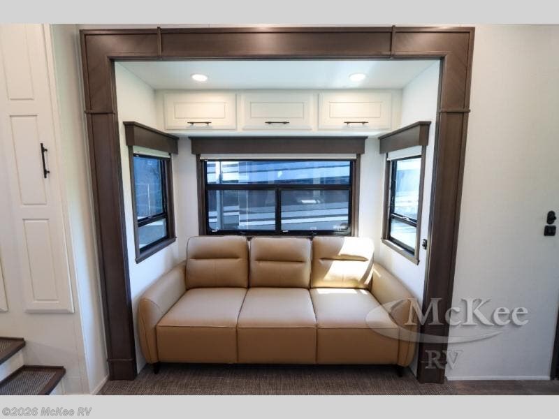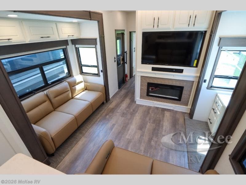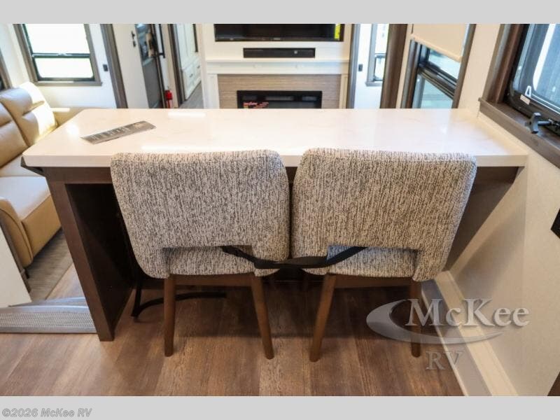Luxury abounds in this fifth wheel made for full-time living! Step inside and you'll be wowed by the large living area with two sofas and an entertainment center. The kids or your guests can make this area their bedroom at night, while you and your spouse claim the rear private bedroom all to yourselves. Here, you'll sleep soundly on the king bed slide out, and you'll find plenty of storage space, including a dresser for your clothes. You will love waking up in the morning and heading to the gourmet kitchen up front that includes a lighted pantry, dual slides for added space, plus a counter with chairs the kids will love. This model also includes its own designated closet with washer/dryer prep. The only thing missing in this fifth wheel is you!