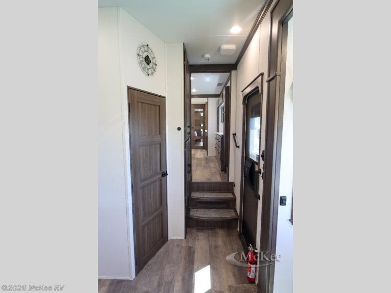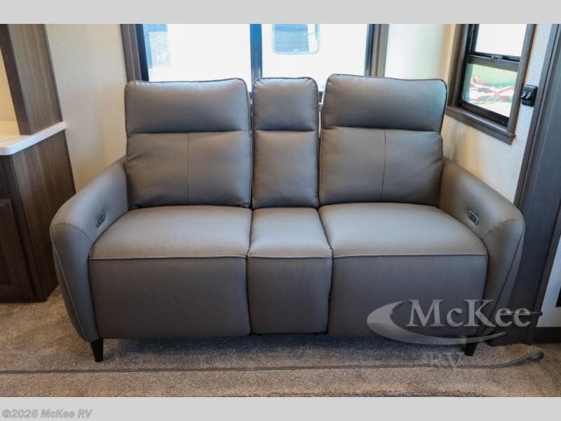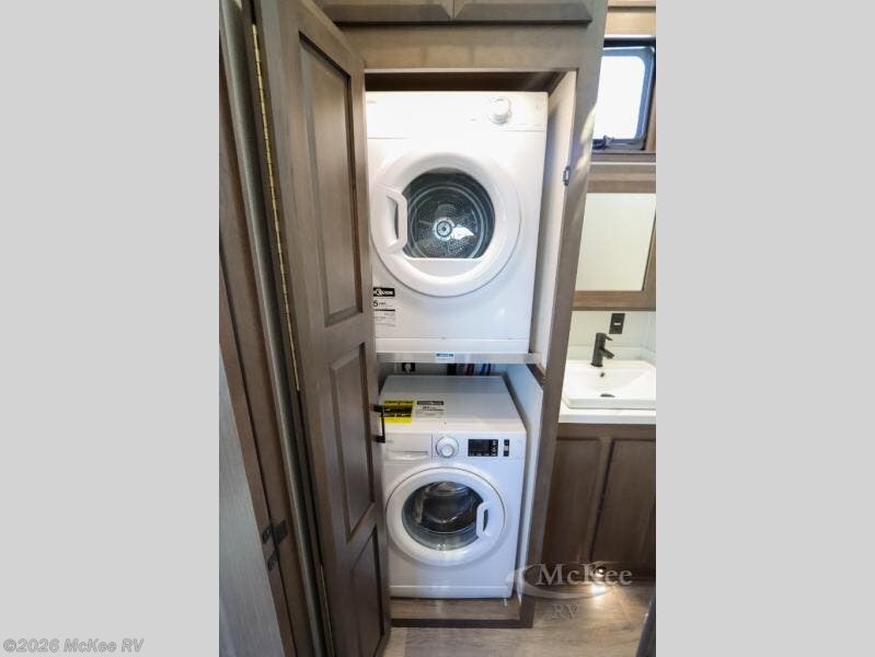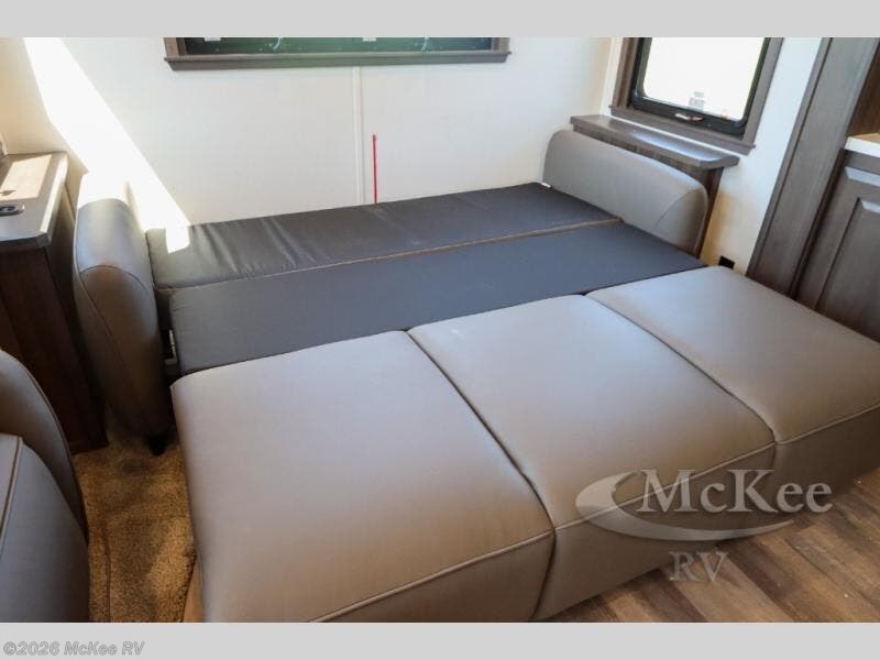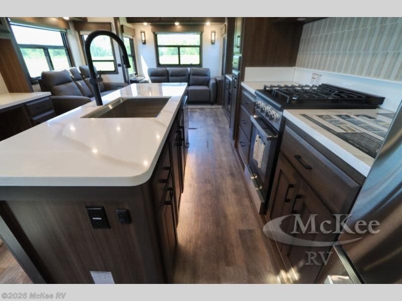 This couple's fifth wheel provides extra sleeping space on the residential sofa with a hide-a-bed in the main living and kitchen area. The entertainment center and fireplace will keep everyone entertained and cozy, and the gourmet kitchen will keep everyone fed. Your family and RV friends can use the half bath which even has washer/dryer prep if you want the option to make full-time living easier than ever, and you will have your own full bathroom up front with a large bath sink and custom closet after walking through your master bedroom.