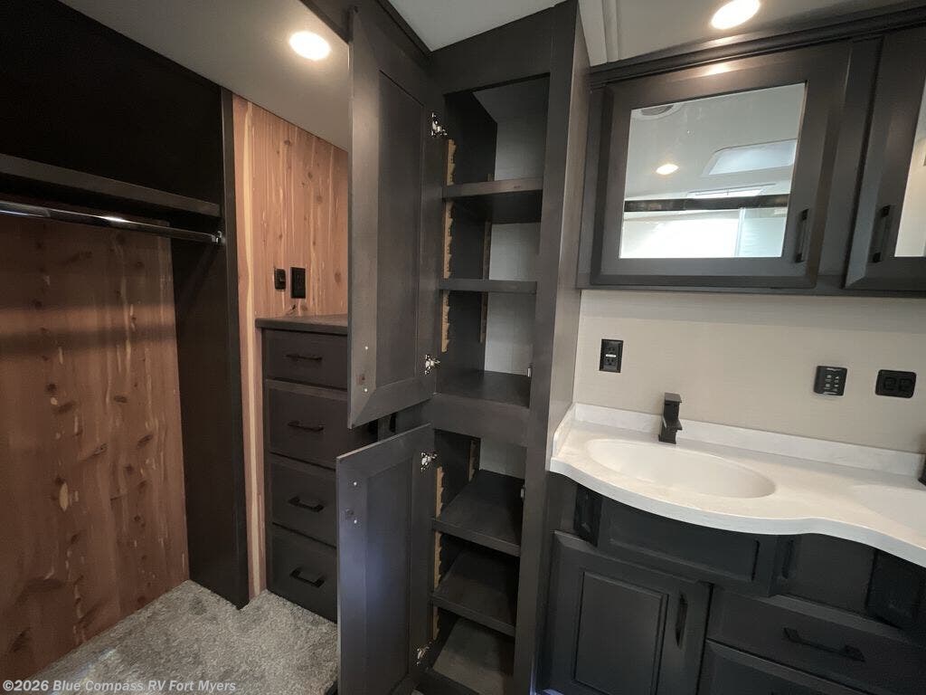 This couple's fifth wheel provides extra sleeping space on the residential sofa with a hide-a-bed in the main living and kitchen area. The entertainment center and fireplace will keep everyone entertained and cozy, and the gourmet kitchen will keep everyone fed. Your family and RV friends can use the half bath which even has washer/dryer prep if you want the option to make full-time living easier than ever, and you will have your own full bathroom up front with a large bath sink and custom closet after walking through your master bedroom.