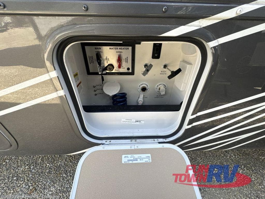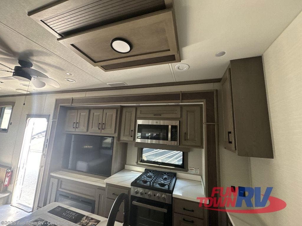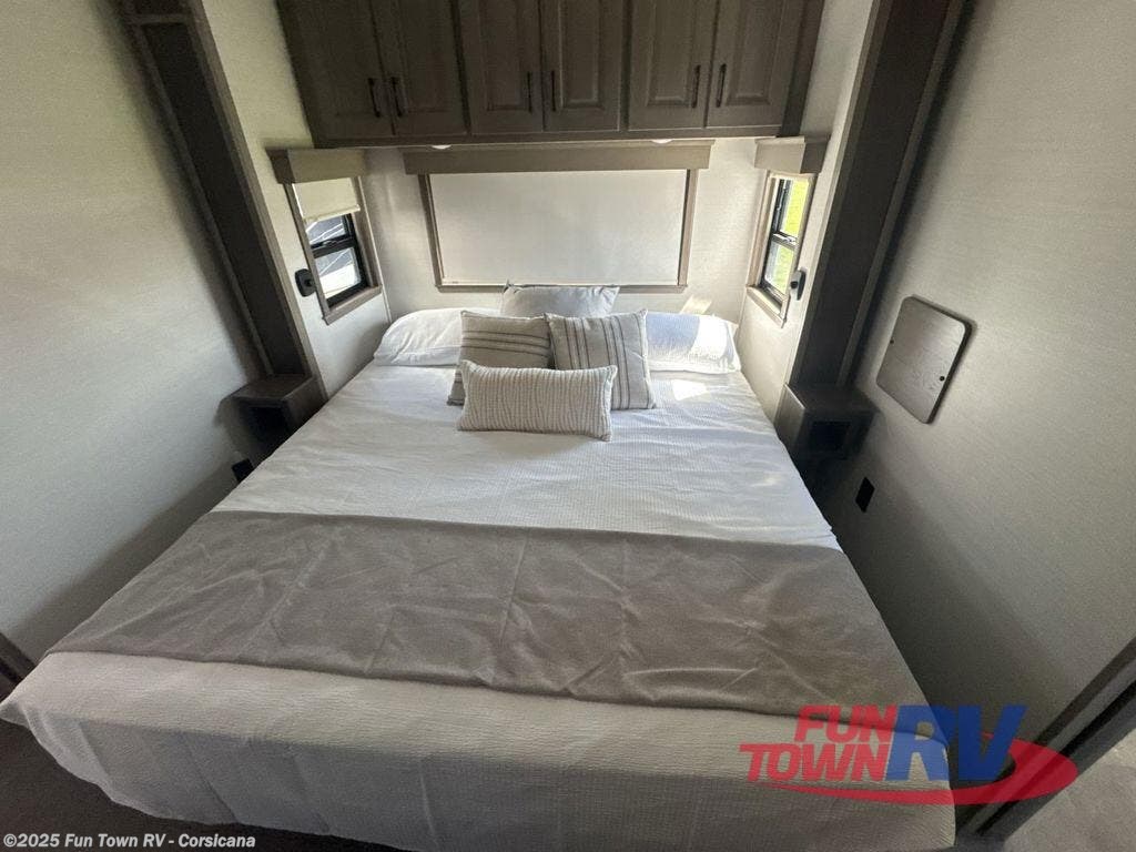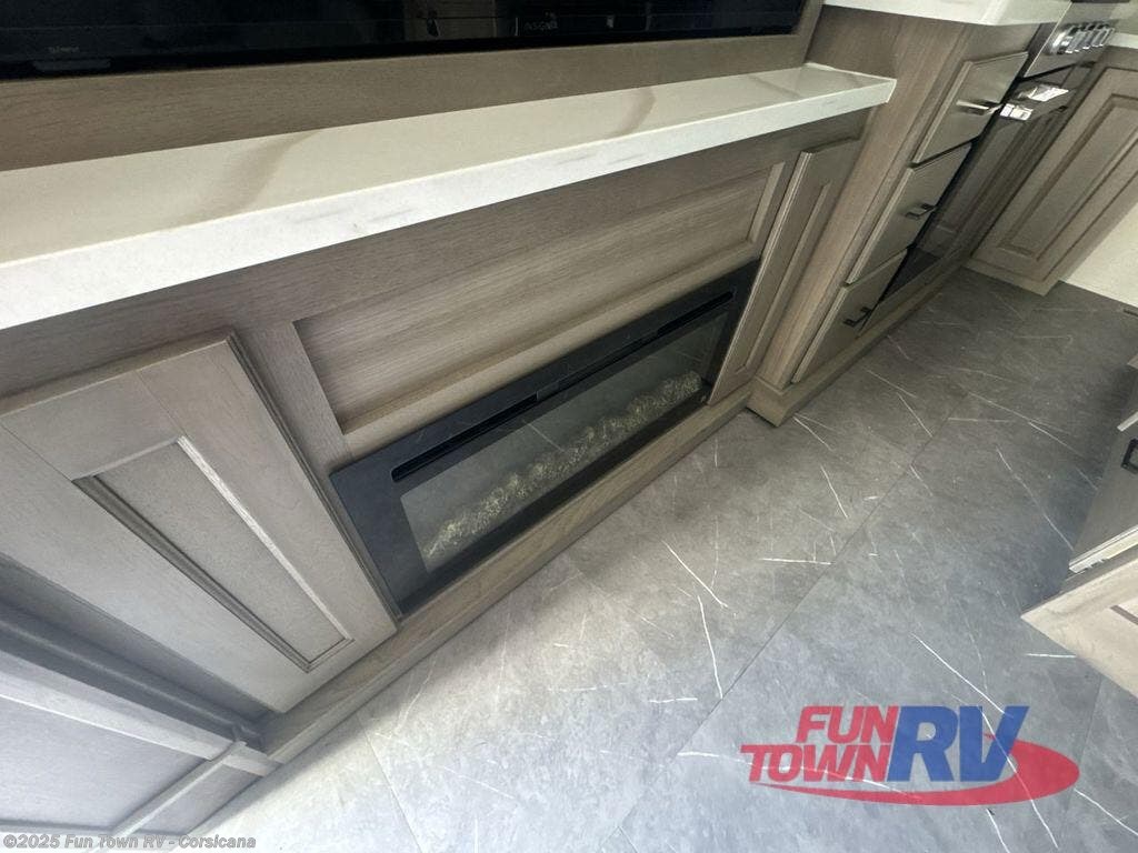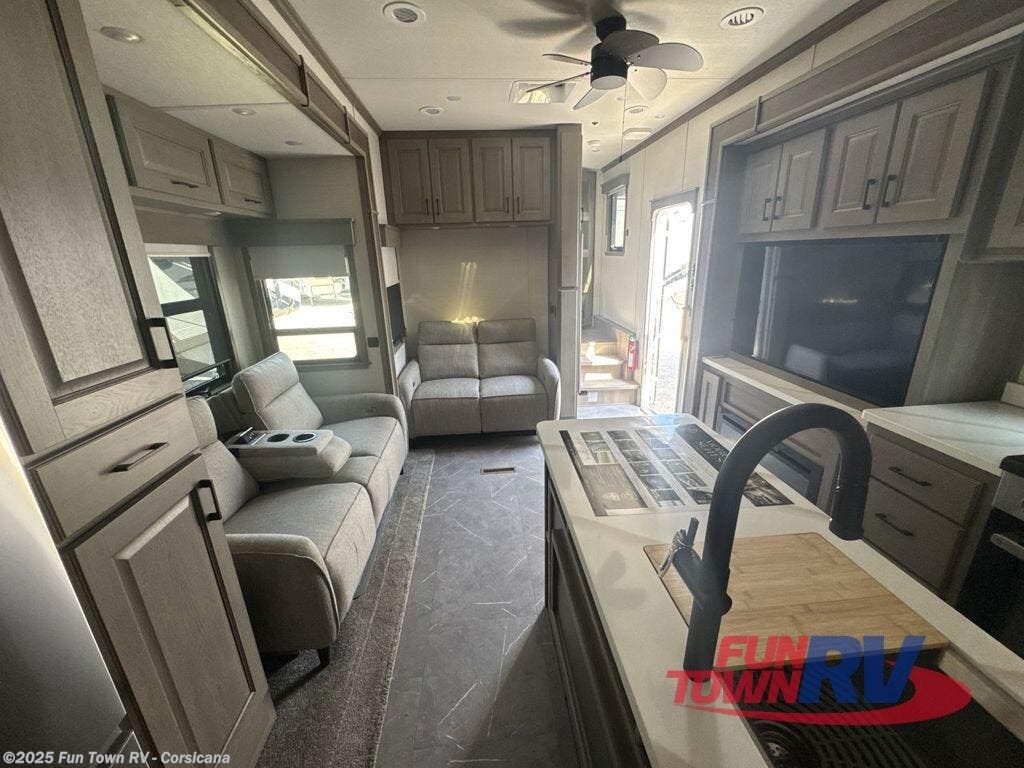 You'll be blown away by the amount of space you have in this fifth wheel thanks to the six slide outs! Enjoying time with loved ones in the main living area will feel just like home on the residential theater seating and residential hide-a-bed sofa, plus there is a fireplace to add to the coziness. The chef of your group will love the gourmet kitchen with a kitchen island, stainless steel appliances, plus a residential stainless steel French door refrigerator. A master suite will be waiting for you at the end of the day, and your guests will enjoy front private bedroom/den with a desk with two chairs and two slide out beds. This unit also includes two full baths for added convenience!