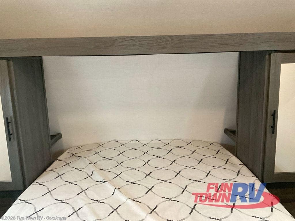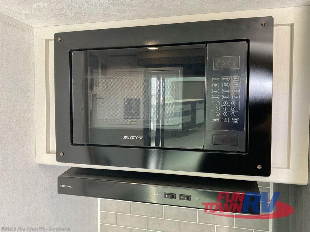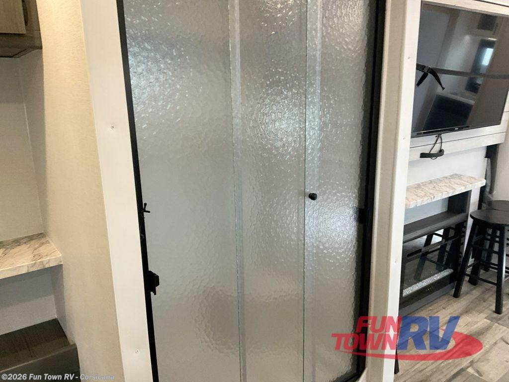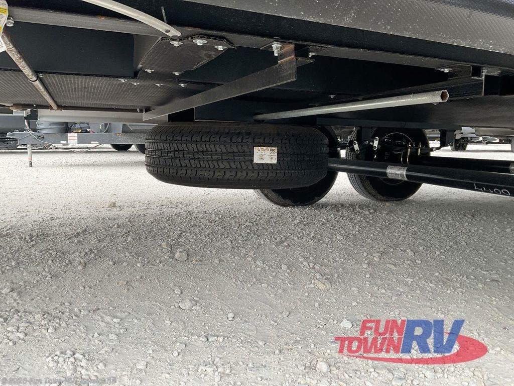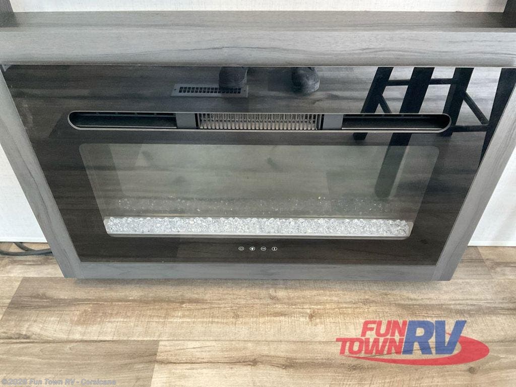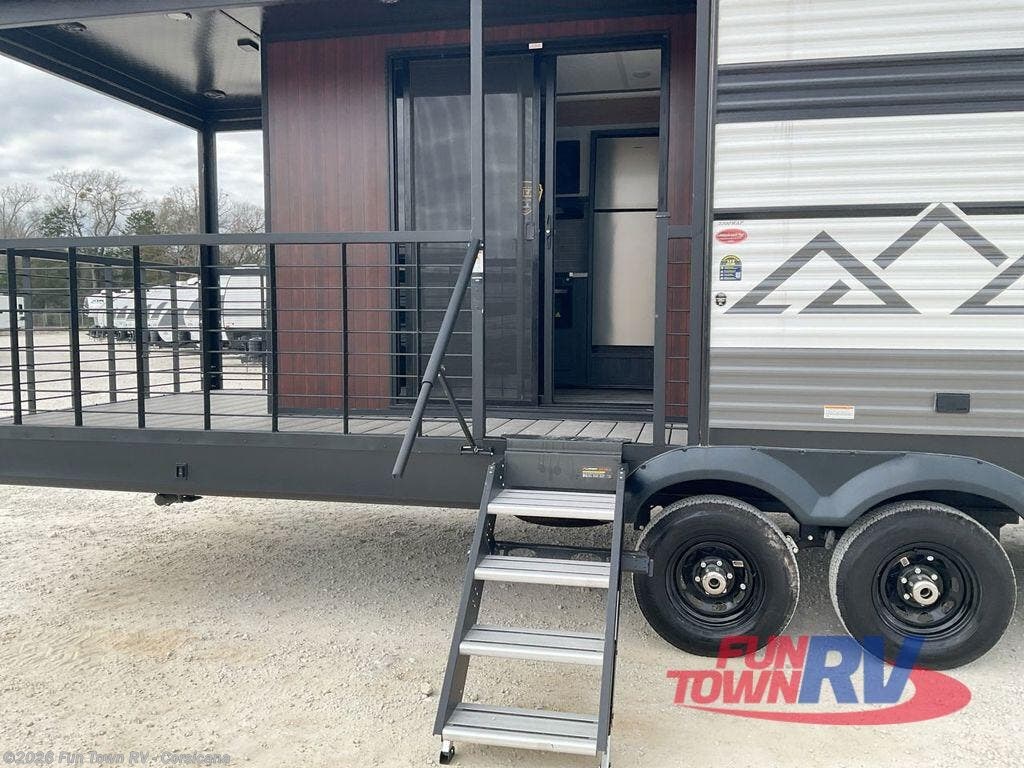 This unique travel trailer is one to remember! The rear wrap-around porch features ample space to entertain guests plus a peak-a-boo window with a fold-down bartop so those on the deck can visit with those inside. Once inside, you can relax on the theater seats with a flip top ottoman, and the fireplace will make this space more cozy. And check out the hidden Murphy bed behind the fireplace so guests can sleep over! A walk-thru bath is spacious so you can easily clean up each day, and the front master bedroom features a residential queen bed for all-around comfort.