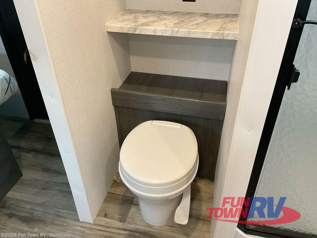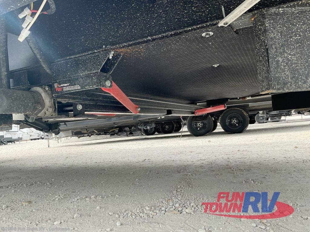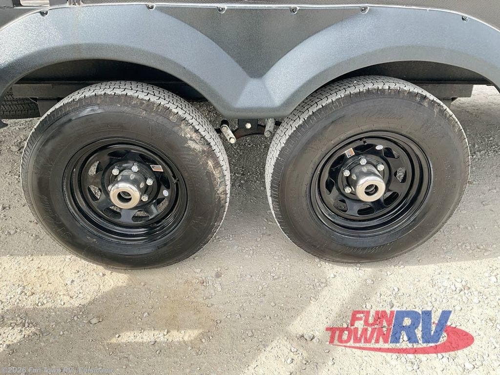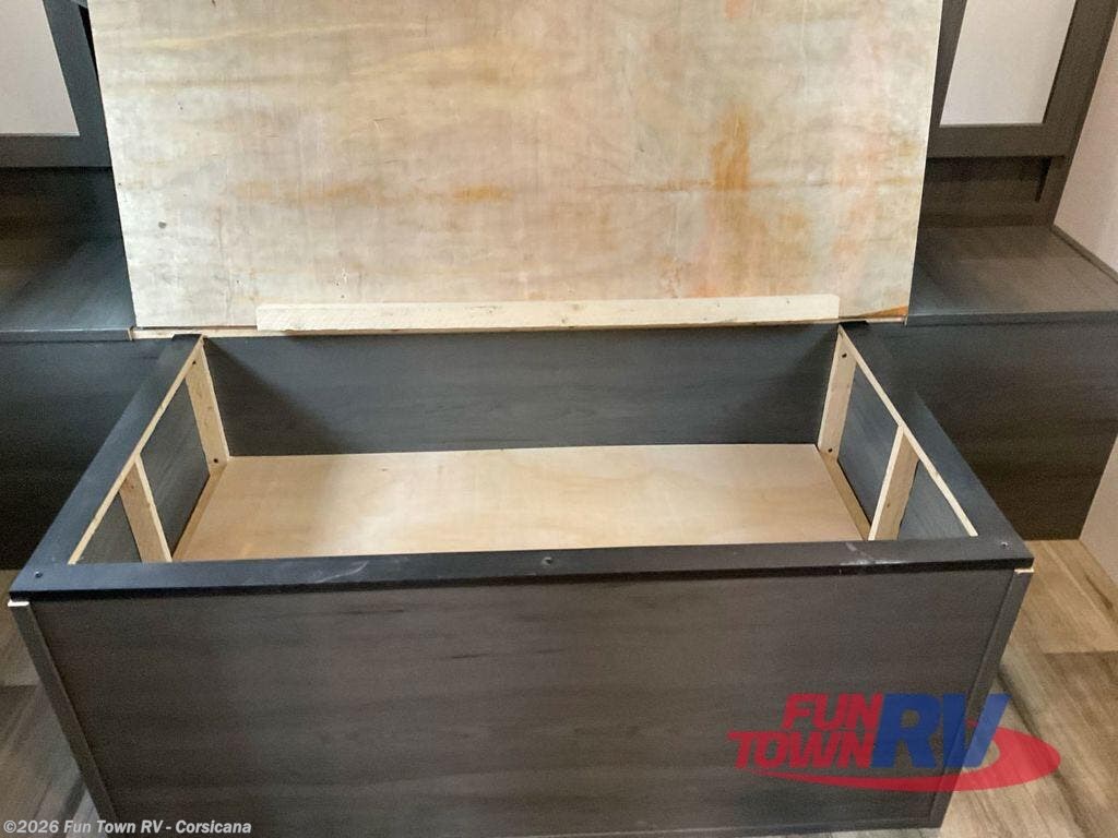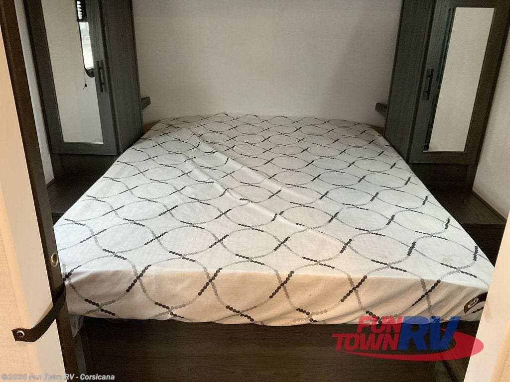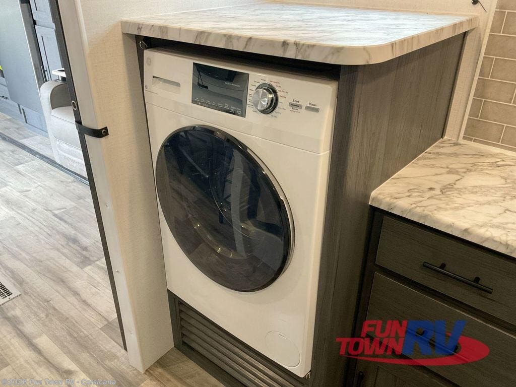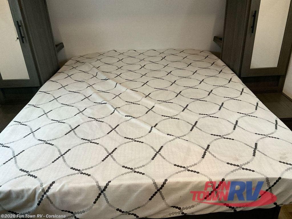 This unique travel trailer is one to remember! The rear wrap-around porch features ample space to entertain guests plus a peak-a-boo window with a fold-down bartop so those on the deck can visit with those inside. Once inside, you can relax on the theater seats with a flip top ottoman, and the fireplace will make this space more cozy. And check out the hidden Murphy bed behind the fireplace so guests can sleep over! A walk-thru bath is spacious so you can easily clean up each day, and the front master bedroom features a residential queen bed for all-around comfort.