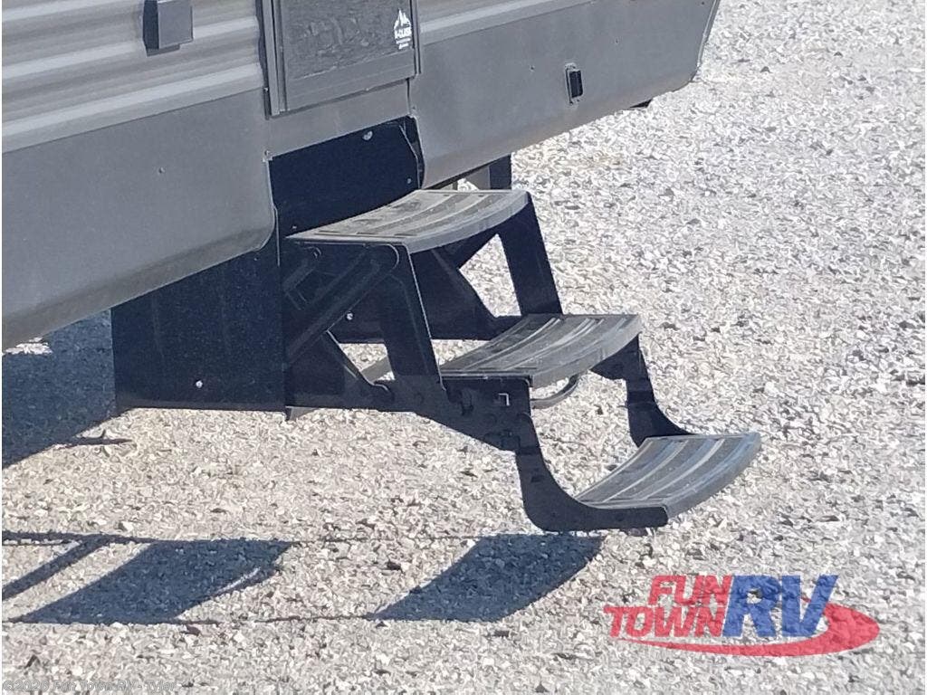 Get ready for fun and relaxation at the campgrounds with this trailer in your campsite. You can fish in the river, hike the trails and relax under the power awning before heading inside to enjoy the comforts of home. You will also enjoy having double access to the private bedroom which offers a residential queen bed and dual closets, plus the full bathroom will keep you refreshed after outdoor fun. The double-size bunks offer sleeping for four, and the furniture doubles as extra sleeping space. The cook will have full amenities including a 10 cu. ft. 12V refrigerator to store lots of cold items. And the single slide gives everyone more floor space.