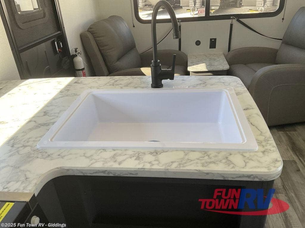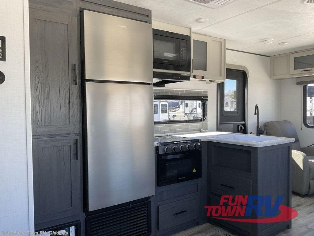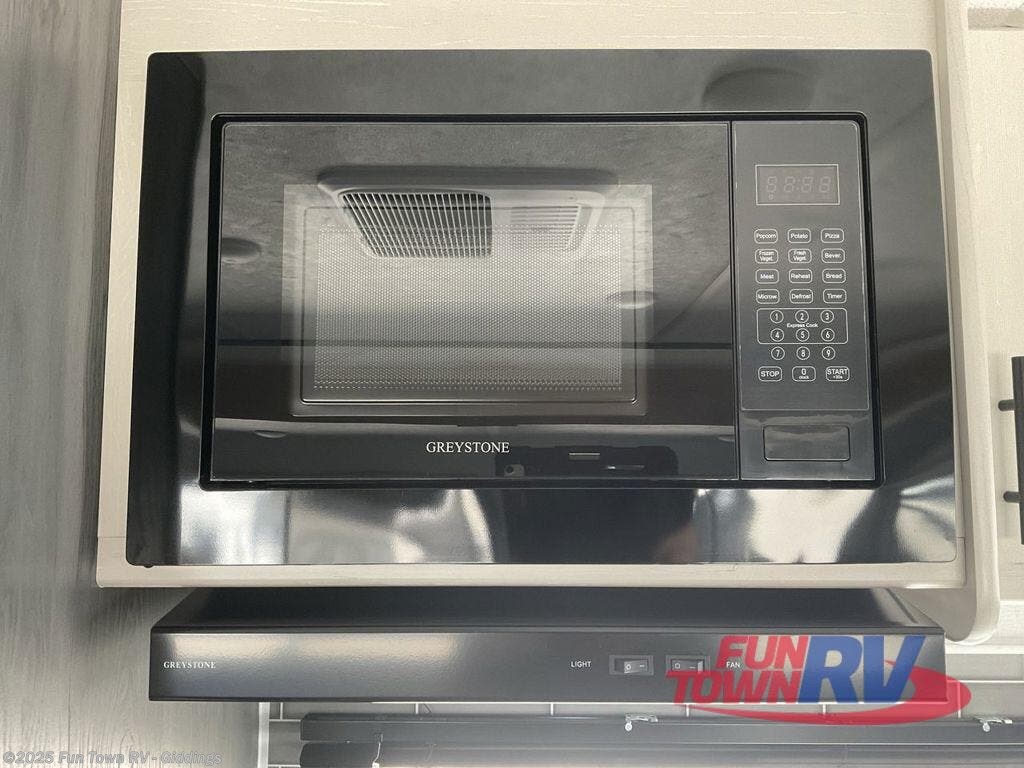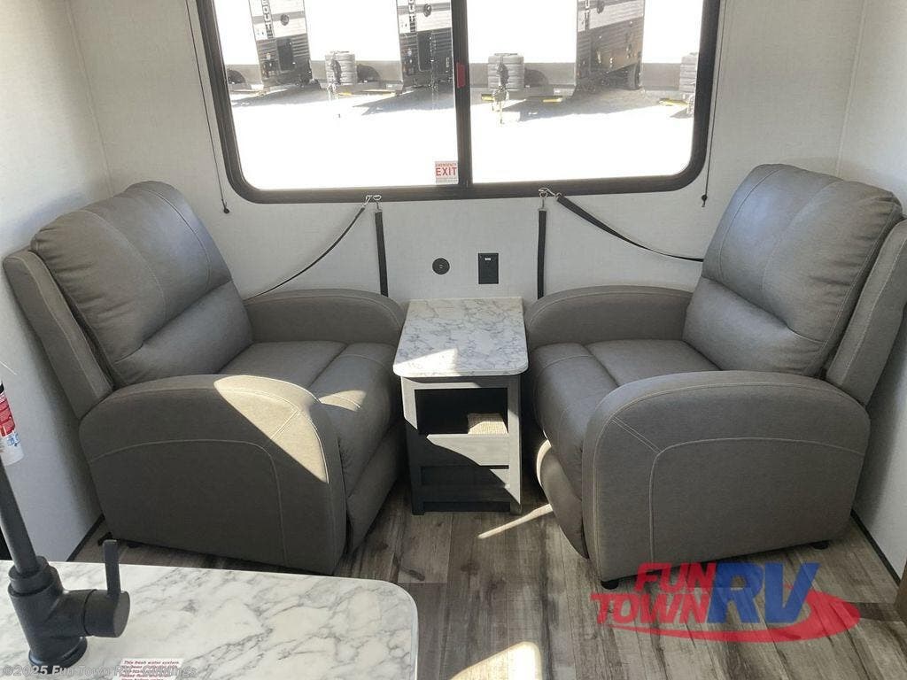 With dual entry doors, you can easily enter and exit this travel trailer! The jackknife sofa with footrest and booth dinette are next to each other near the fireplace, as well as two rear recliners allowing you to visit with other RVers or your family. The cook will have an oven and a microwave to make meals, and a 10 cu. ft. 12V refrigerator for cold items, plus a galley sink with high rise faucet to keep the dishes clean. Speaking of being clean, the full bathroom offers a shower with exhaust fan to eliminate unwanted steam as you clean yourself up after a fun day at the beach. The front private bedroom has a residential queen bed and one of the entrance/exit doors so you can slip out for an early morning fishing trip!