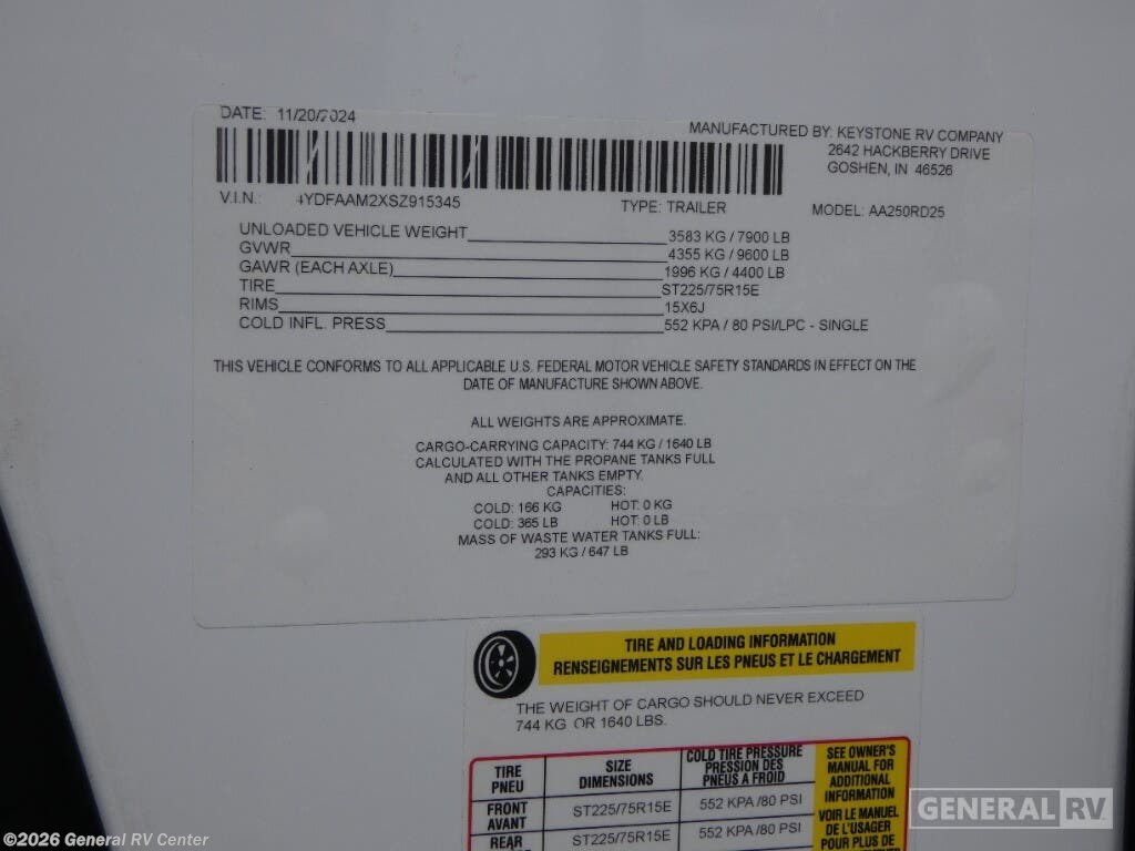Experience the perfect blend of comfort and style with the 2025 Dutchmen Astoria 250RD. This RV is designed to be your home away from home, offering a spacious and inviting layout. As you enter, you're greeted by a beautifully arranged center kitchen, complete with a farm-style sink and a 10 cu. ft. full-size refrigerator. Imagine preparing delicious meals on the three-burner cooktop, with ample countertop space thanks to the handy extension. The rear living area boasts plush theater seating, perfect for relaxing after a day of adventures, while the convertible U-shaped dinette provides additional sleeping space for guests. Moving towards the front, the Astoria 250RD features a cozy bedroom with a comfortable queen bed and ample wardrobe space, ensuring a restful night's sleep. The center bath, equipped with a walk-in shower and skylight, offers a touch of luxury and convenience. Outside, enjoy the great outdoors under the 21 ft. powered retractable awning, complete with an outdoor griddle for alfresco dining. With its thoughtful design and modern amenities, this RV promises an unforgettable travel experience. For more details or to see it in person, visit your nearest General RV dealership.
