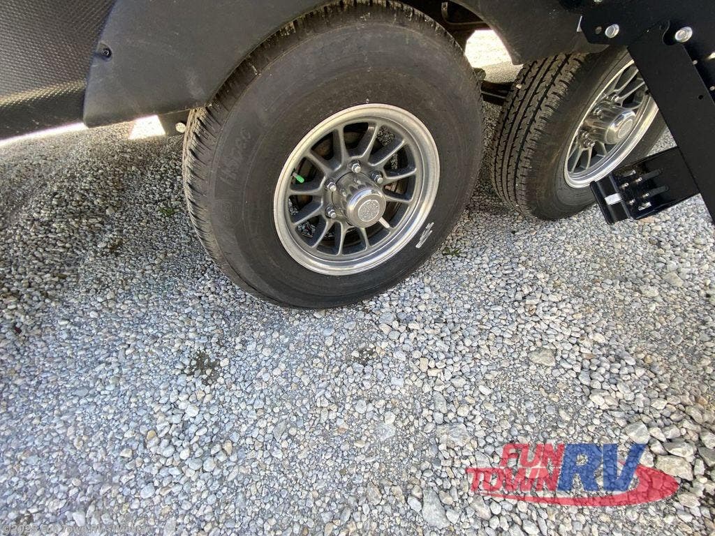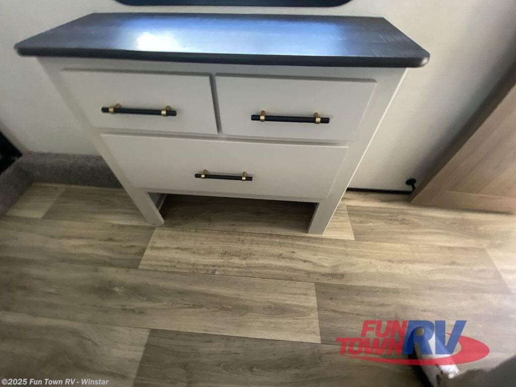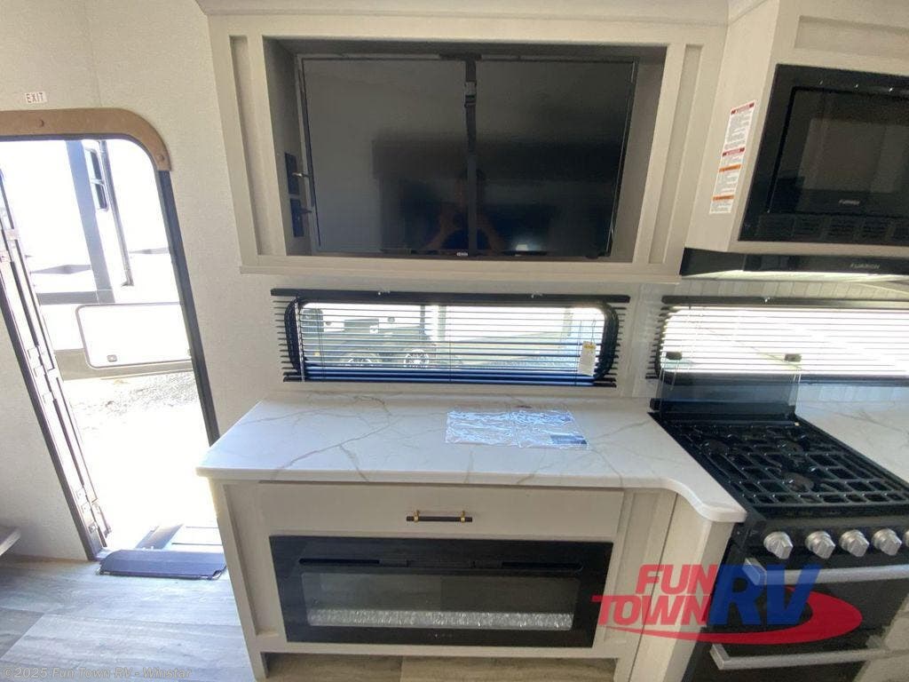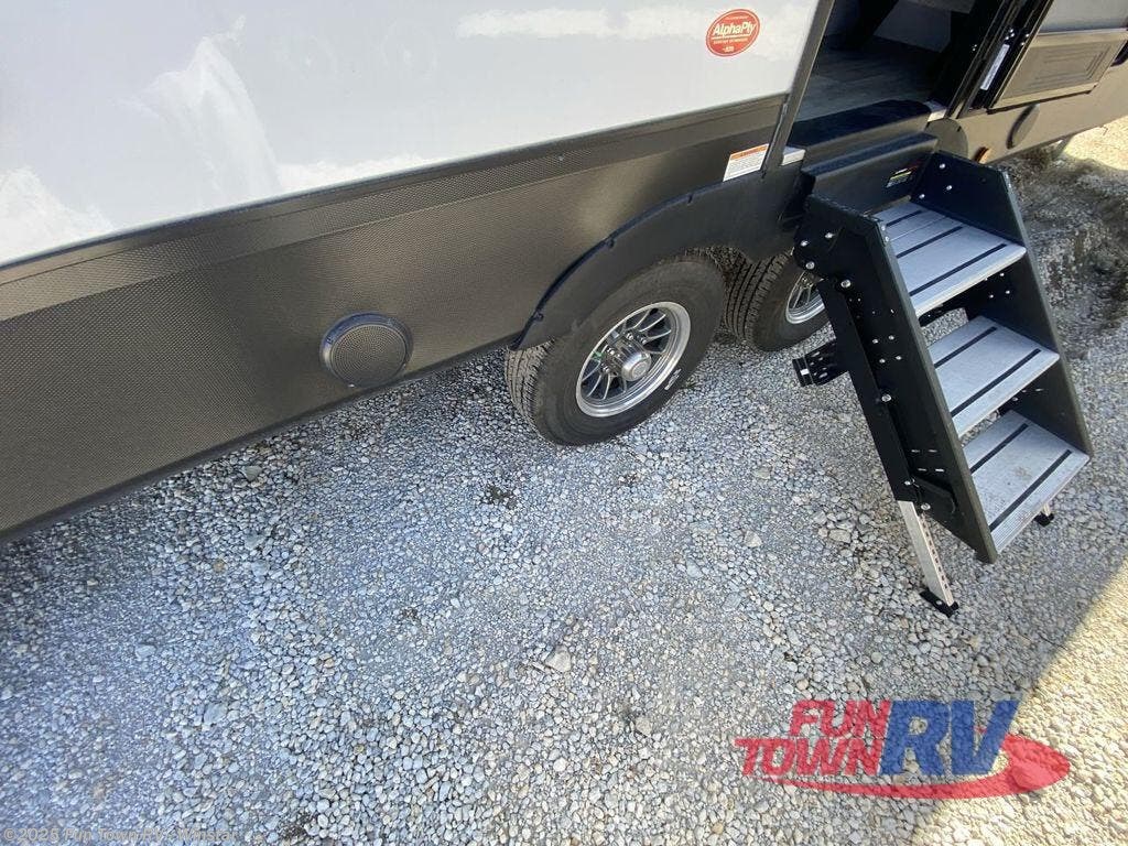 Plan to say awhile in this rear kitchen fifth wheel! You will fall in love with the front bedroom with a king bed slide out, large front closet, a dresser, plus a mounted TV for movies in bed. The rear kitchen includes plenty of space to prep meals, a farm style sink, plus a 10 cu. ft. 12V refrigerator and a pantry for food storage! You can get cozy on the theater seating slide out or at the cafe dinette, and the LED TV will ensure you'll never go bored on rainy days!