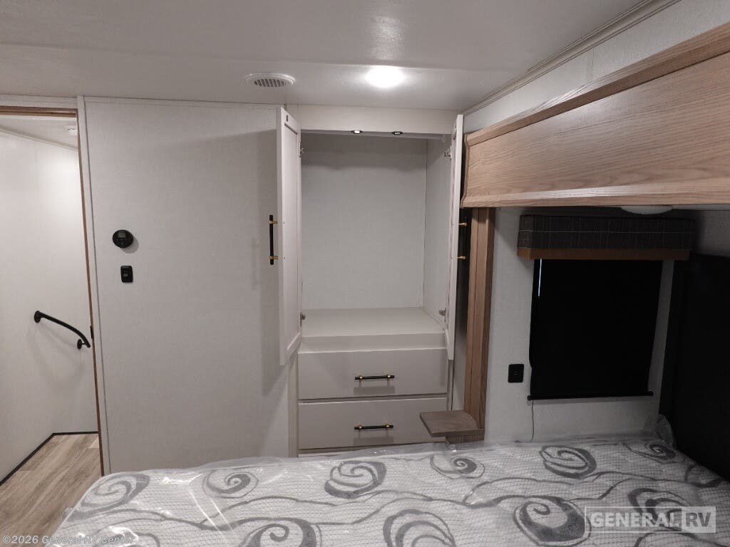 Experience the perfect blend of comfort and style with the 2025 Dutchmen Astoria 260RK. This travel trailer is designed for those who crave adventure without sacrificing luxury. At just over 30 feet, it offers a spacious and inviting layout that includes a cozy rear kitchen, perfect for culinary enthusiasts. The full-size refrigerator and three-burner cooktop make meal preparation a breeze, while the ample pantry space ensures you have all the essentials on hand. The center living area is a haven for relaxation, featuring plush theater seating and a café dinette, ideal for entertaining or unwinding after a day of exploration. The front bedroom boasts a luxurious king bed and a mounted TV, providing a private retreat for restful nights. With two slides, the interior feels open and airy, complemented by the natural light streaming through the skylight in the walk-in shower. This model is prepped for a washer and dryer, adding an extra layer of convenience for extended trips. Enjoy the great outdoors under the 18 ft. powered retractable awning, perfect for shaded relaxation. With a robust cargo capacity and ample storage, the Astoria 260RK is ready for any adventure you dream up. For more details, visit your nearest General RV dealership and start your journey today!