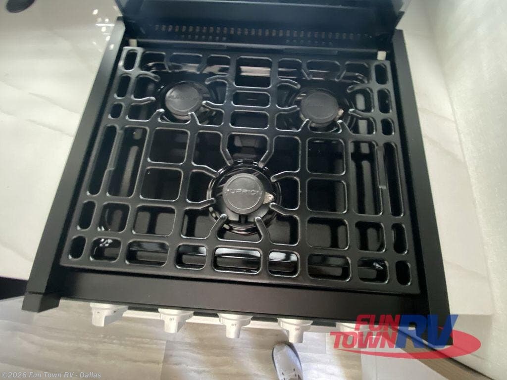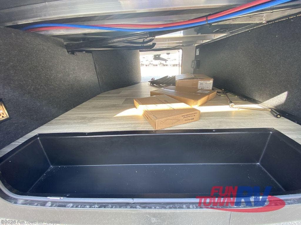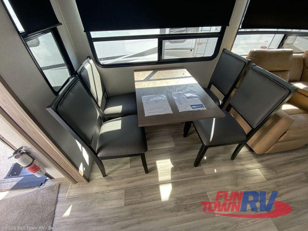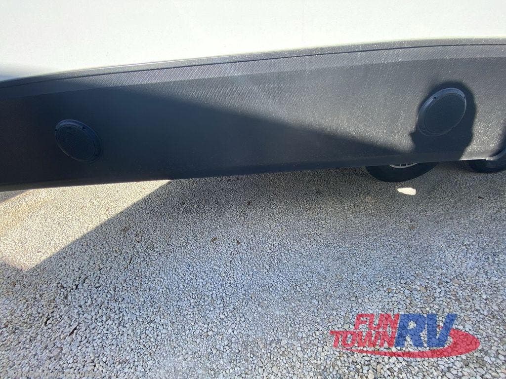 With a front bedroom and a middle multi-purpose room in this fifth wheel, everyone will have a comfortable night's sleep when you include the living room furniture and the loft bed as sleeping space! The front private bedroom has a king bed slide and a front wardrobe to keep your clothes looking their best. The multipurpose room features a sofa slide and storage below a loft bed which can be used for sleeping or storage. A couple other guests can join in too and sleep on the rear tri-fold sofa and the booth dinette once they are converted. The full bathroom has a dual sink vanity to make it easier for everyone getting ready in the mornings. You can prepare your best meals with the glass top three burner cooktop with an oven, the 16 cu. ft. refrigerator, and the kitchen island. The theater seating is conveniently across from the entertainment center with an HD LED TV and fireplace.
