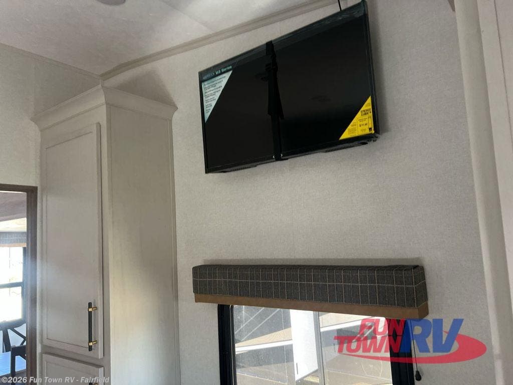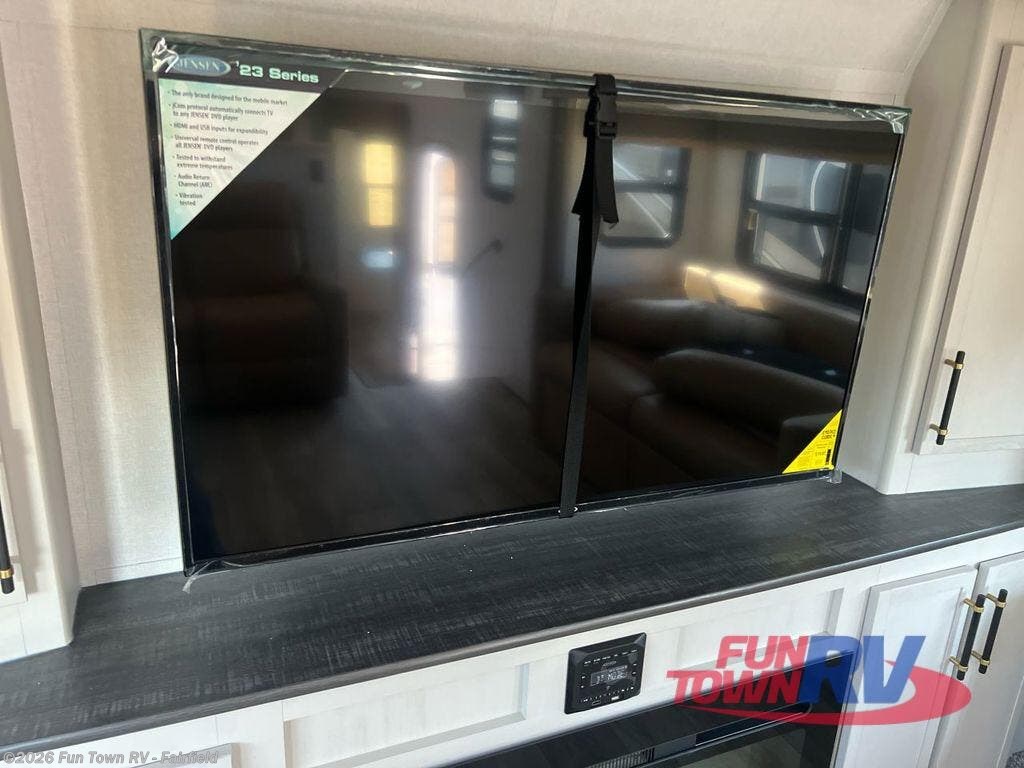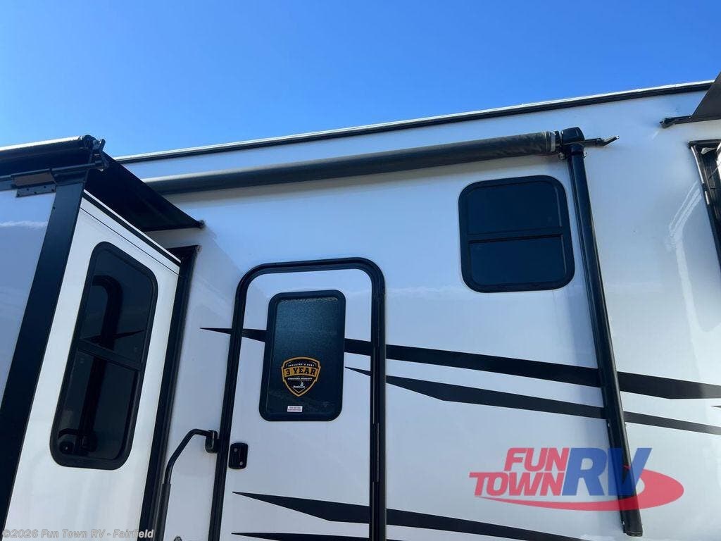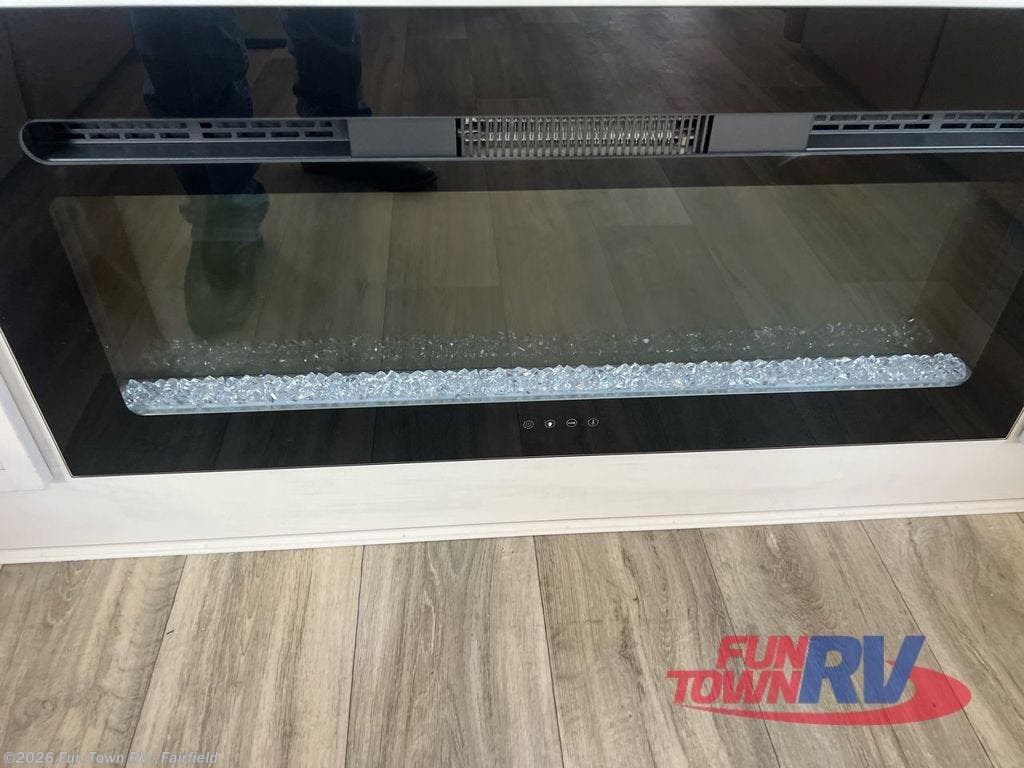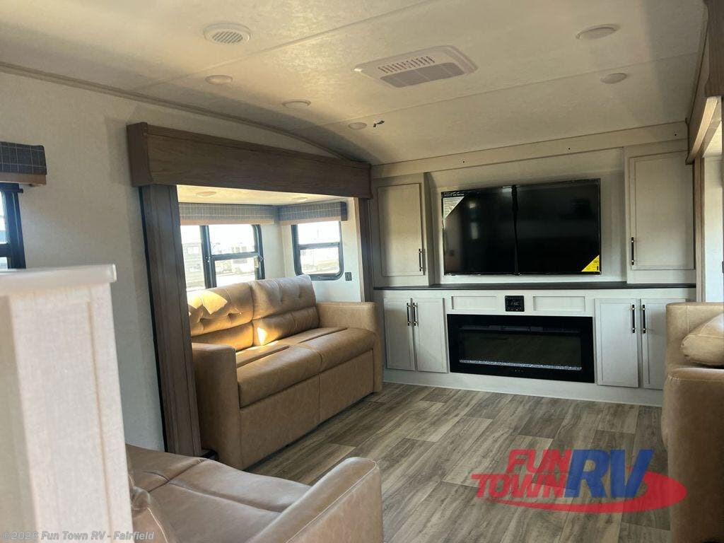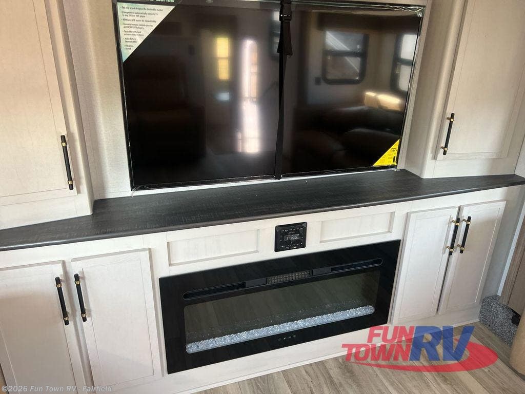 Experience a comfortable camping trip with this fifth wheel! The front living area not only has opposing sofa slides, but also theater seating across from an entertainment center with a 40" fireplace and a HD LED TV. The separate kitchen has everything you will need to prepare delicious home cooked meals including a glass top three burner cooktop with an oven and a kitchen island with a large sink that has a high rise faucet with a sprayer for an easy clean up. There is even a half bathroom by the kitchen so you can use it and quickly get back to cooking. The master suite has a king bed slide for more interior space, an entertainment center for a comfortable movie night, and access to the spacious full rear bathroom with a dual sink vanity, storage and washer/dryer prep!