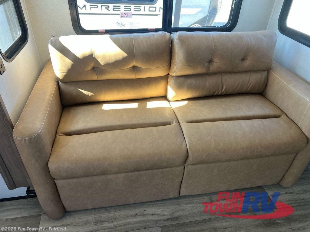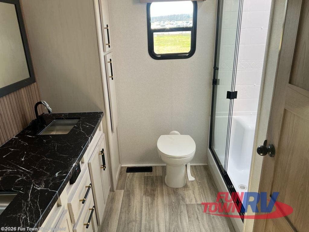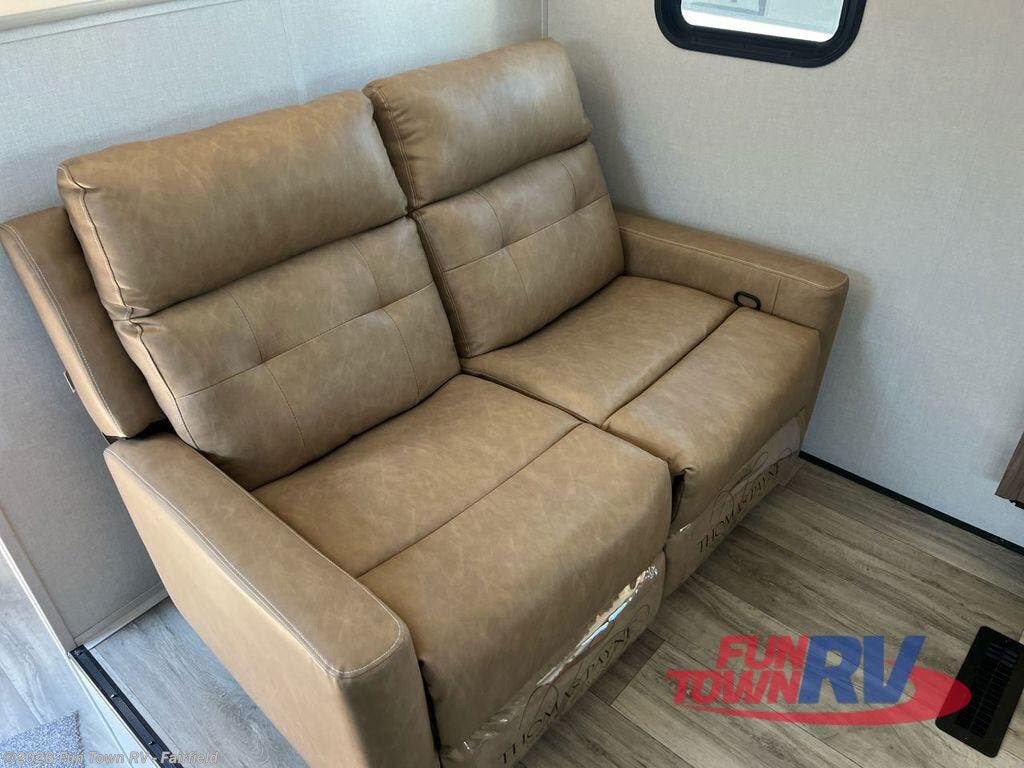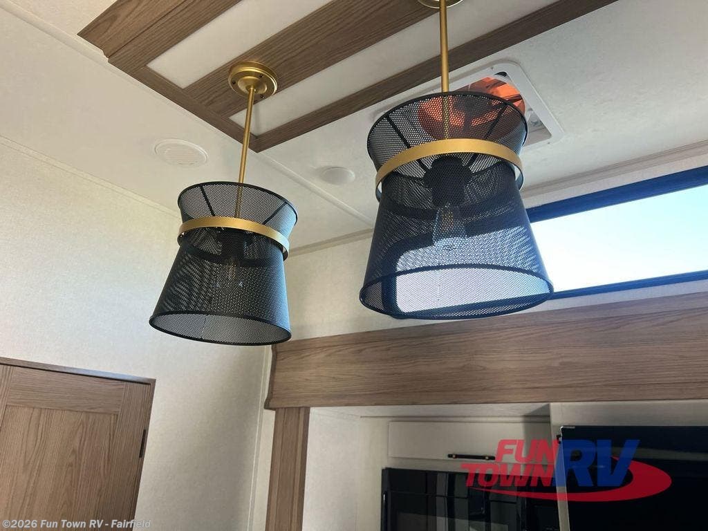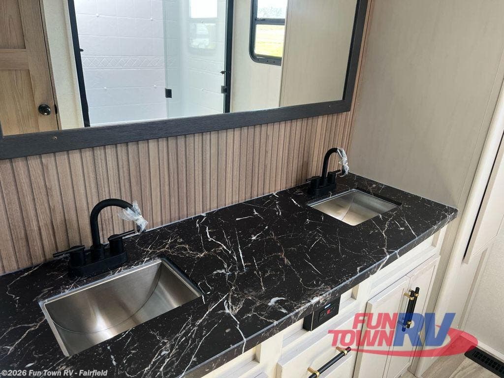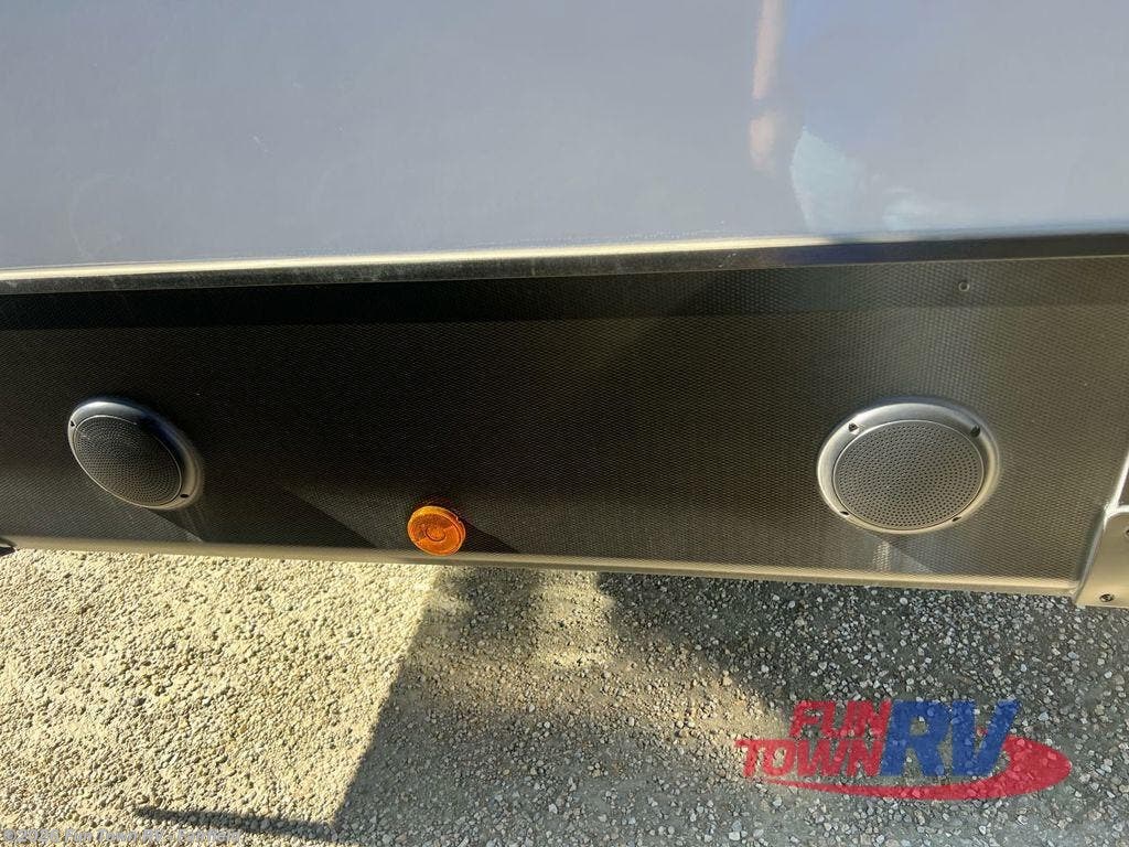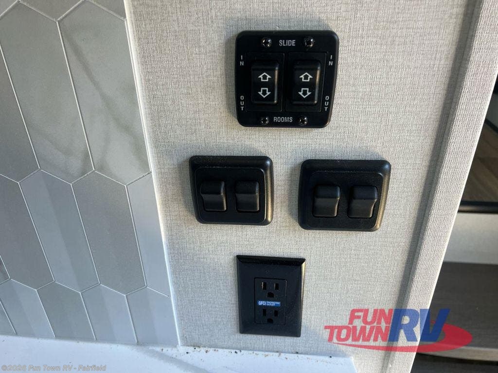 Experience a comfortable camping trip with this fifth wheel! The front living area not only has opposing sofa slides, but also theater seating across from an entertainment center with a 40" fireplace and a HD LED TV. The separate kitchen has everything you will need to prepare delicious home cooked meals including a glass top three burner cooktop with an oven and a kitchen island with a large sink that has a high rise faucet with a sprayer for an easy clean up. There is even a half bathroom by the kitchen so you can use it and quickly get back to cooking. The master suite has a king bed slide for more interior space, an entertainment center for a comfortable movie night, and access to the spacious full rear bathroom with a dual sink vanity, storage and washer/dryer prep!