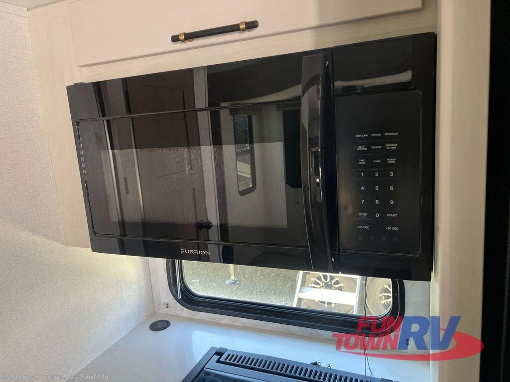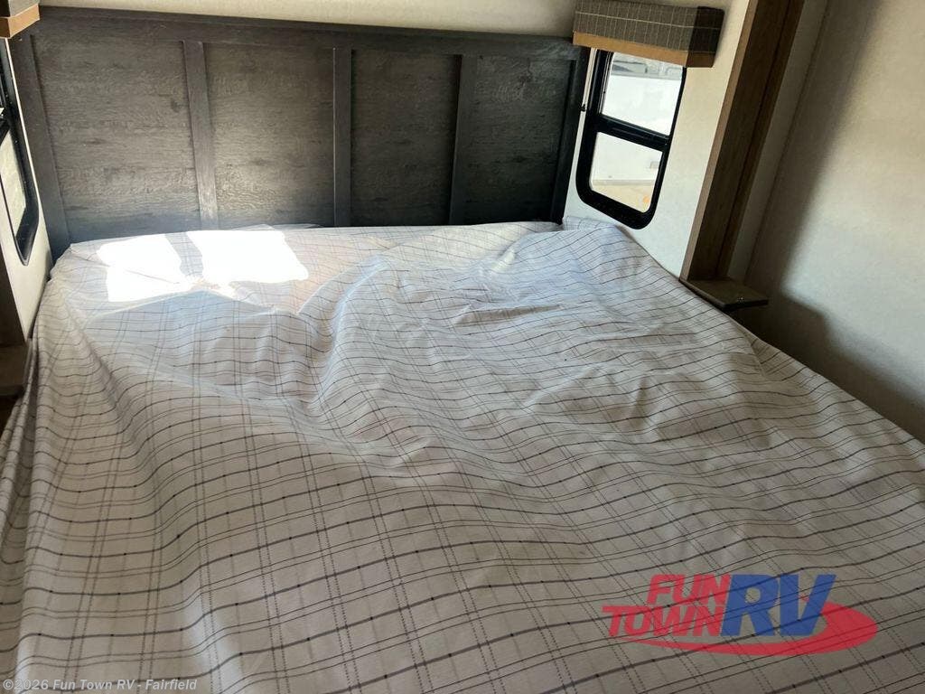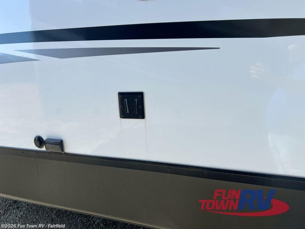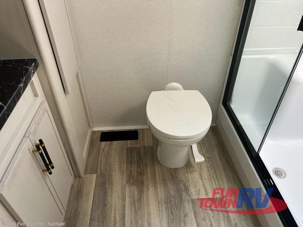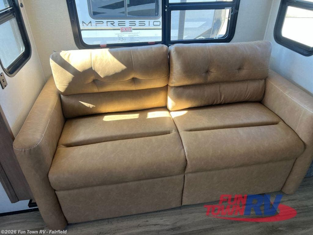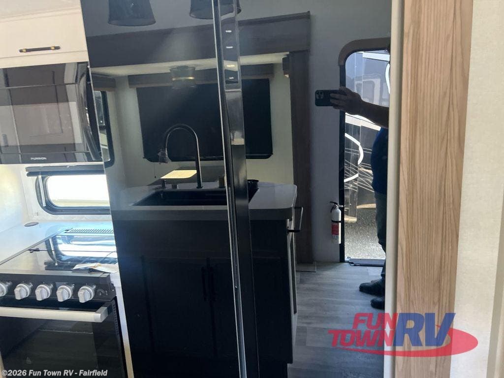 Experience a comfortable camping trip with this fifth wheel! The front living area not only has opposing sofa slides, but also theater seating across from an entertainment center with a 40" fireplace and a HD LED TV. The separate kitchen has everything you will need to prepare delicious home cooked meals including a glass top three burner cooktop with an oven and a kitchen island with a large sink that has a high rise faucet with a sprayer for an easy clean up. There is even a half bathroom by the kitchen so you can use it and quickly get back to cooking. The master suite has a king bed slide for more interior space, an entertainment center for a comfortable movie night, and access to the spacious full rear bathroom with a dual sink vanity, storage and washer/dryer prep!