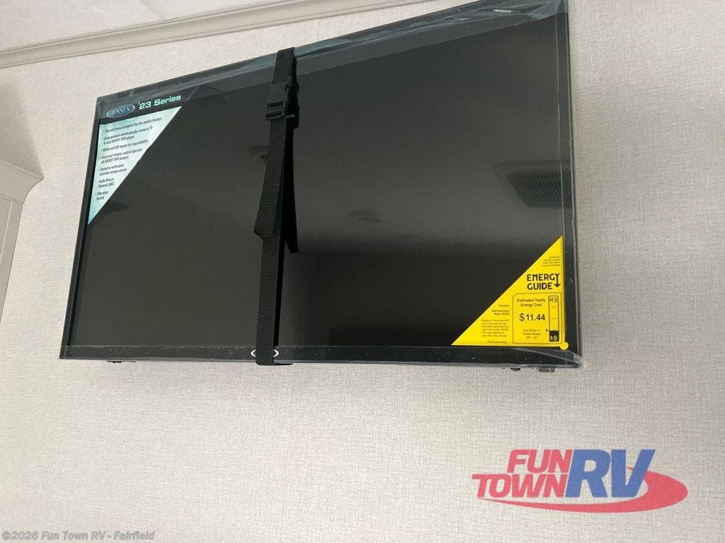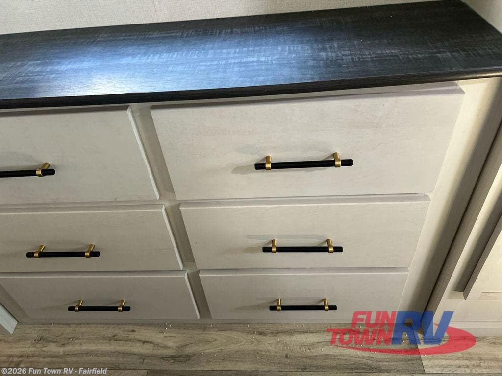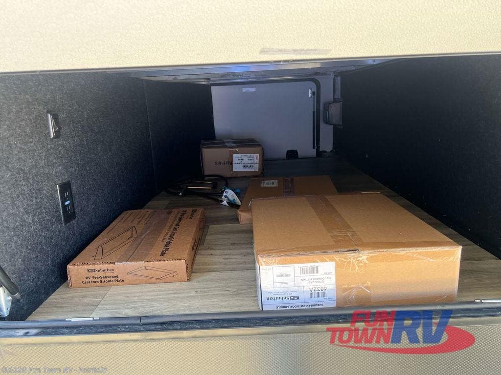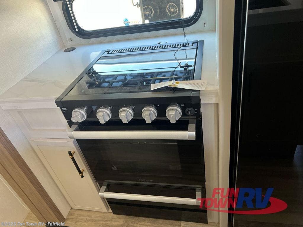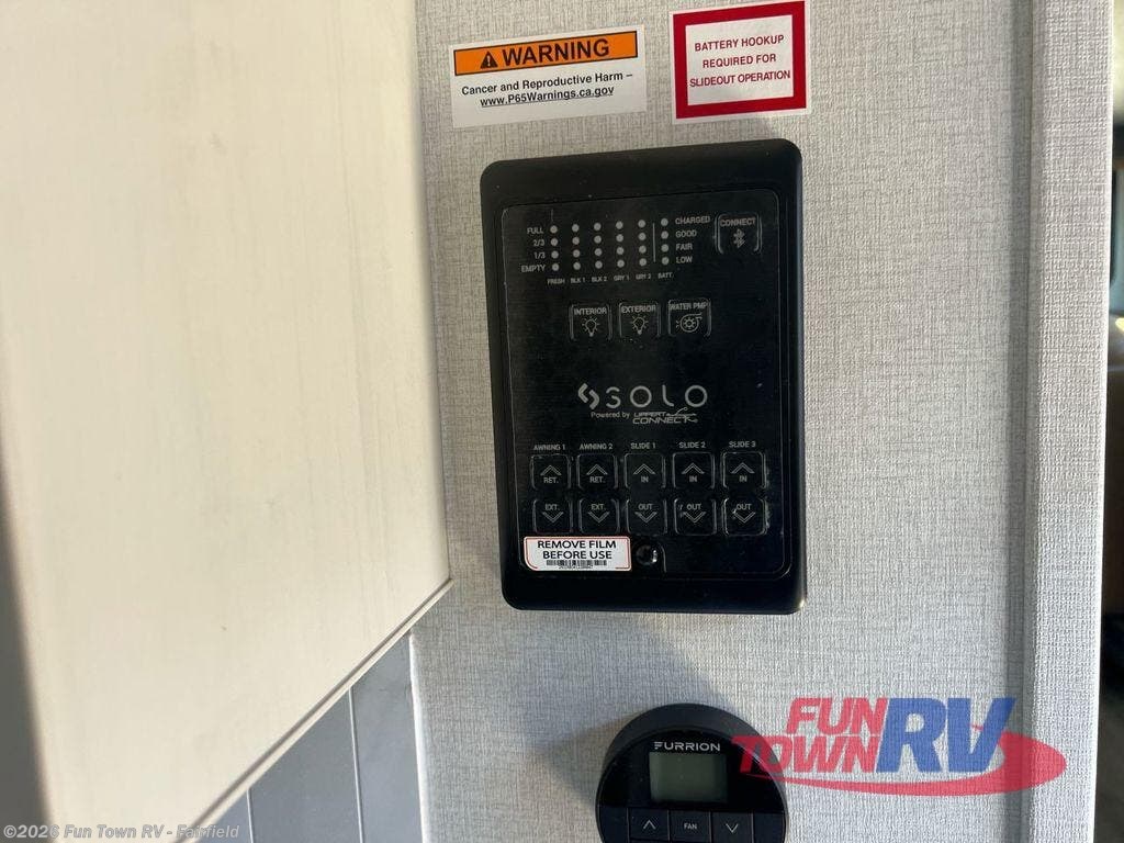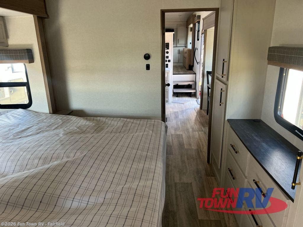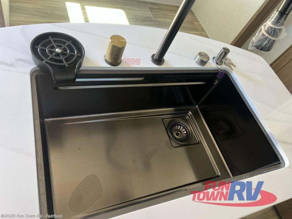 Experience a comfortable camping trip with this fifth wheel! The front living area not only has opposing sofa slides, but also theater seating across from an entertainment center with a 40" fireplace and a HD LED TV. The separate kitchen has everything you will need to prepare delicious home cooked meals including a glass top three burner cooktop with an oven and a kitchen island with a large sink that has a high rise faucet with a sprayer for an easy clean up. There is even a half bathroom by the kitchen so you can use it and quickly get back to cooking. The master suite has a king bed slide for more interior space, an entertainment center for a comfortable movie night, and access to the spacious full rear bathroom with a dual sink vanity, storage and washer/dryer prep!