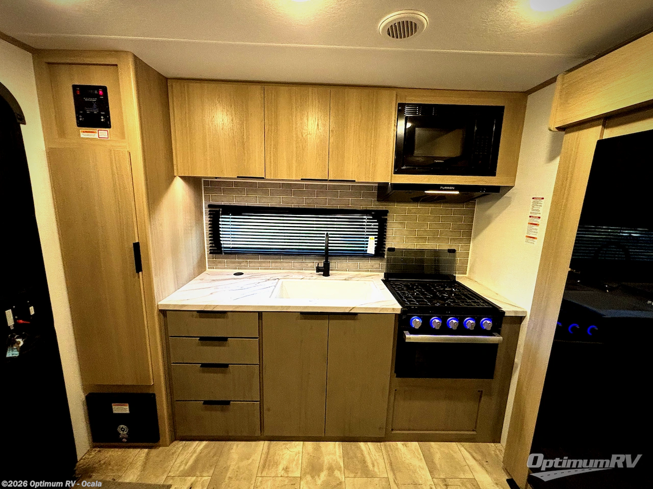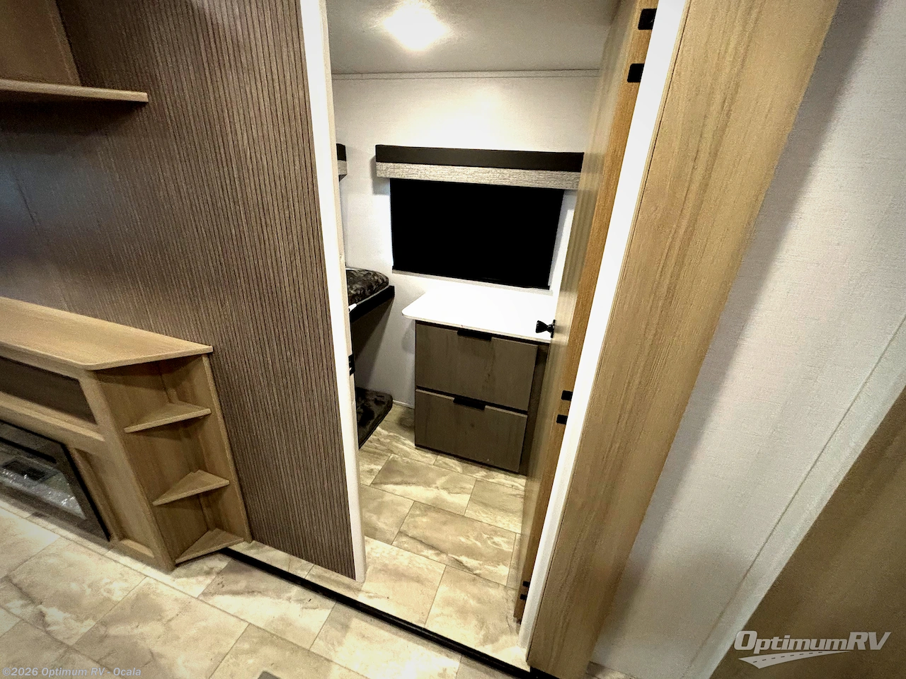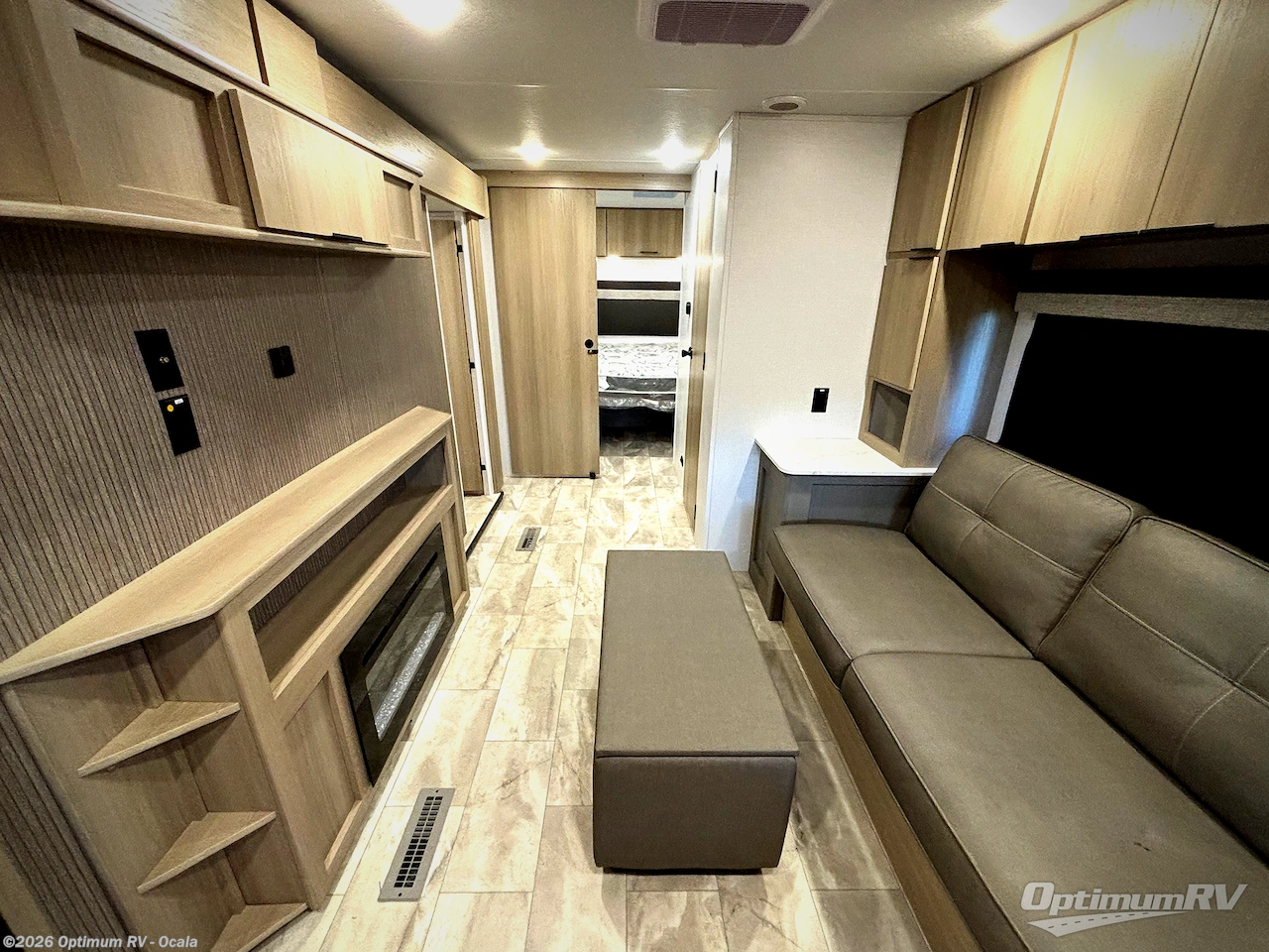 You'll love every minute spent in this spacious travel trailer. There is a front private bedroom with a queen bed and dual bedside closets to keep your things organized. The jack knife sofa sits across from the fireplace so you can enjoy your evenings indoors, and the hidden convertible bunk is behind the entertainment center for a smart usage of space! The rear kitchen includes a cooktop with an oven, a microwave, plus a 12V refrigerator and pantry for food storage. And don't overlook the mid-coach full bath for quick and easy showers!