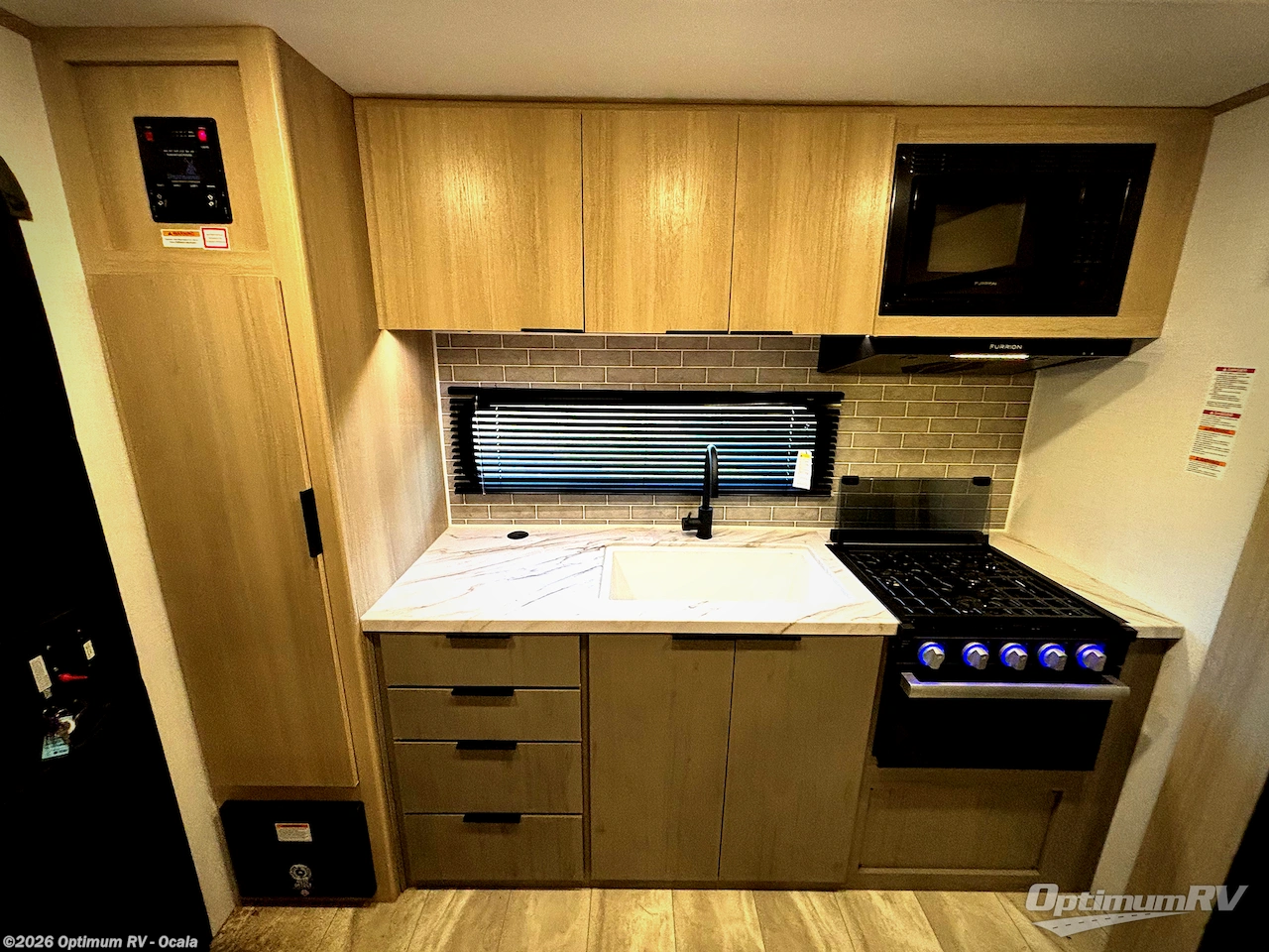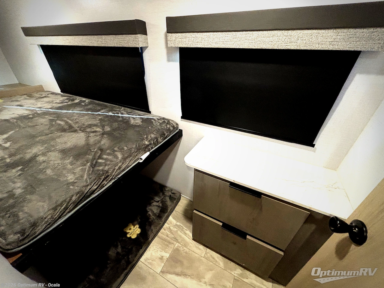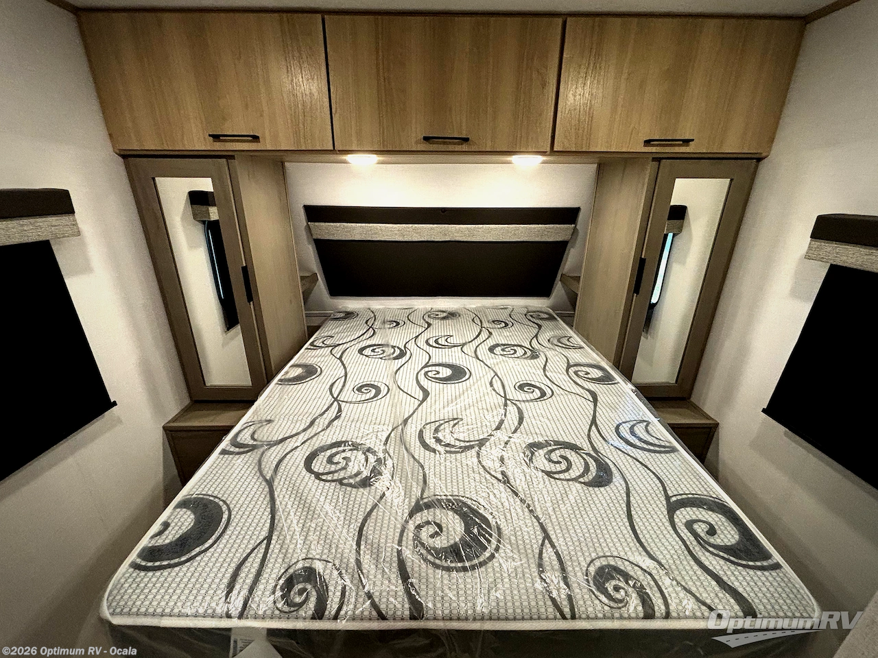 You'll love every minute spent in this spacious travel trailer. There is a front private bedroom with a queen bed and dual bedside closets to keep your things organized. The jack knife sofa sits across from the fireplace so you can enjoy your evenings indoors, and the hidden convertible bunk is behind the entertainment center for a smart usage of space! The rear kitchen includes a cooktop with an oven, a microwave, plus a 12V refrigerator and pantry for food storage. And don't overlook the mid-coach full bath for quick and easy showers!
