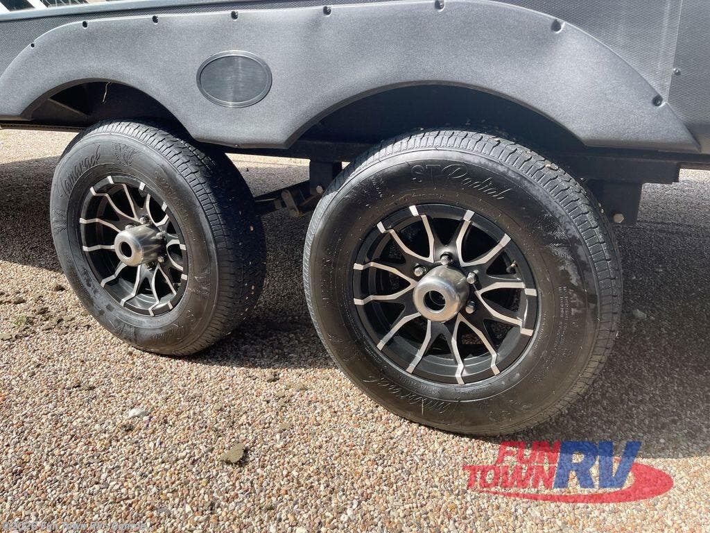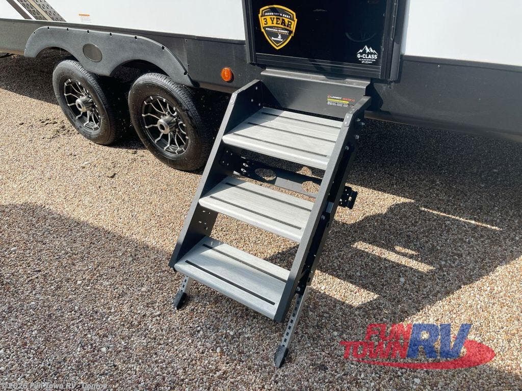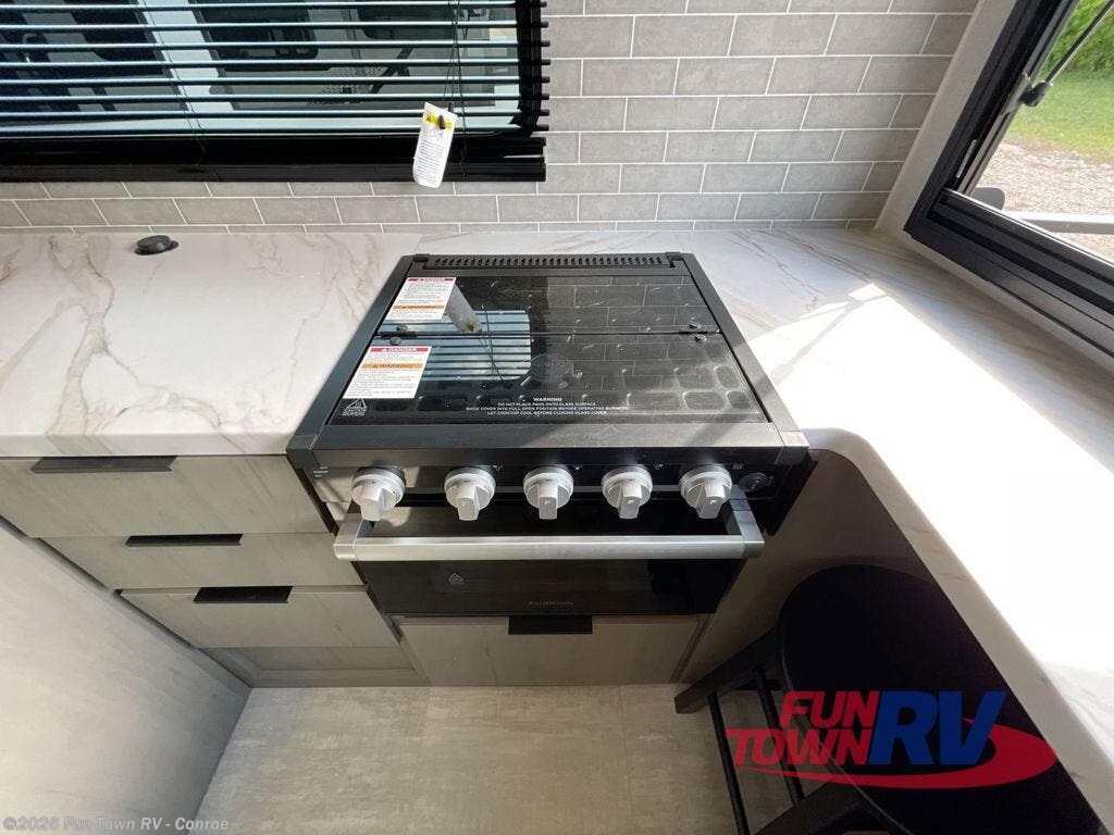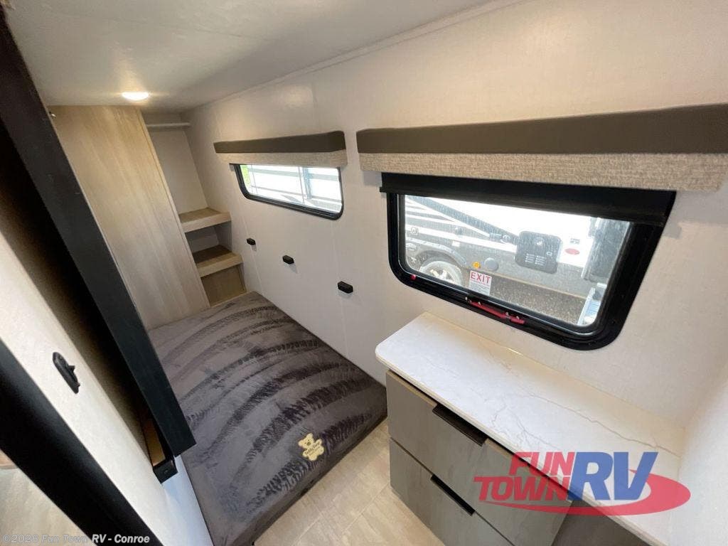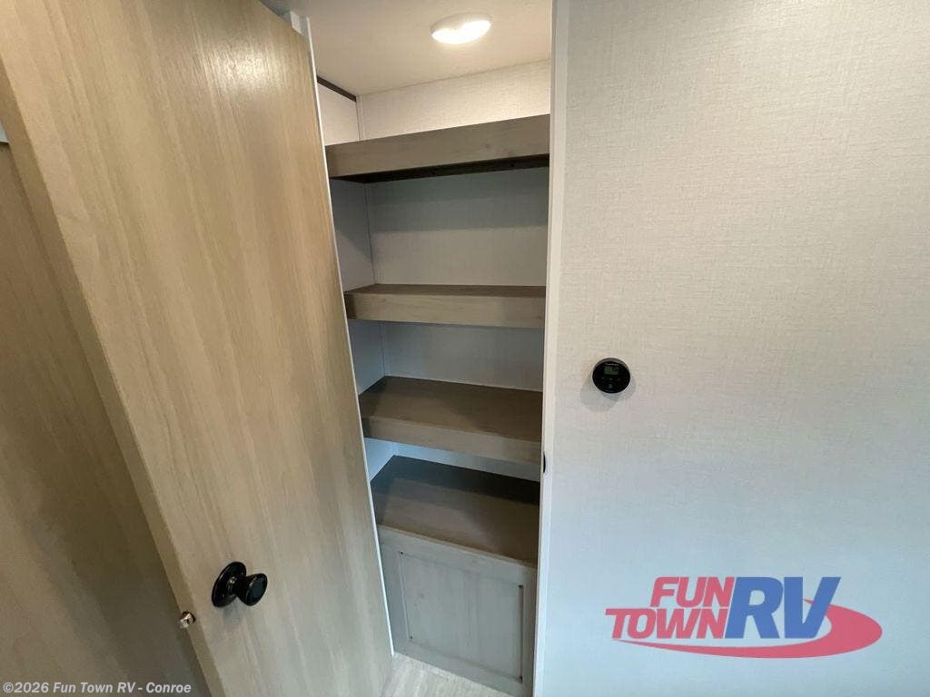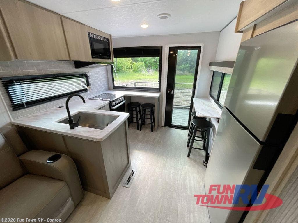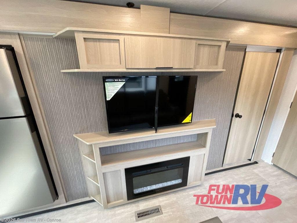 You'll love every minute spent in this spacious travel trailer. There is a front private bedroom with a king bed and dual bedside closets to keep your things organized. The jack knife sofa sits across from the fireplace so you can enjoy your evenings indoors, and the hidden convertible bunk is behind the entertainment center for a smart usage of space! The full kitchen features ample counter space, along with a concession style window, so while the chef is cooking, they can visit with those on the rear fold-down porch.