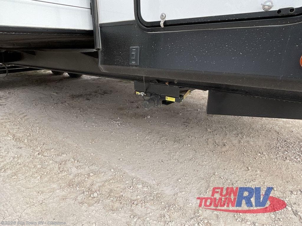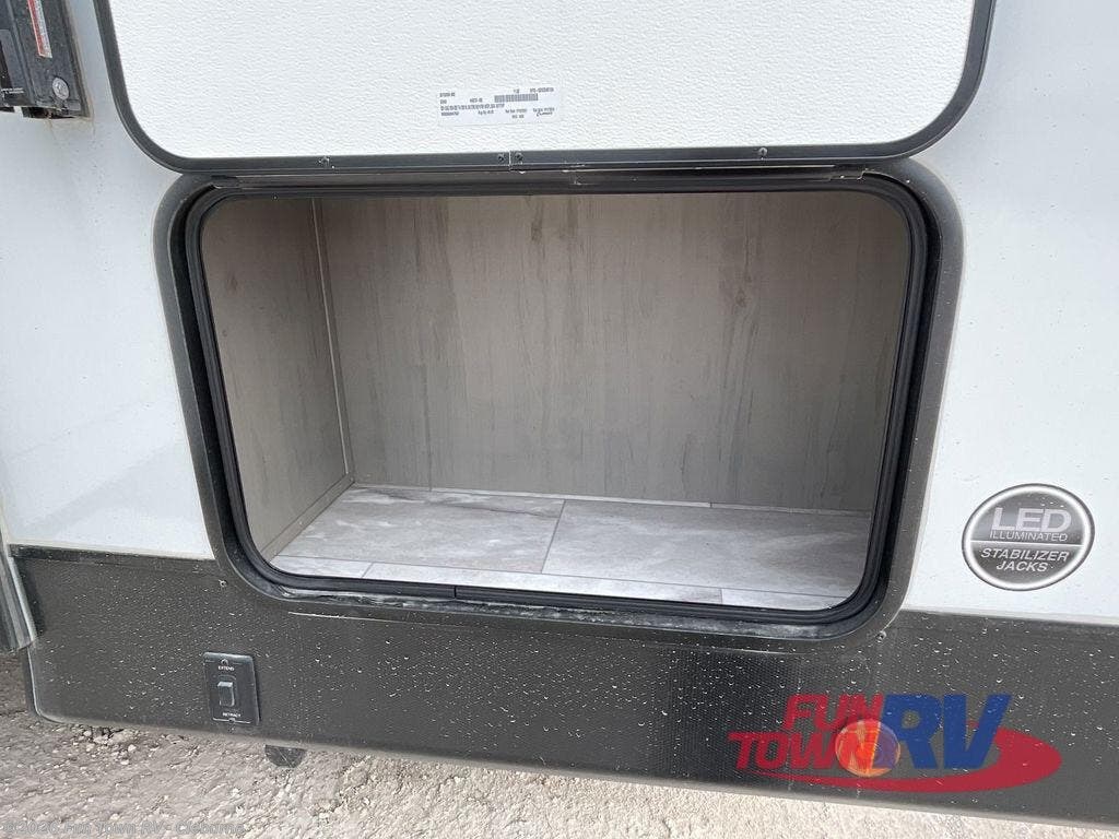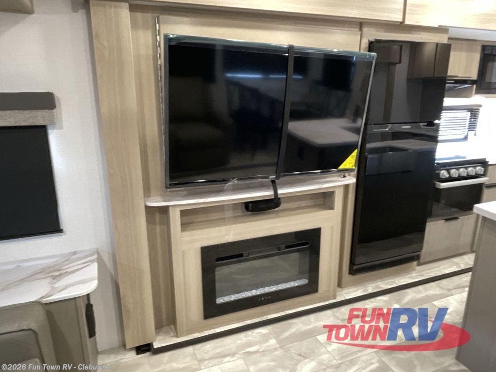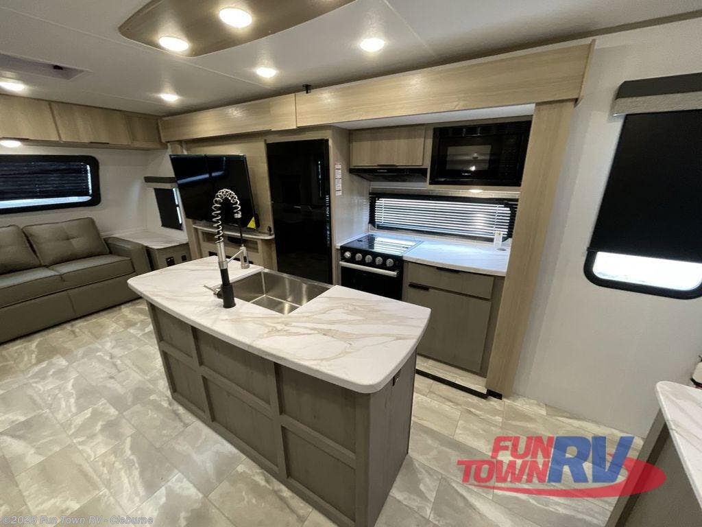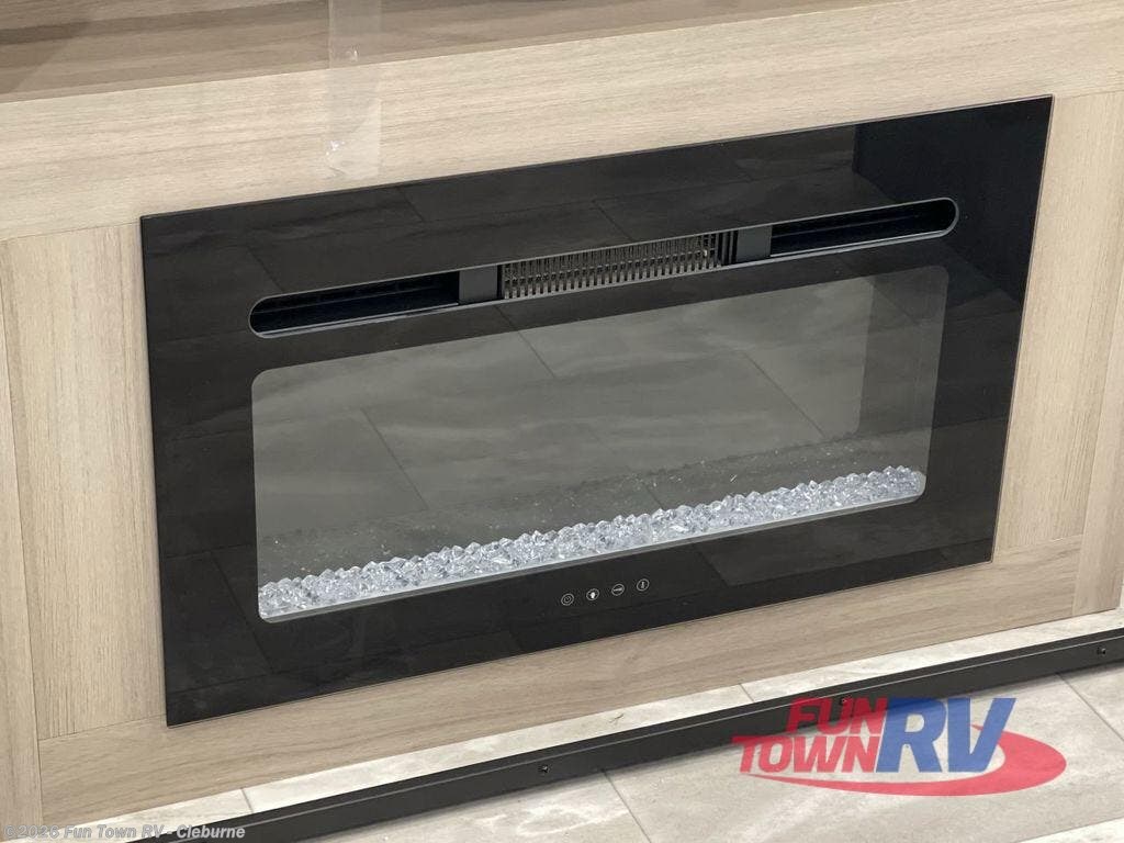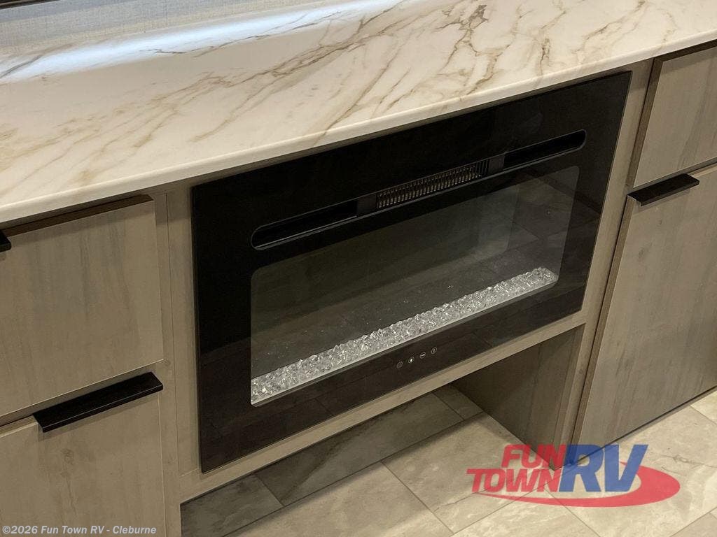Enjoy ultimate family vacations or trips with friends in this spacious travel trailer. The dual opposing slides in the front living area open up the whole unit for a more at-home feel, and you'll find plenty of seating spaces on the theater seating with a foot rest, booth dinette, and jack knife sofa. The chef of the family will appreciate the extra counter space provided by the kitchen island, plus there is an extra counter with cabinets above for dishes and food. There is an outside kitchen that will come in handy if you like to cook breakfast outdoors, and the power awning with LED lights will provide your crew with shade as they wait for the food to be done. You and your spouse will love retreating to the rear private bedroom for bed each night. Here, the slide out king bed will provide a great night's rest, plus you will have your own fireplace, a closet, and linen storage for more belongings!