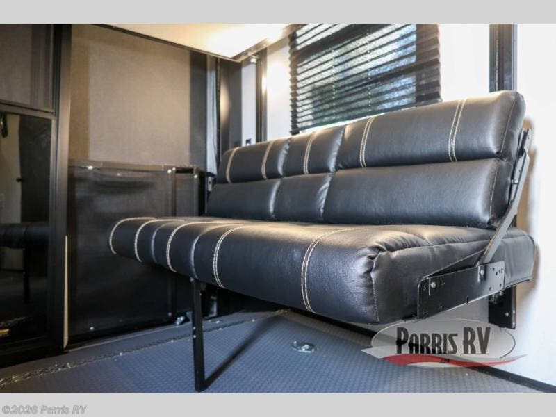 This Voltage toy hauler is going to get you pumped to start traveling! You will have your own master suite in the front which has private access to the dual-entry bathroom, and you can offer a guest suite with half bathroom, power bunk, sofas, TV, and exterior entry to your friends or family. A loft bed adds even more sleeping space, and you'll have a great relaxation area with the three sofas in the main living room. A pantry sits next to the 18-cubic foot refrigerator for food storage, and the rest of the kitchen appliances will help you prepare dinner in a flash.
