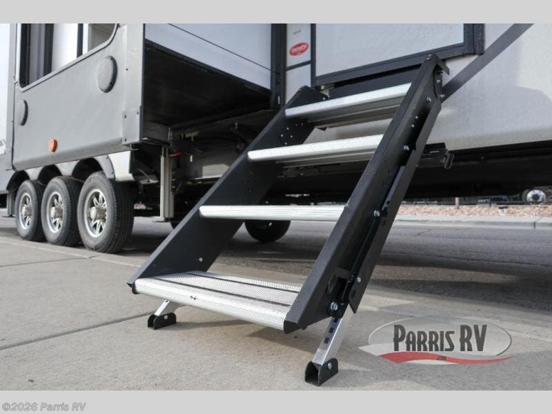 You can't go wrong with this toy hauler in tow! Once you arrive at the campground, you can unload your toys from the 13' separate garage and relax on the dual sofas with a table top in between. There is also a lay flat Happi-Jack power bunk above, a loft bed, plus a half bath, which will make this space perfect for guests. The middle kitchen and living room is designed so everyone can gather together on the two reclining sofas with footrests, watch a movie on the 50" TV, and visit with the cook as they make dinner in the U-shaped kitchen. The owners will love the front private bedroom with its king bed slide out, large front closet, and dresser to keep all their belongings organized. And don't overlook the exterior with Solid Step entry steps, two power awnings, and an outdoor kitchen!