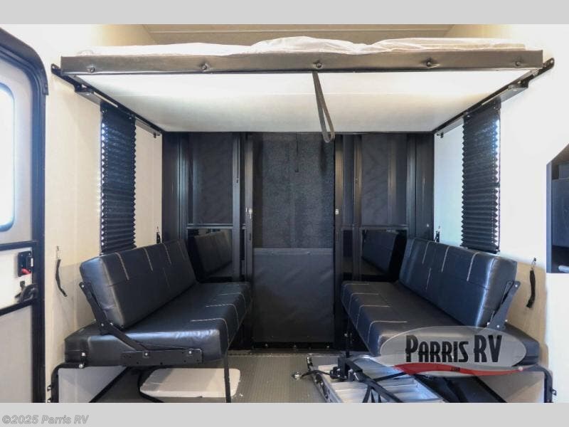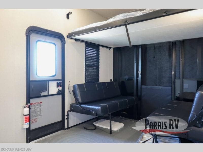 Make it a week of fun with this Voltage V-Series toy hauler featuring a 14' garage with sleeping for seven or eight thanks to the Bed Lift System over dual sofas and a dinette which convert to more sleeping in the garage area, a loft, and private front bedroom with queen bed. The main combined kitchen and living area features theater seating within a slide for added floor space and there is perfect viewing of the entertainment center and fireplace adjacent. You will enjoy full kitchen and bath amenities to keep you fueled and clean, and the half bath in the garage will make it easy for everyone. A 21' awning offers additional living space outside, and the second entry door within the garage space leads into that half bath for added convenience. This unit also offers ample storage with a full pass-through compartment, plus inside cabinets, dual closets, and under bed storage as well.