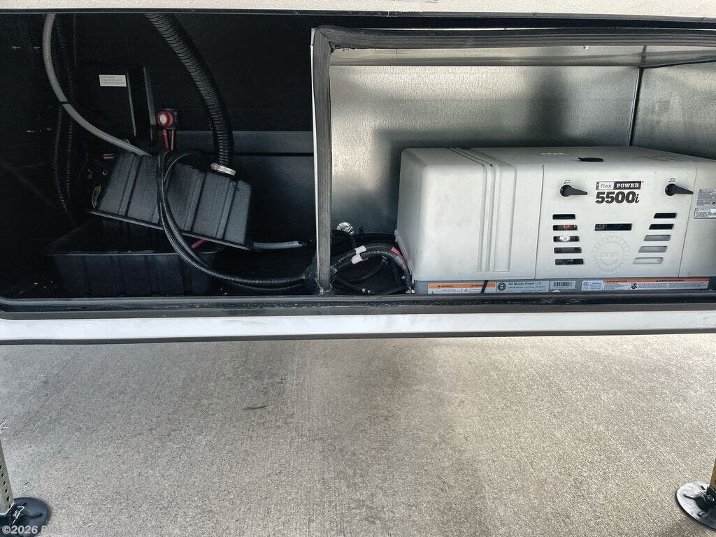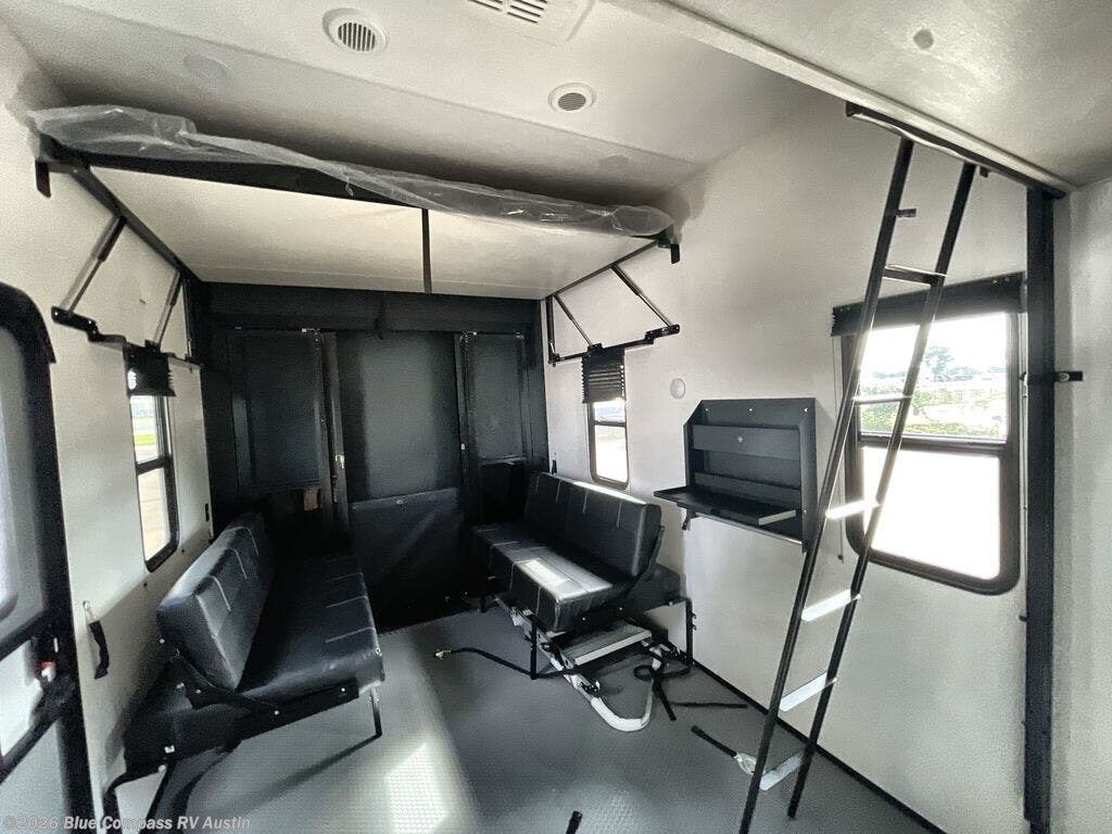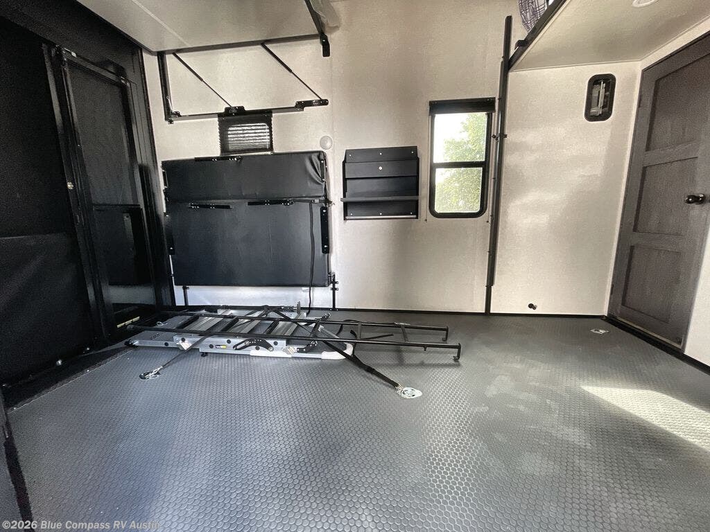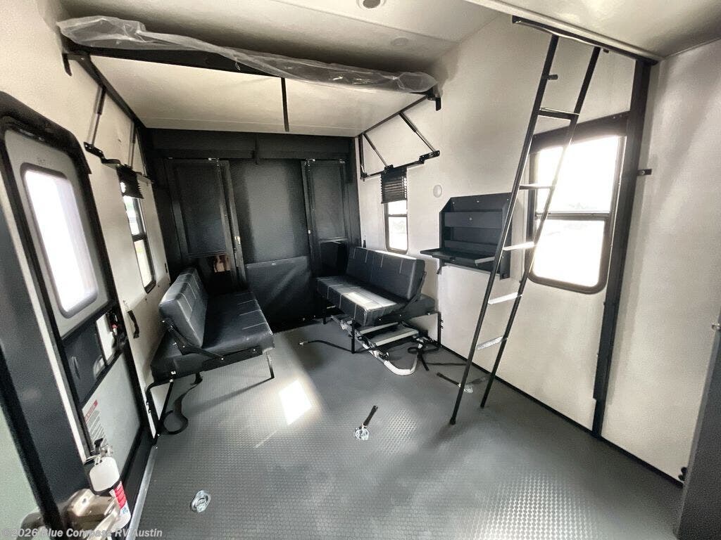 This toy hauler includes dual entry doors for a smooth flow of traffic, a bath and a half for hassle-free camping, plus a 14' separate garage for your favorite toys! The garage also includes a bed lift system and lay-flat Happi Jack seating plus a loft bed for more sleeping space. You'll find your own space up front in the private bedroom, complete with a king bed slide out and a large front closet to keep your things organized. And the full bath with a walk-in shower is close by for easy nighttime use! Everyone can meet in the middle kitchen and living room to enjoy the reclining sofa with a footrest and 50" TV while the chef whips up dinner on the three burner cooktop! There is also a kitchen island for more counter space plus a pantry and 16 cu. ft. 12V refrigerator for food storage!