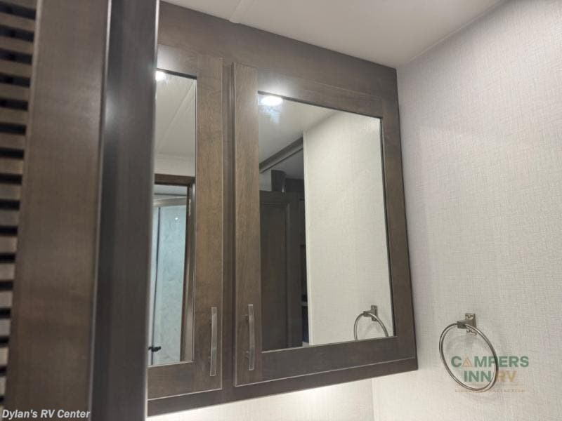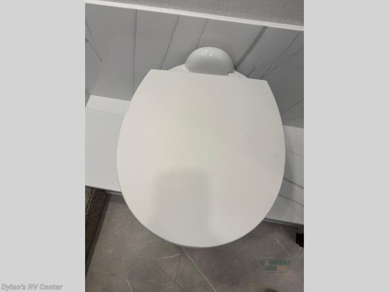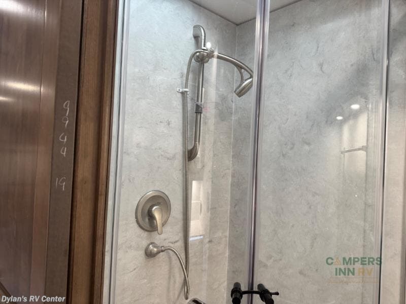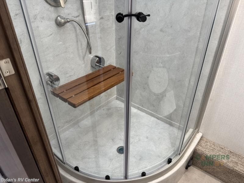 Full Bath with Spa-Like Amenities – A residential shower with glass doors, porcelain toilet, and solid-surface vanity offer a true home-like experience on the road.