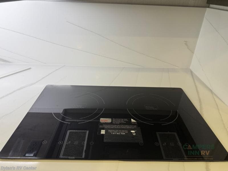 Gourmet Kitchen with High-End Appliances – Includes a residential refrigerator, induction cooktop, convection microwave, and solid-surface countertops, perfect for cooking delicious meals wherever you roam.