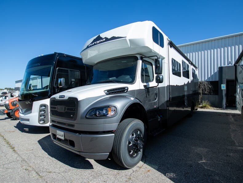 The Europa Super C diesel motorhome by Dynamax is coming to you with all the power, durability, and luxury you need for your adventurous lifestyle. You will love the solid surface countertop with LED edge lighting in the kitchen, the premium vinyl flooring throughout, and the clean, contemporary styling. The on-demand water heater is a luxury you won't want to travel without, and the multiplex wiring with a touch screen command center includes switch panels, and Bluetooth Smart Phone app control for ease of use. There are dual 12V 8D AGM deep-cycle maintenance-free house batteries and a single 200-watt solar panel to go off-grid if you choose, and the 12,000 lb. trailer hitch will allow you to bring along the off-road toys. Some of the exterior features that make this coach great are the armless patio awning with LED lighting, the automatic four-point hydraulic leveling jacks, and the eye-catching custom full-body paint package!