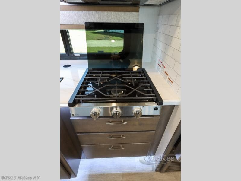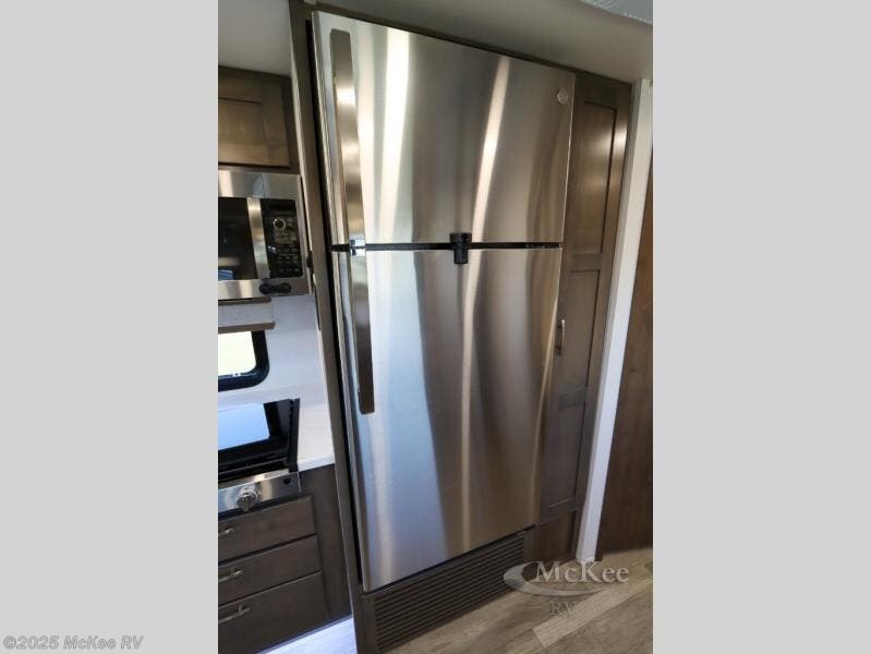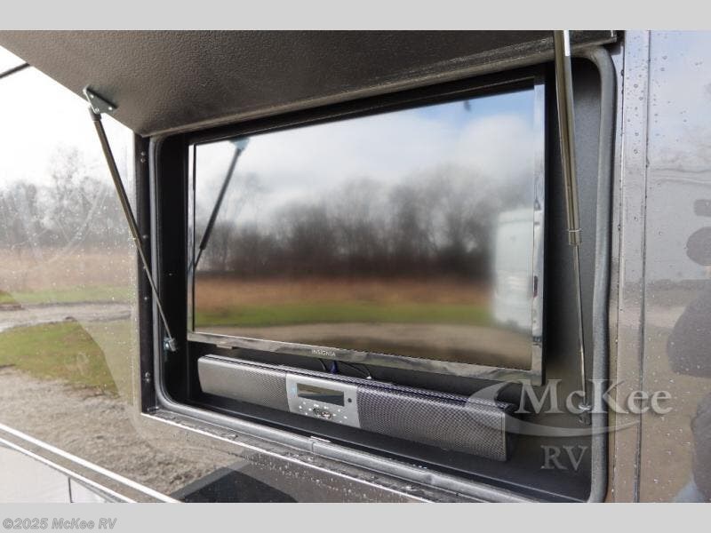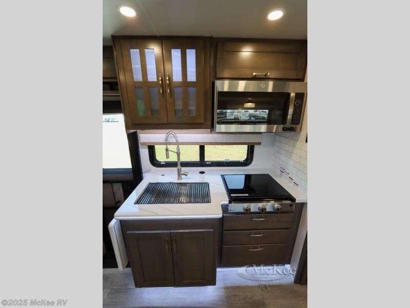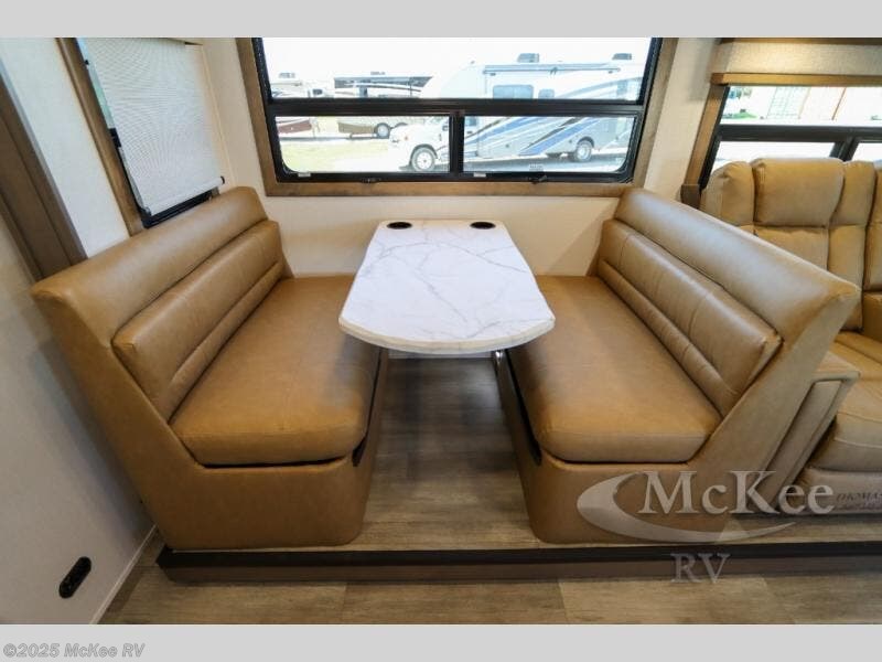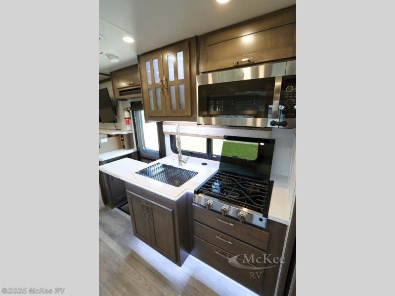 You will have plenty of space to walk about this motorhome with the dual slides! The booth dinette and sofa slide create an open concept living area and the sofa can be replaced for the optional theater seating if you prefer that instead. Freshen up after a long day of traveling in the rear corner bathroom with the designer shower that has a skylight above for more natural lighting and an Oxygenics body spa RV shower head for a more relaxing shower. Put on your comfy clothes stored in the wardrobe in the rear corner private bedroom then either lay on the 60" x 75" gel-infused memory foam mattress while you watch a movie on the 32" LED smart TV or head to the kitchen and whip up a meal with the three burner gas range and countertop extension. You could even head outside and watch a movie on the exterior 32" TV underneath the 16' dual-pitch armless awning!