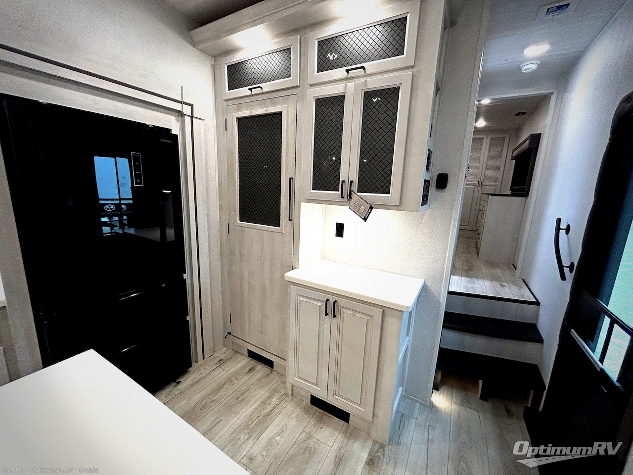 If you're looking for a luxury fifth wheel with more space for friends and family, you've found it in this Ahara! The main entry door opens up to the living area with dual opposing slides, a 50" LED TV with a fireplace, plus a full kitchen with residential appliances, a hutch, and even a pantry for dry goods and snacks. Everyone can meet here in the evenings to dine at the free-standing dinette or relax on the theater seating. You'll love the rear master suite with its king bed slide out, drawers under the bed, and full rear bath with the unique rear second entry door. And check out the Ahara Sky Suite loft above this room for even more sleeping or storage space! Your guests will find the front private bedroom to be accommodating since it includes a king bed slide out, drawers under the bed, pus a large wardrobe to keep clothes tidy. There is also a closet with washer and dryer pre. Who knows, you may just choose this bedroom for your own!