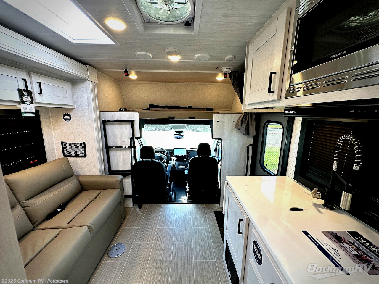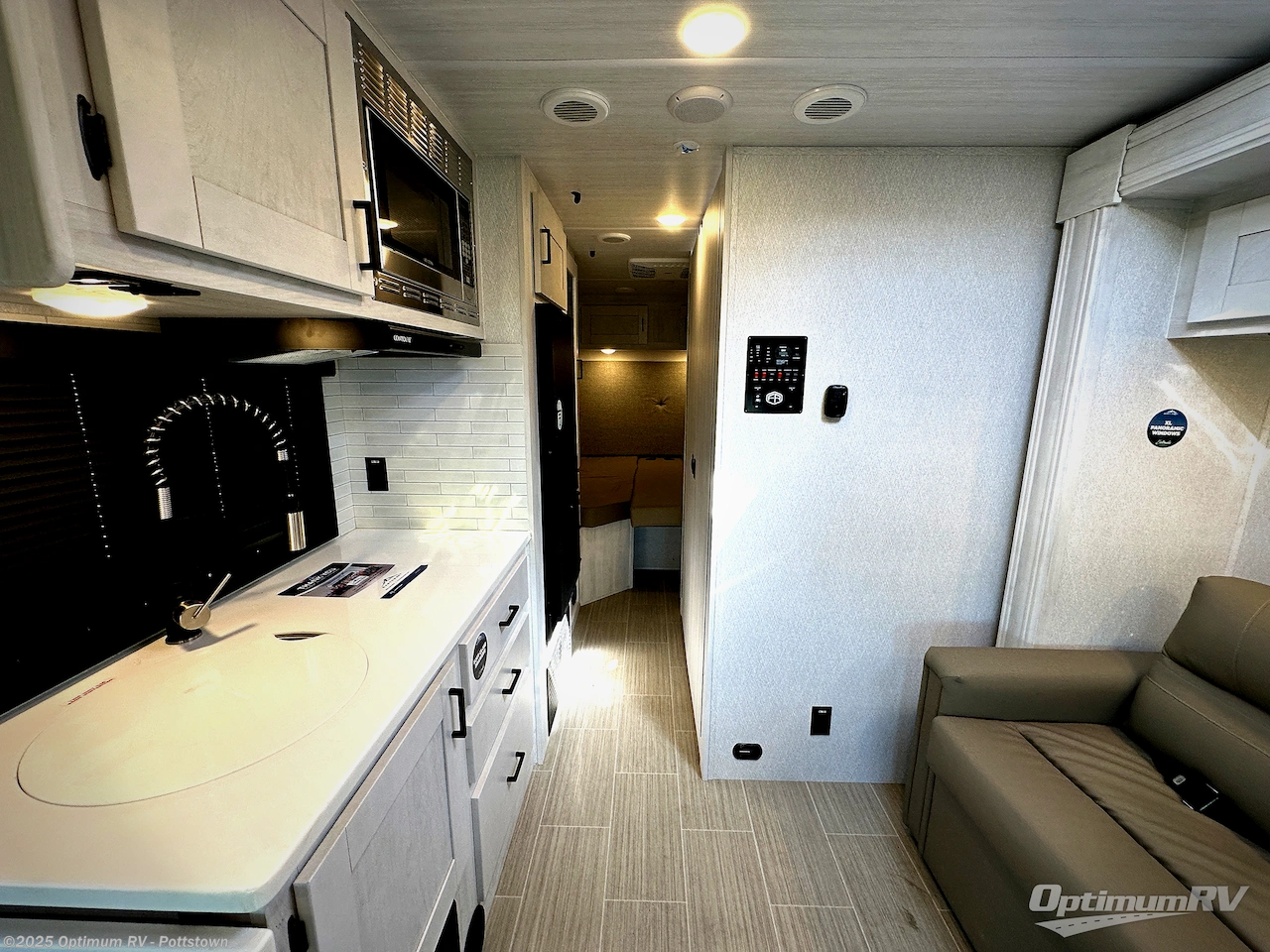 Whether you are traveling to your favorite campground or across the country, you are going to love this motorhome. You will have versatility in this coach to travel with a friend or your sweetheart with two twin beds that can easily convert to a king bed if you like. Each bed is 36" x 73" with a nightstand between and overhead storage along both sides and across the rear of the unit providing plenty of space for your things. There is also a wardrobe off the foot of the twin that is on the curbside. For relaxing and dining a slide out sofa with removeable table, and more overhead storage here. The kitchen is opposite the slide on the door side and features a round hidden sink with solid surface cover for added prep space, a 12-volt 6 cu. ft. refrigerator for your perishables, and a microwave oven and induction cooktop for easy meals as you travel. When you want to get cleaned up, a bath with an angled shower, toilet, and sink, plus medicine cabinet for your toothbrush and razor. The doors both open out so you can actually create a more open space when in the bathroom making it the width of the unit.
