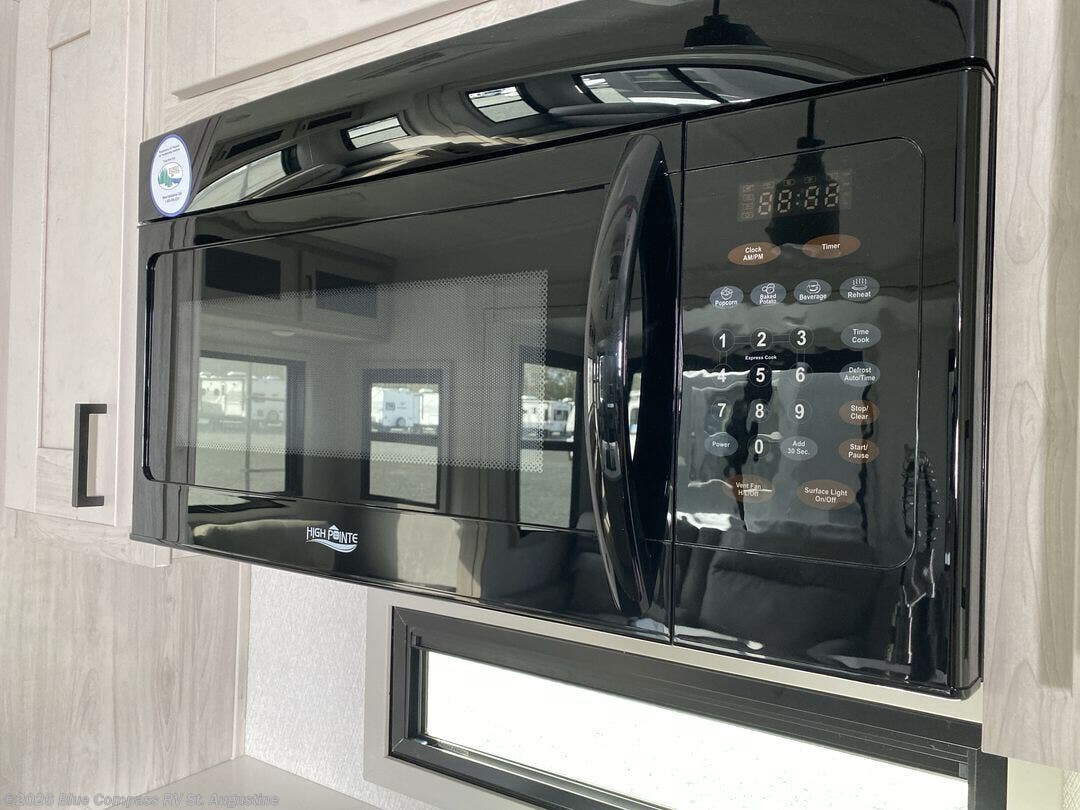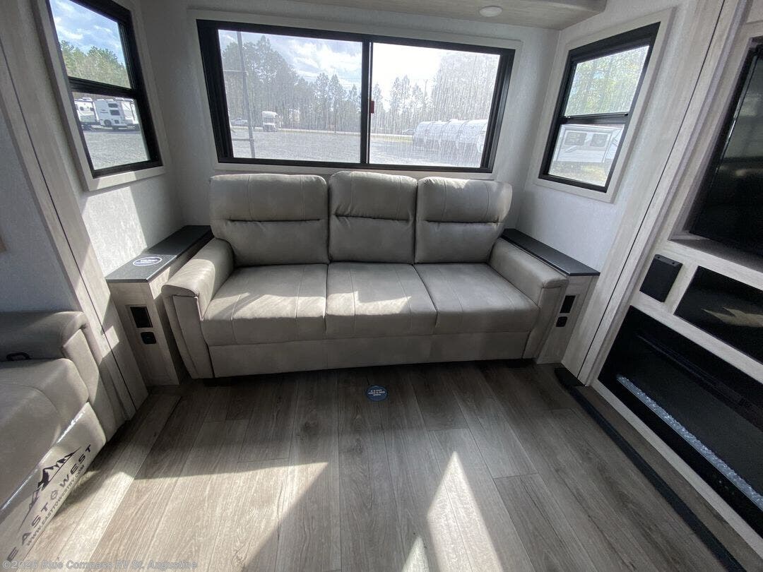It will be so easy to relax in this triple slide out fifth wheel with elegant interior features! When you arrive at your destination, you can set up the two power awnings with LED lights, grab your fishing poles from the oversized pass-through storage, then head down to the lake. The spacious full bath with a shower skylight will let you freshen up when you return, and there is a full kitchen waiting for you to start dinner. Here, you'll find a 30" over-the-range microwave, a 21" oven and range, plus a 16 cu. ft. 12V refrigerator for cold items. The chef of your group will love the kitchen island with countertop extensions for more prep space, and the double door pantry and coat closet provides ample storage space for necessities. Your crew can relax on the rear sofa or theater seating across from the fireplace and 50" TV, and there is a free-standing dinette with a storage ottoman for games! You will feel right at home in the front master bedroom with its king bed slide out and full-length wardrobe with washer and dryer prep, while your guests sleep on the sofa in the rear living area!