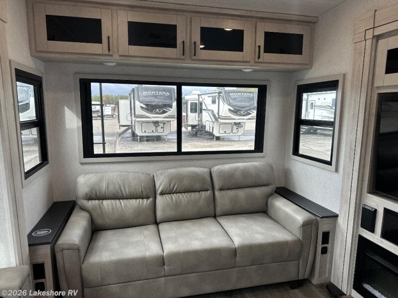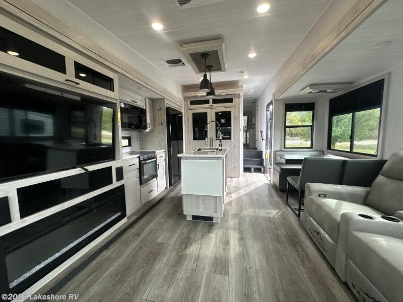 It will be so easy to relax in this triple slide out fifth wheel with elegant interior features! When you arrive at your destination, you can set up the two power awnings with LED lights, grab your fishing poles from the oversized pass-through storage, then head down to the lake. The spacious full bath with a shower skylight will let you freshen up when you return, and there is a full kitchen waiting for you to start dinner. Here, you'll find a 30" over-the-range microwave, a 21" oven and range, plus a 16 cu. ft. 12V refrigerator for cold items. The chef of your group will love the kitchen island with countertop extensions for more prep space, and the double door pantry and coat closet provides ample storage space for necessities. Your crew can relax on the rear sofa or theater seating across from the fireplace and 50" TV, and there is a free-standing dinette with a storage ottoman for games! You will feel right at home in the front master bedroom with its king bed slide out and full-length wardrobe with washer and dryer prep, while your guests sleep on the sofa in the rear living area!