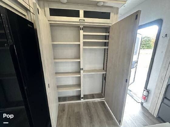 The Galley is equipped with residential-grade appliances, including a microwave over a range hood vent/fan above the 3-burner cooktop with a glass cooktop cover, and a conventional gas oven below. The kitchen Island has a large stainless steel farm-style kitchen sink with a drainboard cover and a gooseneck faucet. The refrigerator is a two-door residential side-by-side unit with a large freezer compartment. The pantry is a double-door, lighted storage area that allows you to easily entertain while keeping all your food items stored and out of the way.