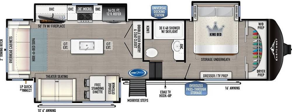 Outside, the two power patio awnings allow you to extend the fun outdoors, making this a great RV for tailgating at your favorite teams' events. The large exterior storage compartments, with one that extends across the entire unit, provide ample exterior storage space and offer access to two exterior showers (one on each side of the unit) and the full water system control panel located on the driver's side of the large pass-through storage area.