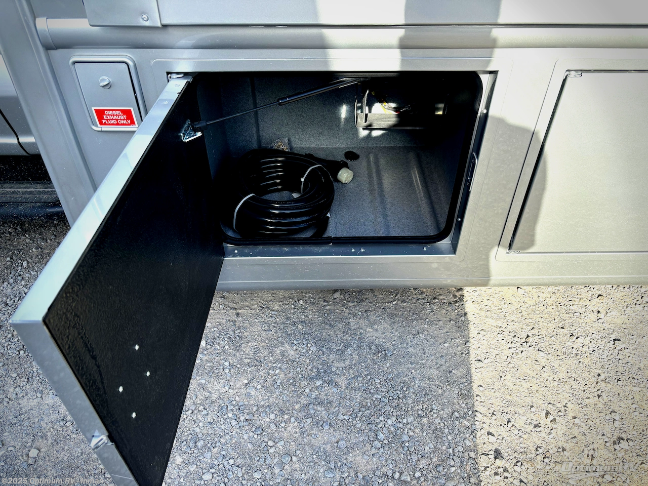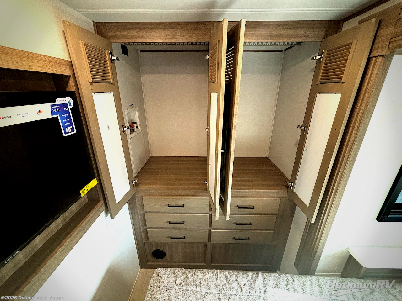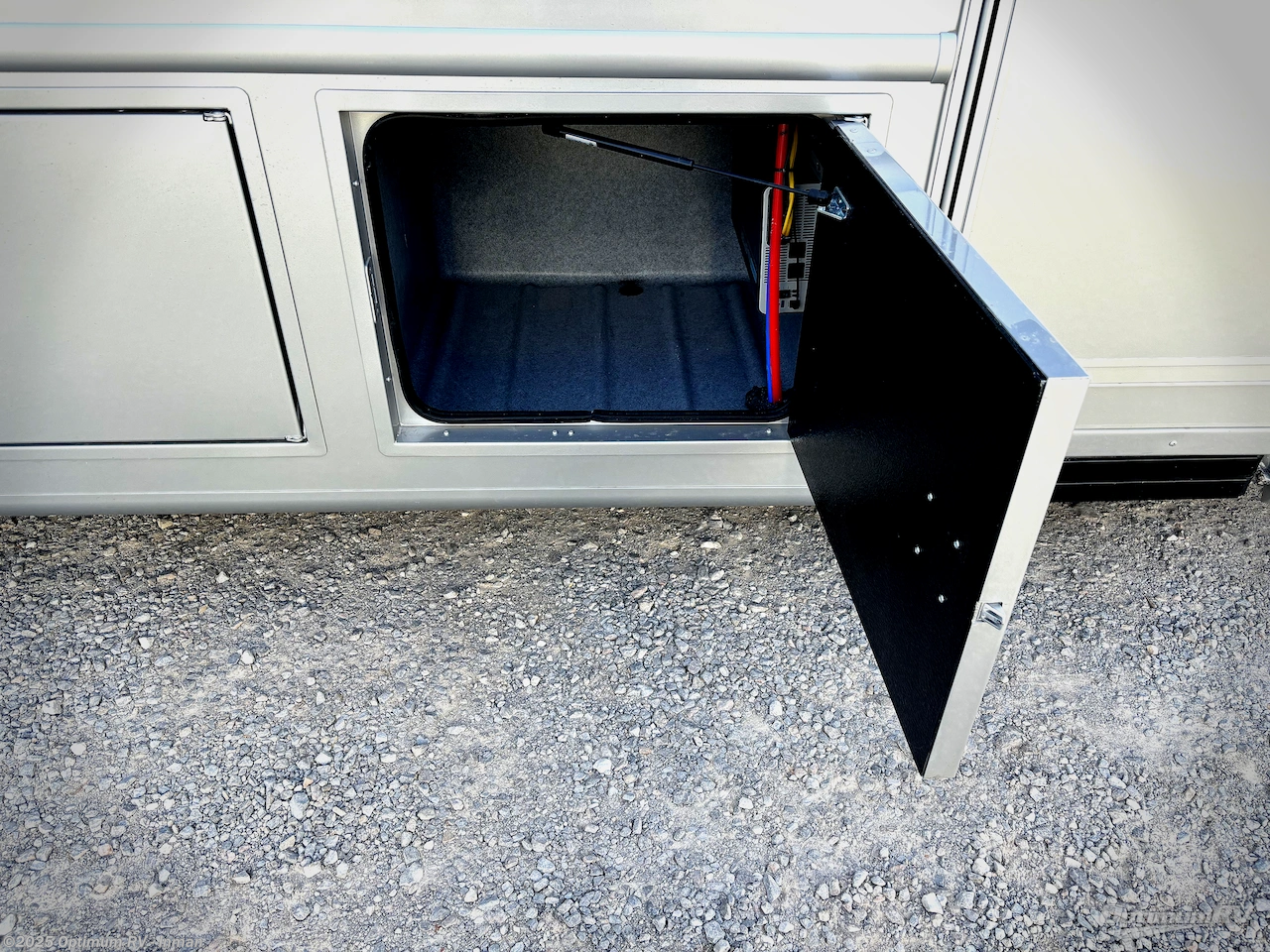 Traveling in this coach is sure to bring great memories! Once you arrive at your destination, you can make lunch in the full kitchen, and there is a large 16 cu. ft. 12V refrigerator and pantry for food storage. The booth dinette and power theater seat will provide a place to relax, and the 40" TV will keep you entertained on rainy days. The rear corner bedroom features a queen bed slide out, an overhead cabinet, wardrobe, plus washer and dryer prep if you choose to add those appliances. And the full bath is found in the opposite rear corner where you'll find a spacious shower, toilet, and nice-sized vanity to easily get ready each morning.