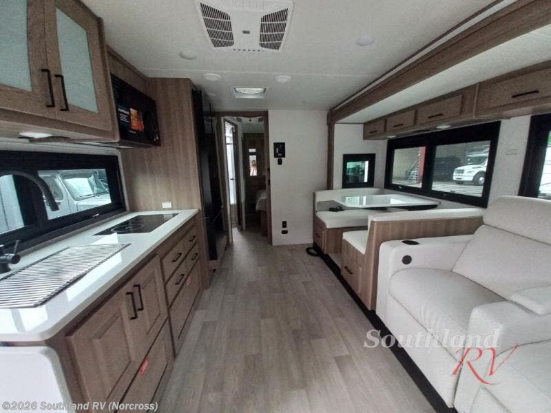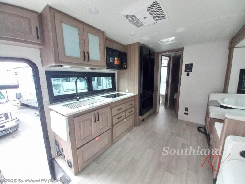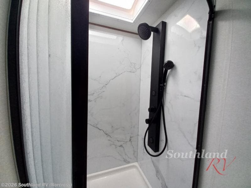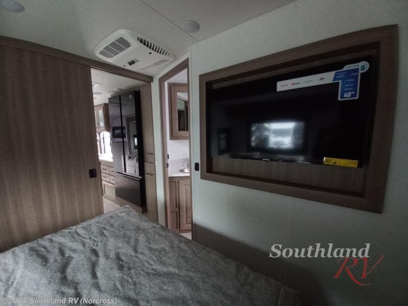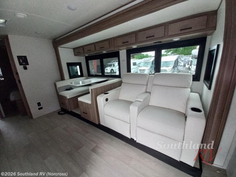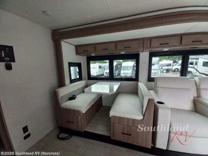Traveling in this coach is sure to bring great memories! Once you arrive at your destination, you can make lunch in the full kitchen, and there is a large 16 cu. ft. 12V refrigerator and pantry for food storage. The booth dinette and power theater seat will provide a place to relax, and the 40" TV will keep you entertained on rainy days. The rear corner bedroom features a queen bed slide out, an overhead cabinet, wardrobe, plus washer and dryer prep if you choose to add those appliances. And the full bath is found in the opposite rear corner where you'll find a spacious shower, toilet, and nice-sized vanity to easily get ready each morning.