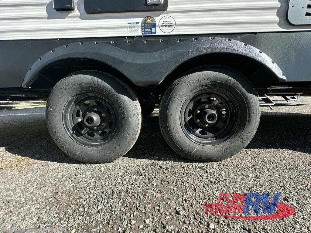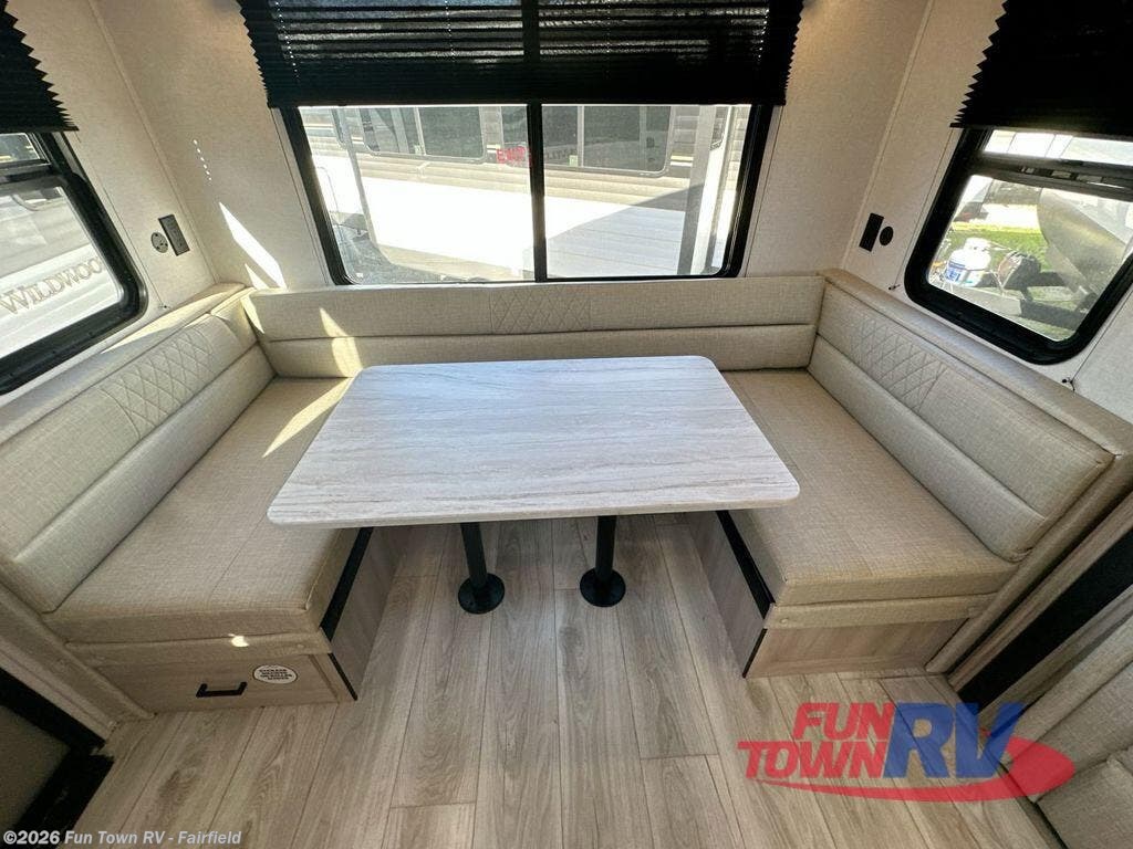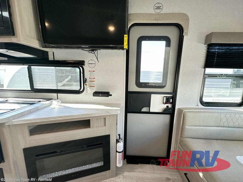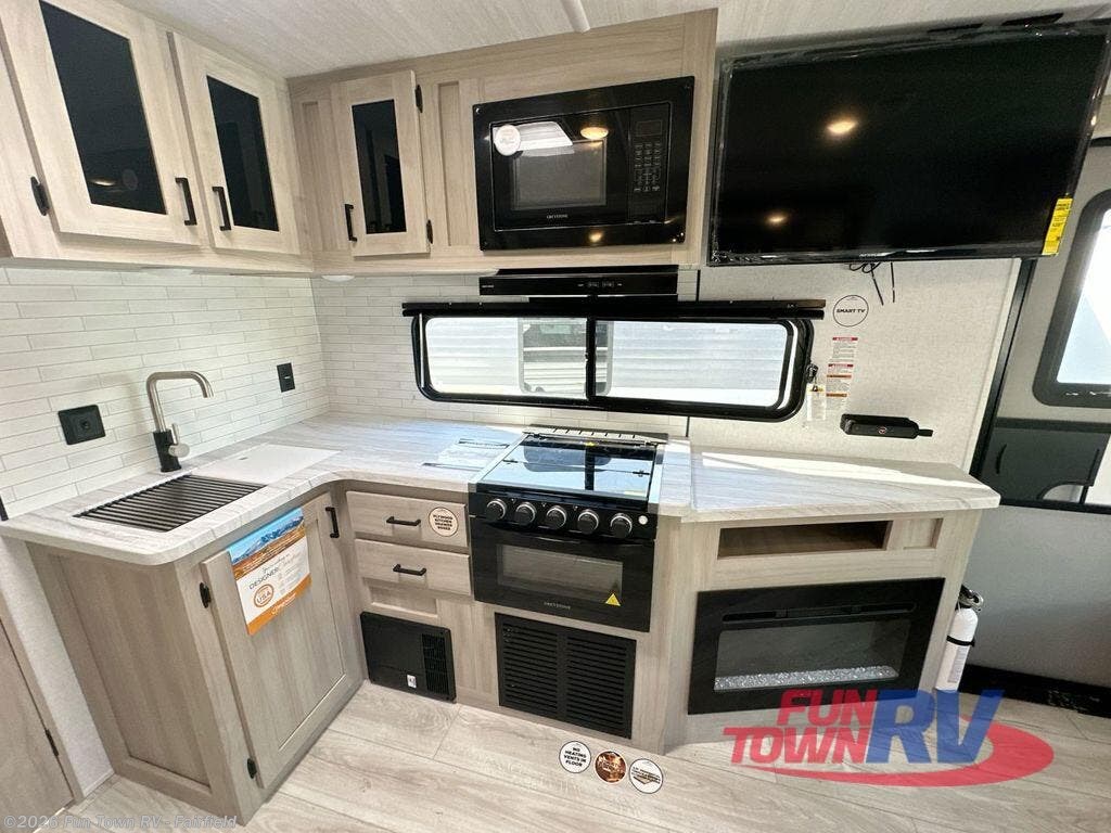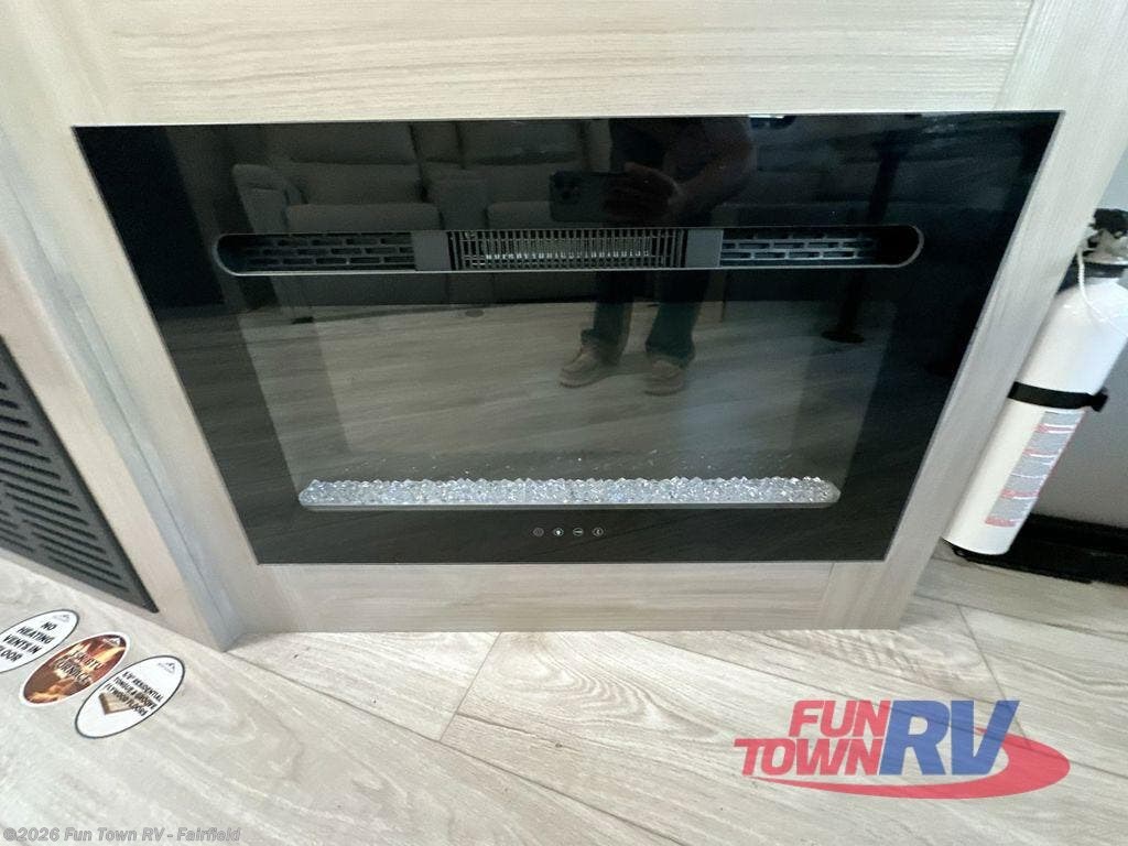 When you are wanting a little more interior space in your next travel trailer, take a look inside! This large slide out widens the main living space so you can easily make meals using full amenities without having to move for someone walking from the front bedroom and walk-through bath to the u-shaped dinette in the back. For sleeping, there is a king-size bed with storage on both sides at the very front of this unit giving you privacy from the rest, and even a private second entry/exit door from within the bedroom. You will find storage beneath the bed for larger items or extra blankets, plus a space saving sliding door. The U-shaped dinette and jack knife sofa offer comfortable seating as well as extra sleeping space for overnight guests, and the fireplace is just a nice feature to enjoy. On the outside, an 18' awning provides a large outdoor living area protected from the elements, and the oversized pass-through will house all of your exterior gear like lawn chairs, outdoor games and rugs, plus so much more!
