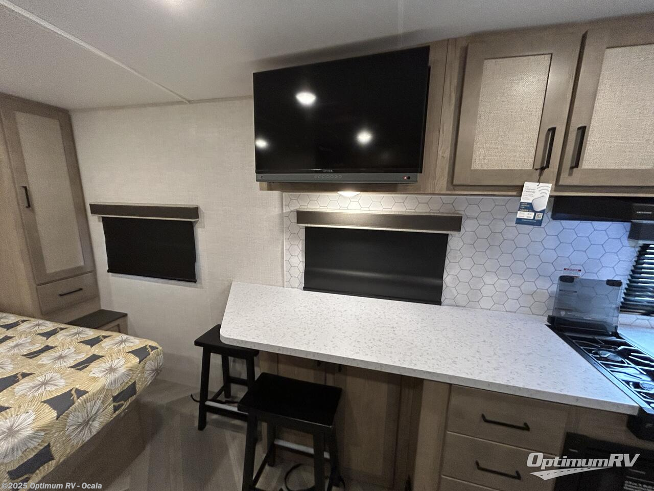 Camping trips just got sweeter in this single slide out travel trailer that will sleep two each night! There is a front queen bed with dual wardrobes and nightstands to keep your things tidy, plus a privacy curtain at the foot of the bed if you have someone staying over on an air mattress. You can relax on the theater seating slide out that also includes a wardrobe/pantry here for snacks or paper products. The kitchen with a dual burner cooktop and air fryer convection microwave will let you make meals each day, and the 10 cu. ft. 12V refrigerator will be perfect for your perishables. This unit also includes a breakfast bar/desktop area with two bar stools where you can dine or work from home. And of course there is a full bath on board so you can clean up after a day outdoors!