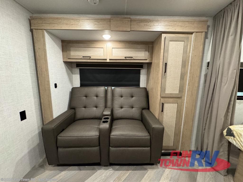 Camping trips just got sweeter in this single slide out travel trailer that will sleep two each night! There is a front queen bed with dual wardrobes and nightstands to keep your things tidy, plus a privacy curtain at the foot of the bed if you have someone staying over on an air mattress. You can relax on the theater seating slide out that also includes a wardrobe/pantry here for snacks or paper products. The kitchen with a dual burner cooktop and air fryer convection microwave will let you make meals each day, and the 10 cu. ft. 12V refrigerator will be perfect for your perishables. This unit also includes a breakfast bar/desktop area with two bar stools where you can dine or work from home. And of course there is a full bath on board so you can clean up after a day outdoors!