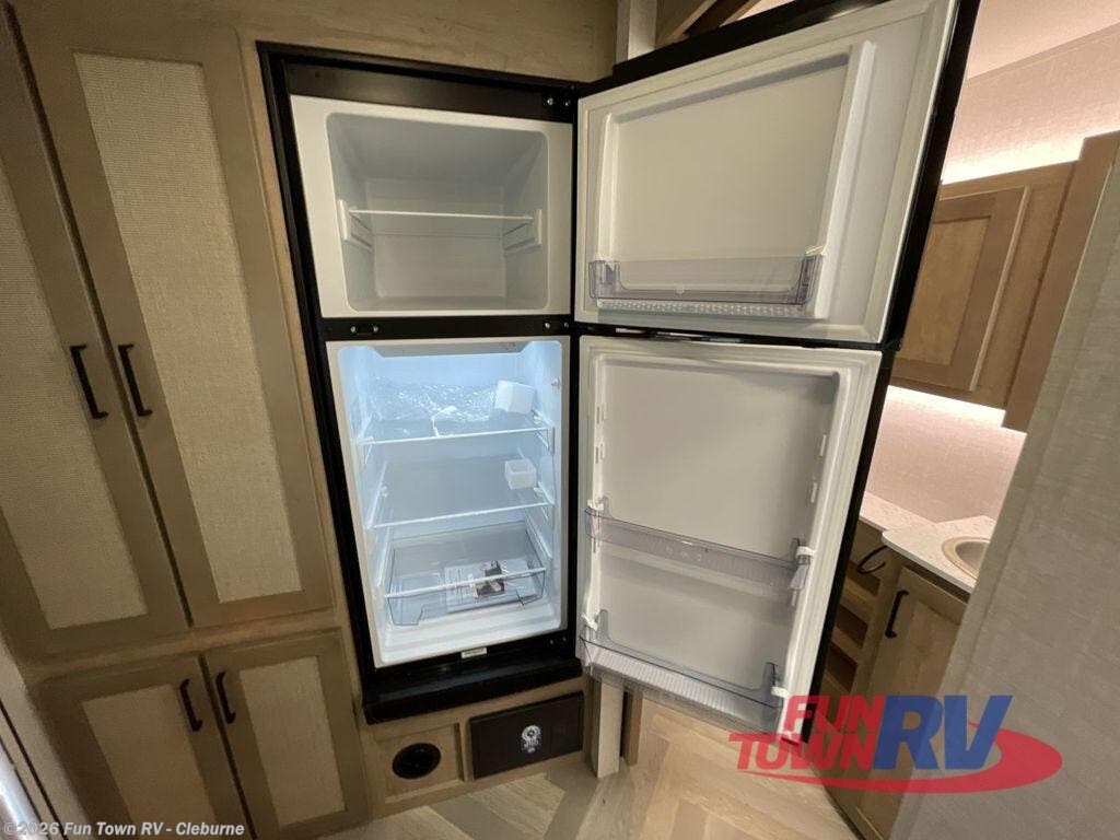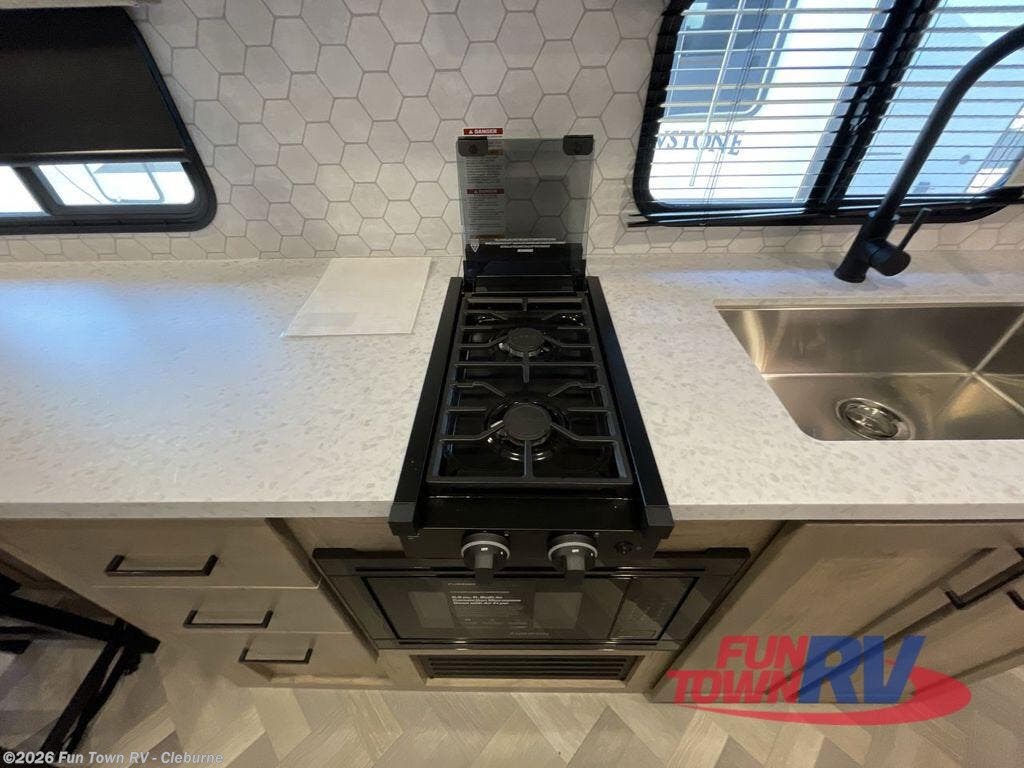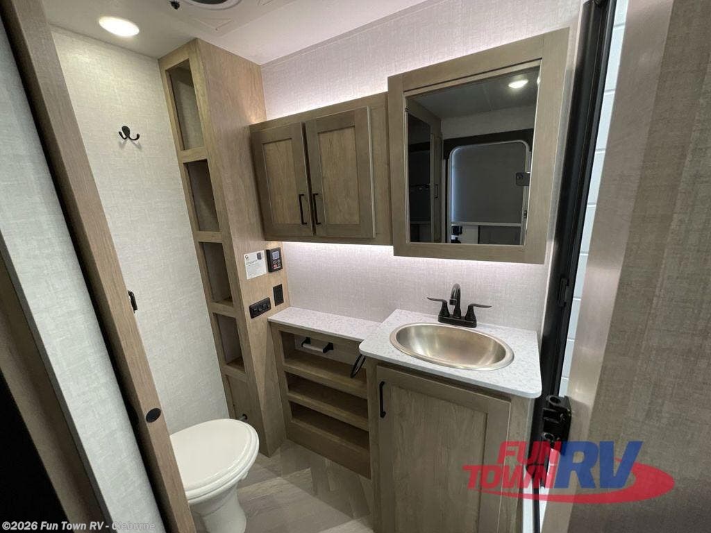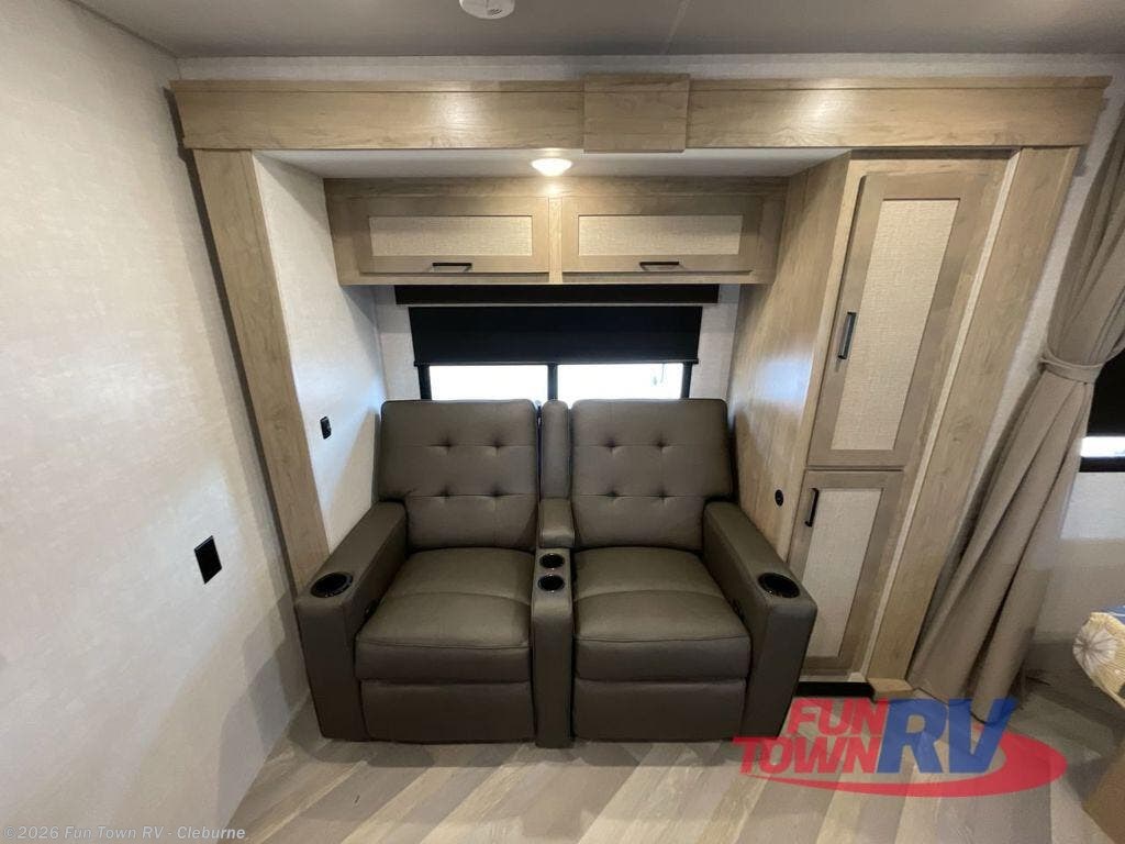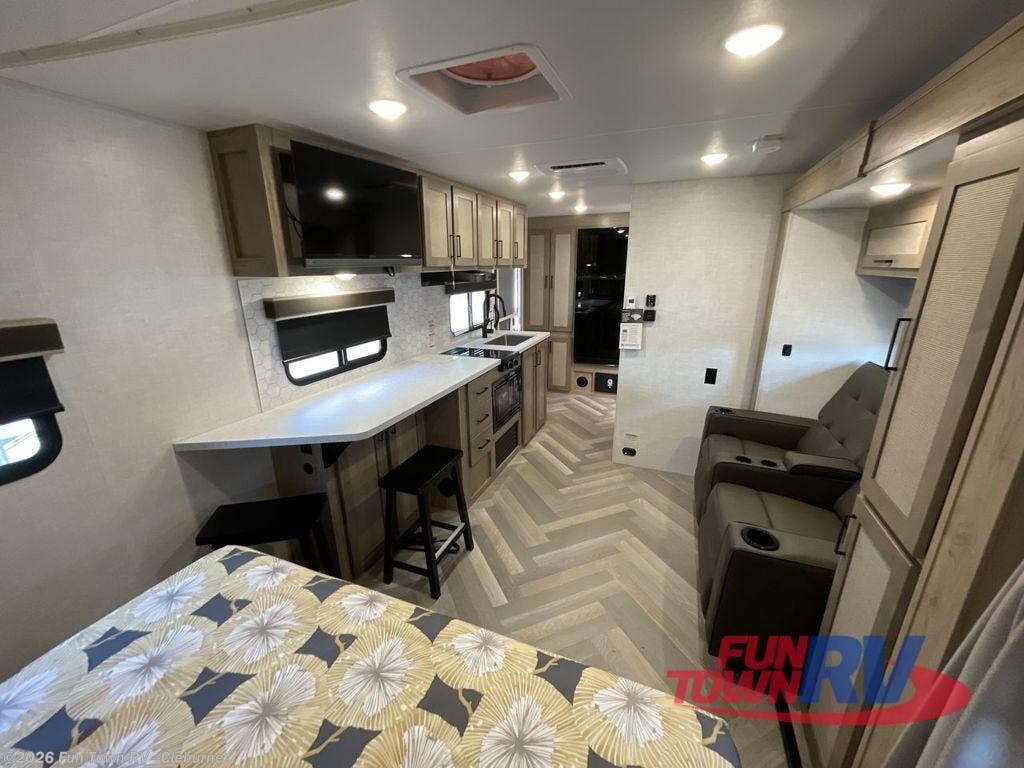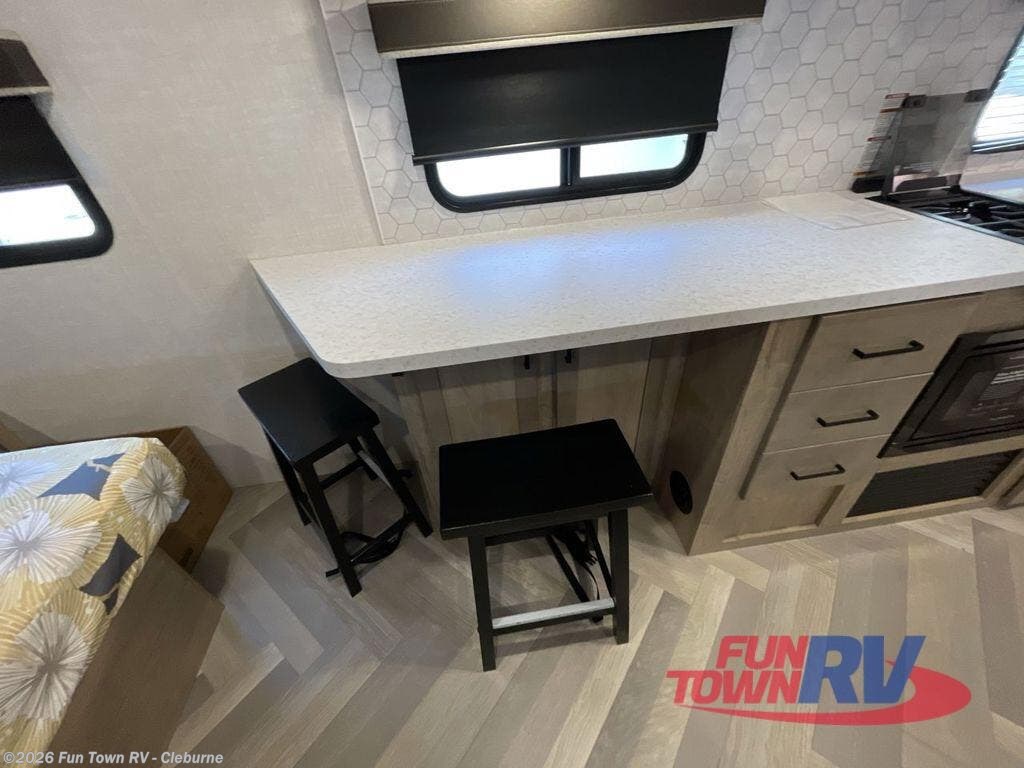 Camping trips just got sweeter in this single slide out travel trailer that will sleep two each night! There is a front queen bed with dual wardrobes and nightstands to keep your things tidy, plus a privacy curtain at the foot of the bed if you have someone staying over on an air mattress. You can relax on the theater seating slide out that also includes a wardrobe/pantry here for snacks or paper products. The kitchen with a dual burner cooktop and air fryer convection microwave will let you make meals each day, and the 10 cu. ft. 12V refrigerator will be perfect for your perishables. This unit also includes a breakfast bar/desktop area with two bar stools where you can dine or work from home. And of course there is a full bath on board so you can clean up after a day outdoors!