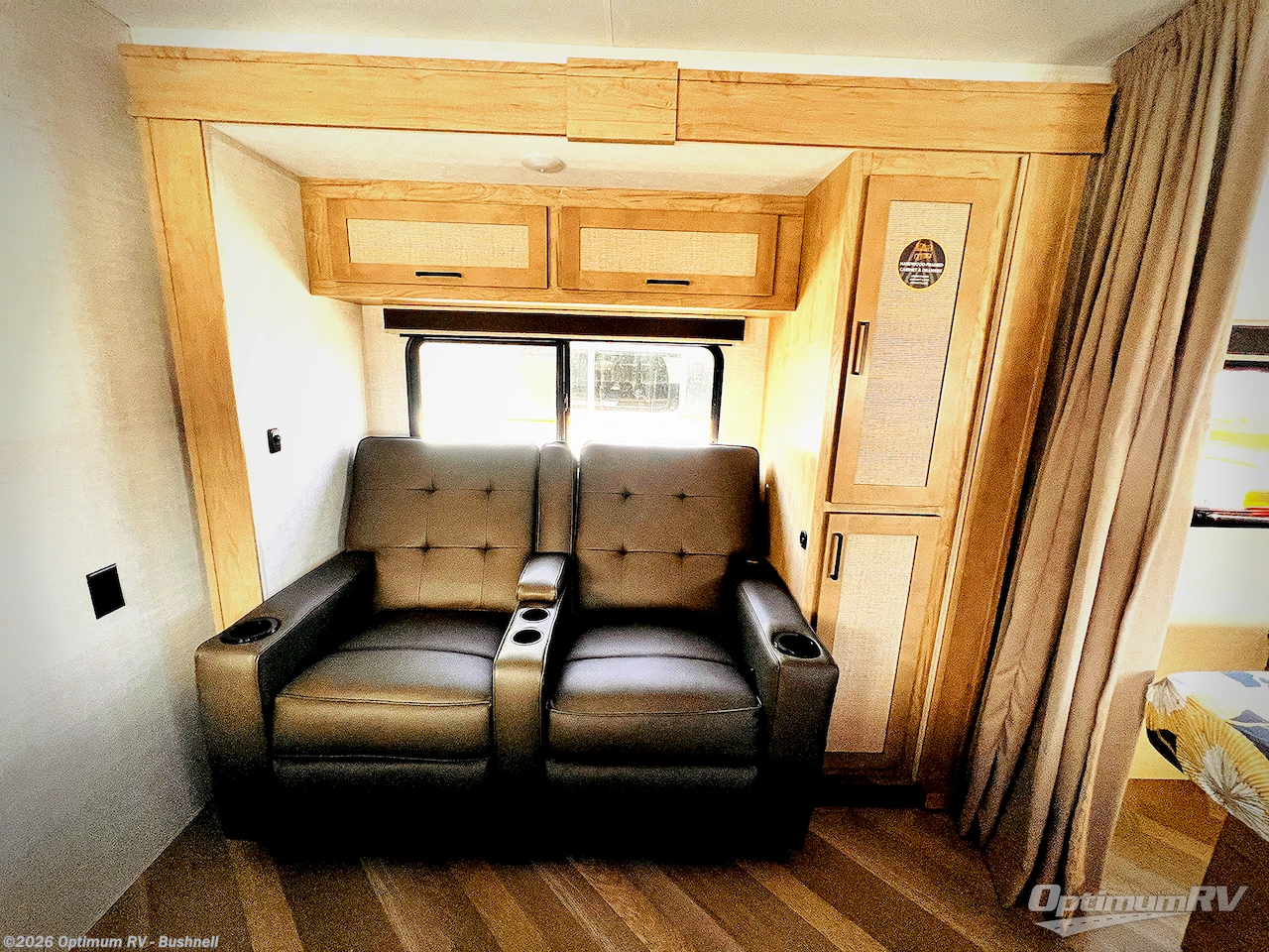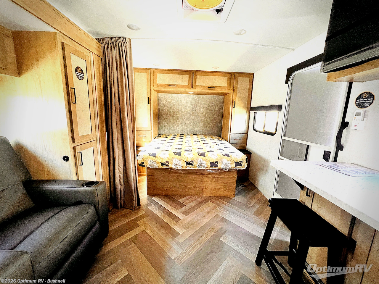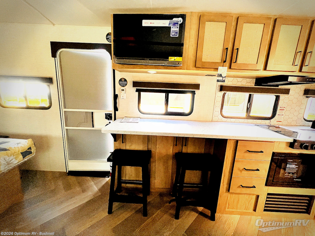 Camping trips just got sweeter in this single slide out travel trailer that will sleep two each night! There is a front queen bed with dual wardrobes and nightstands to keep your things tidy, plus a privacy curtain at the foot of the bed if you have someone staying over on an air mattress. You can relax on the theater seating slide out that also includes a wardrobe/pantry here for snacks or paper products. The kitchen with a dual burner cooktop and air fryer convection microwave will let you make meals each day, and the 10 cu. ft. 12V refrigerator will be perfect for your perishables. This unit also includes a breakfast bar/desktop area with two bar stools where you can dine or work from home. And of course there is a full bath on board so you can clean up after a day outdoors!